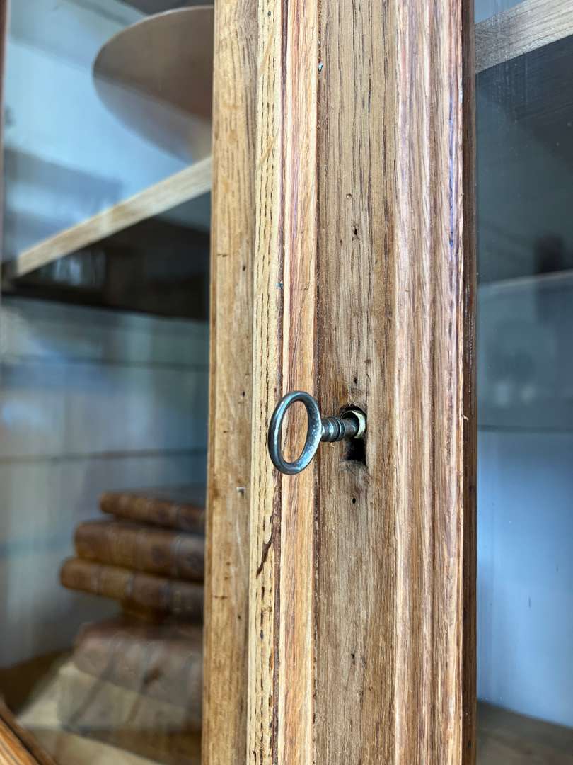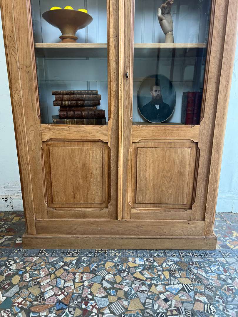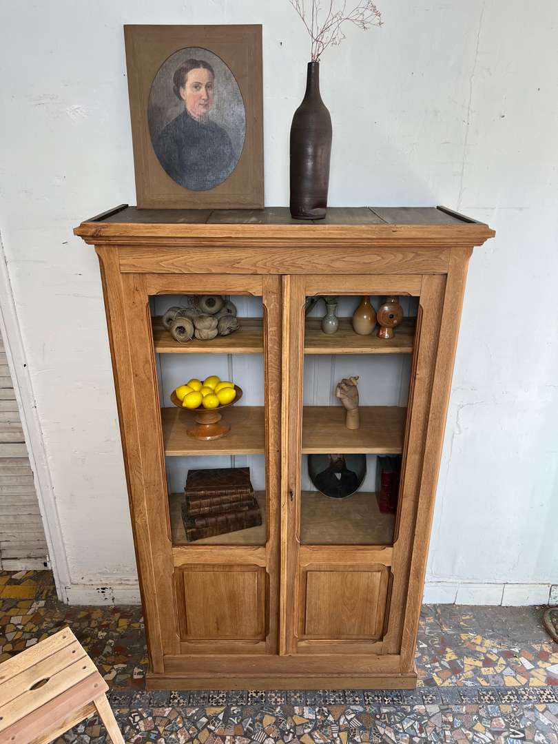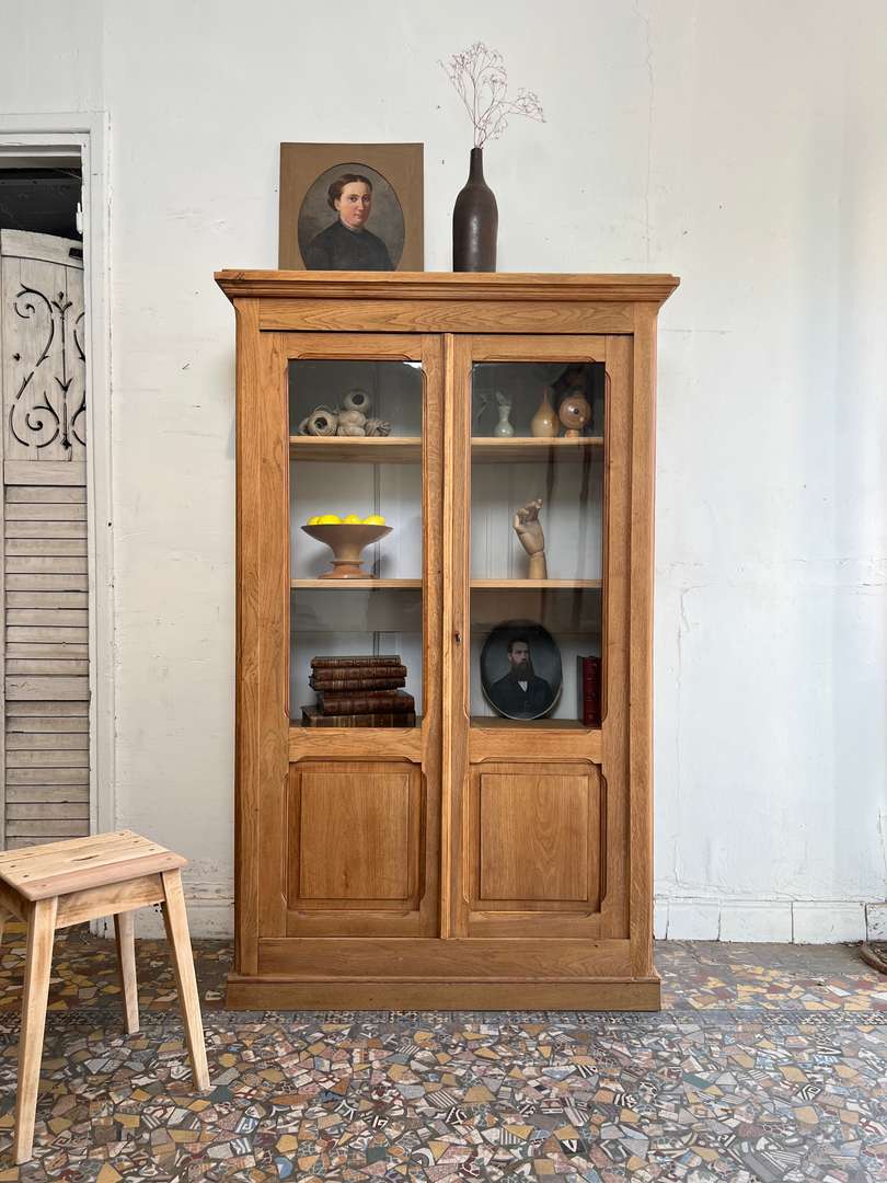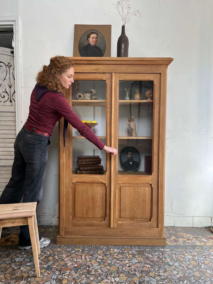 Belle vitrine ancienne en chêne, avec un extérieur laissé brut et un intérieur peint en blanc. Les étagères sont modulables en hauteur, permettant d’adapter facilement l’aménagement selon les objets exposés. Un meuble élégant et lumineux, idéal pour ranger livres, vaisselle ou collections.