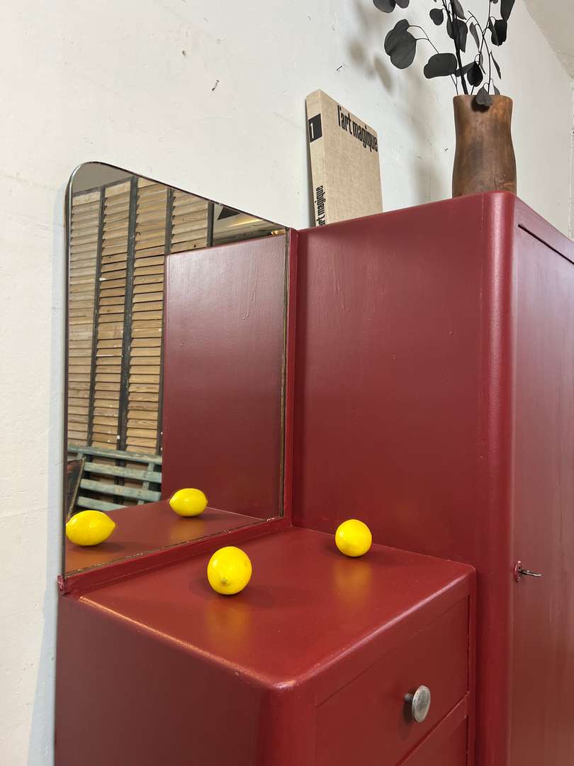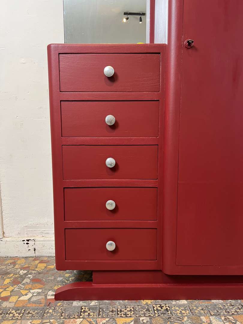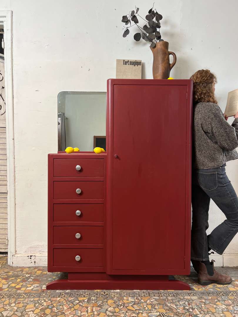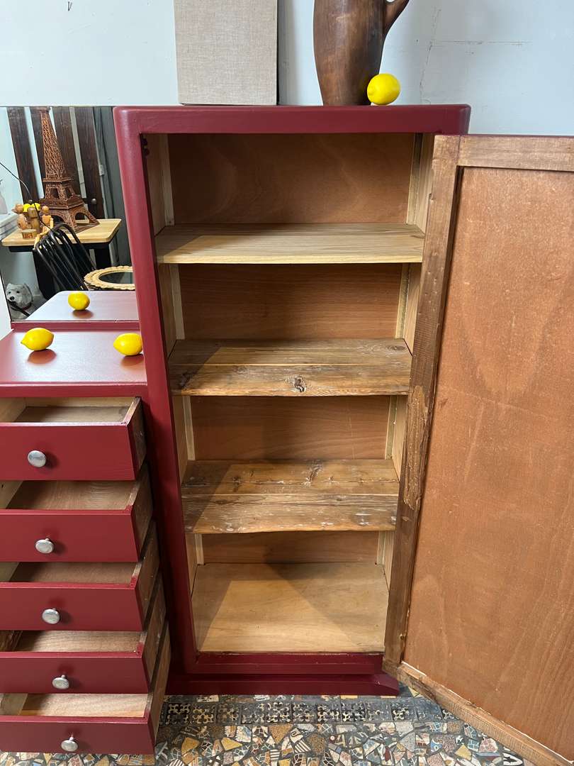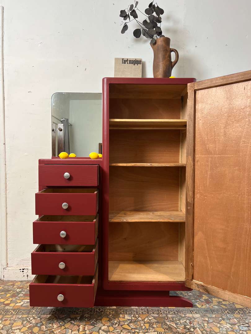 Ancienne armoire vintage peinte en bordeaux, avec une composition asymétrique : une colonne de tiroirs sur la gauche surmontée d’un miroir, et une grande porte à droite. L’intérieur est aménagé avec des étagères, et cette partie peut aussi être utilisée en penderie grâce à sa tringle. Un meuble pratique et décoratif, idéal pour une chambre ou une entrée.