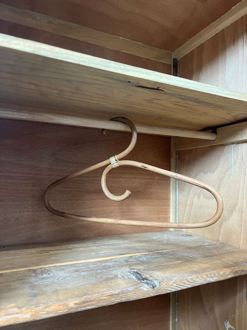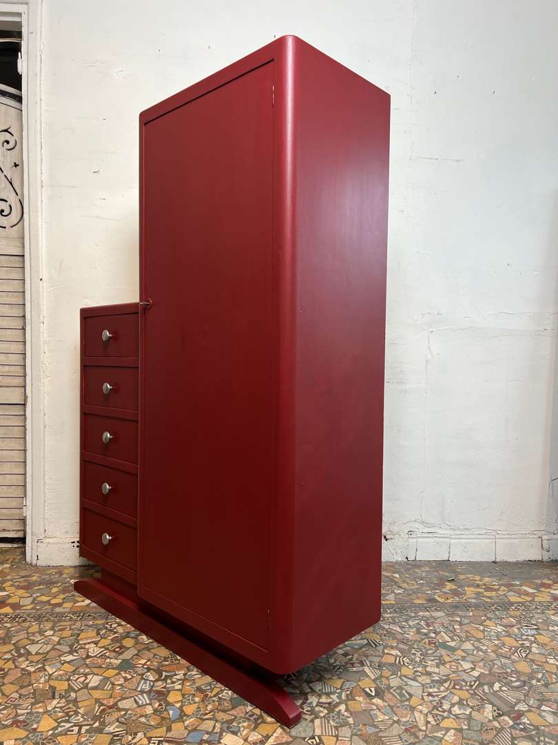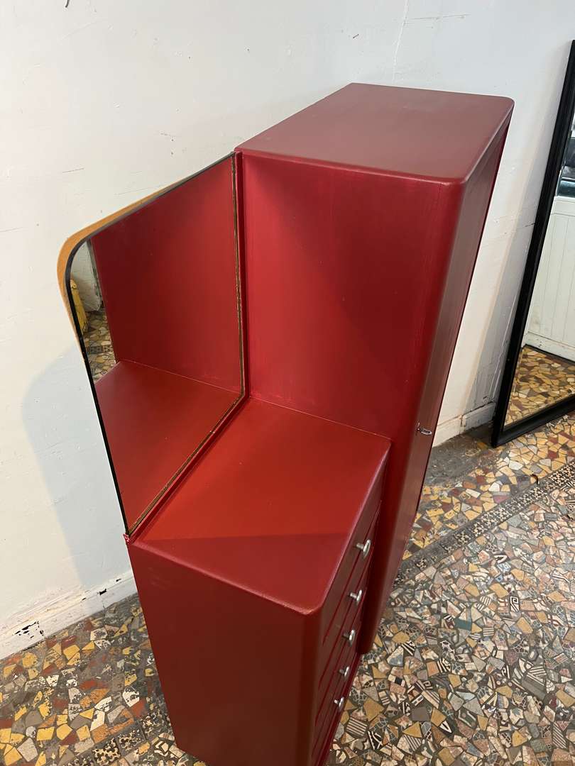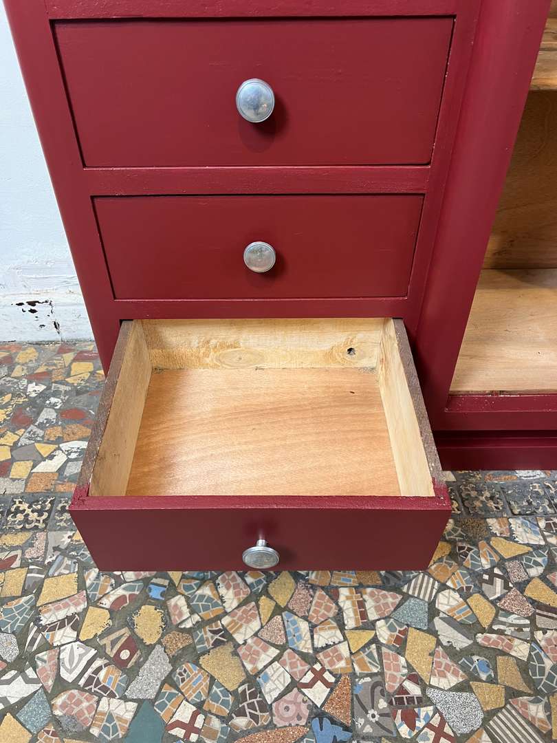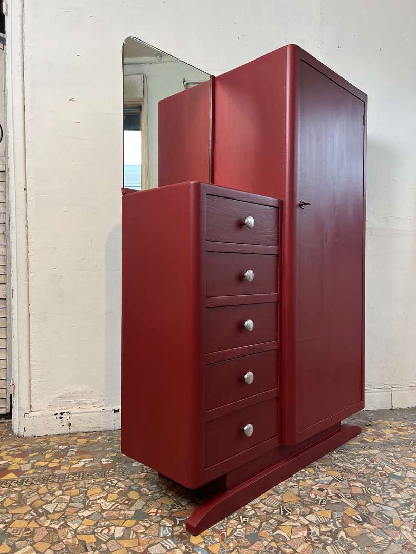 Ancienne armoire vintage peinte en bordeaux, avec une composition asymétrique : une colonne de tiroirs sur la gauche surmontée d’un miroir, et une grande porte à droite. L’intérieur est aménagé avec des étagères, et cette partie peut aussi être utilisée en penderie grâce à sa tringle. Un meuble pratique et décoratif, idéal pour une chambre ou une entrée.