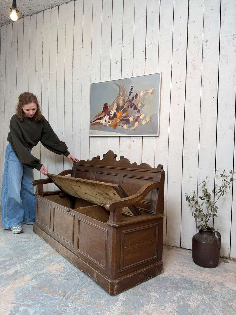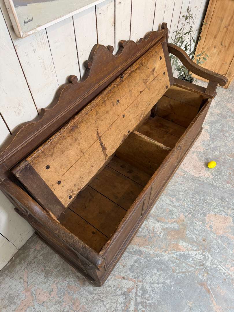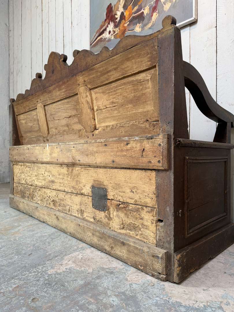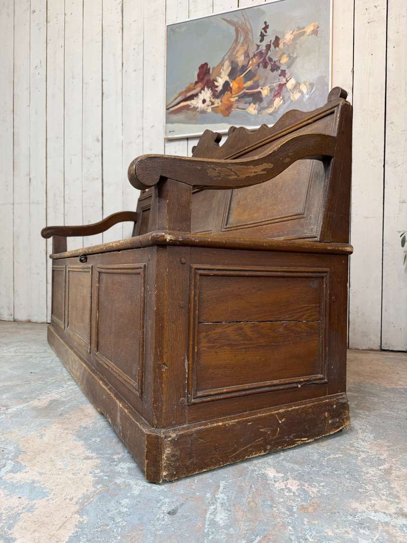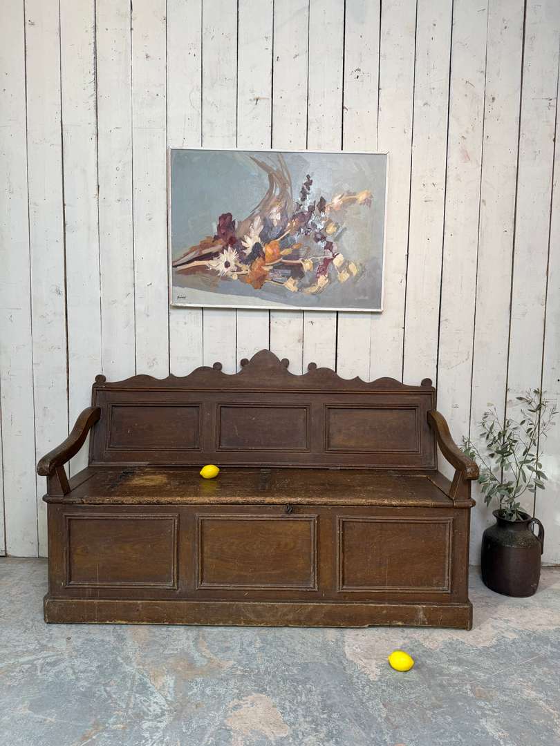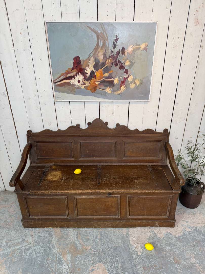 Beau modèle à panneaux moulurés, avec accotoirs et dossier travaillé. Il ouvre sur un grand espace de rangement.