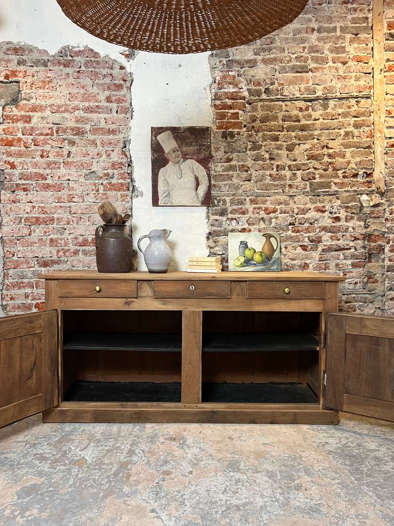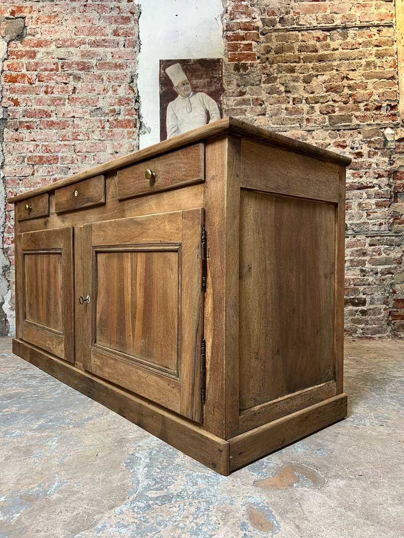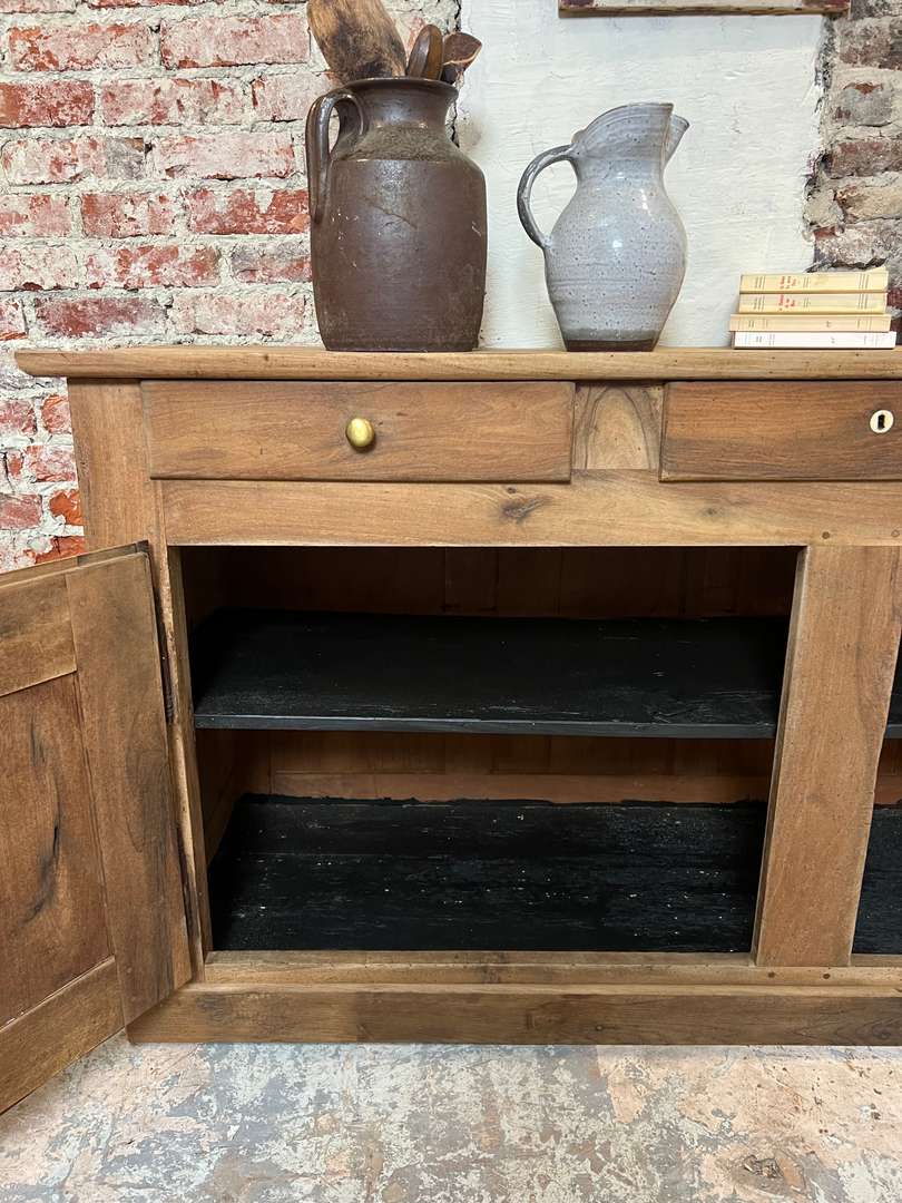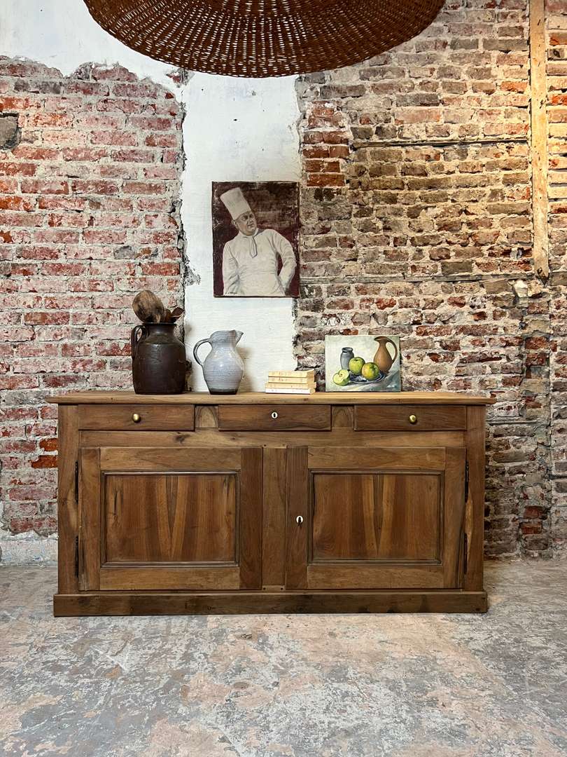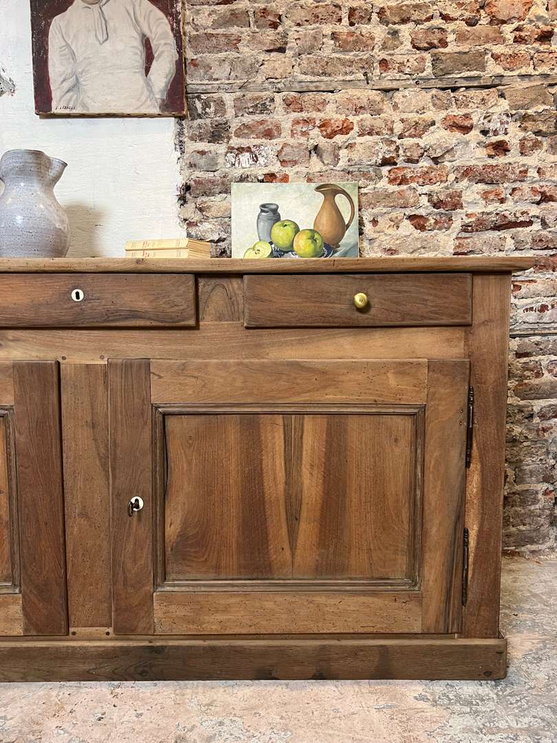 Cet ancien buffet en noyer du XIXᵉ présente une belle patine et des lignes simples. Il est équipé de boutons en laiton, d’une porte qui ferme à clé et de tiroirs montés en queue d’aronde. Un meuble solide et élégant, idéal pour une salle à manger ou un intérieur classique.