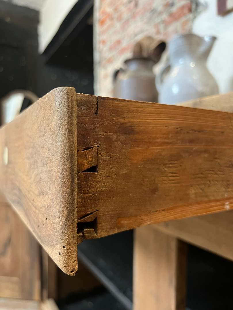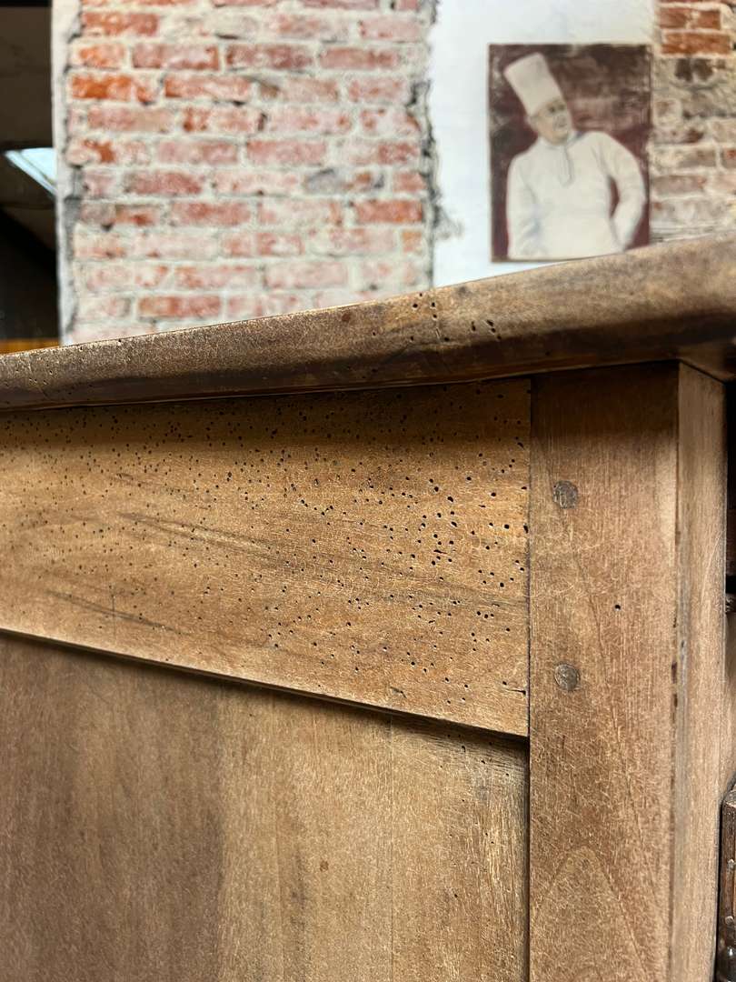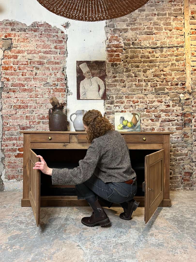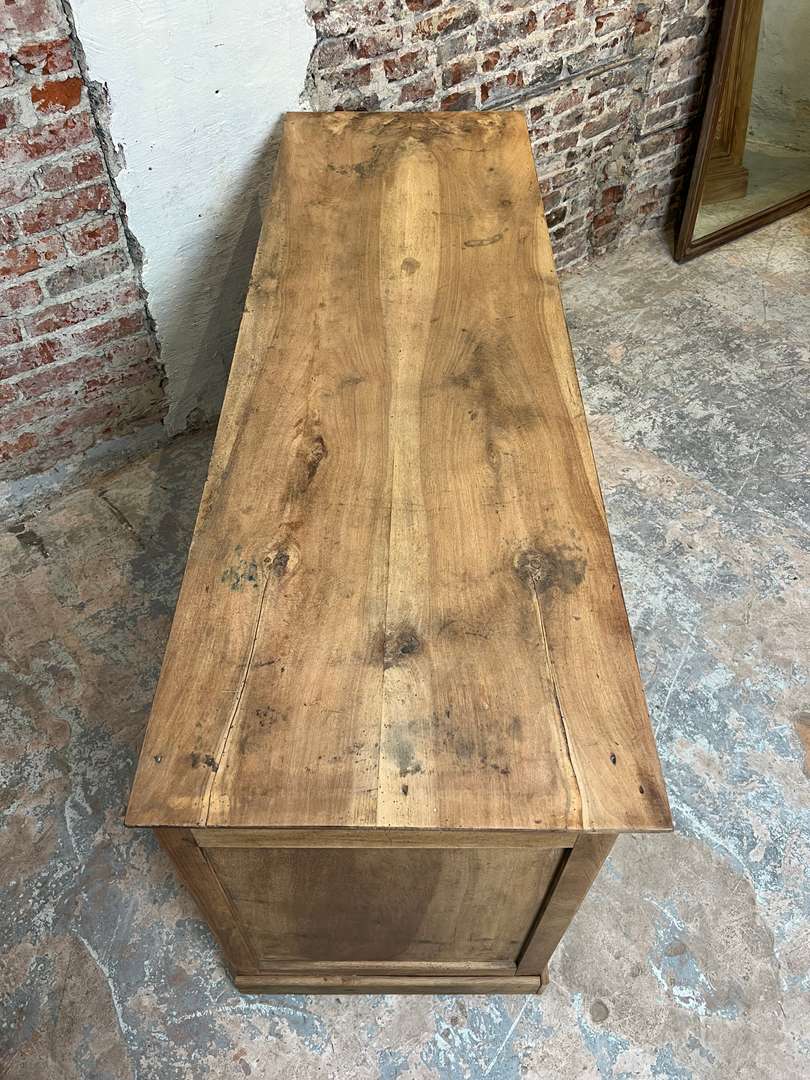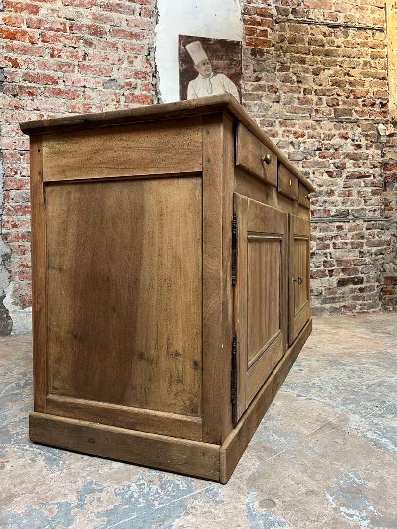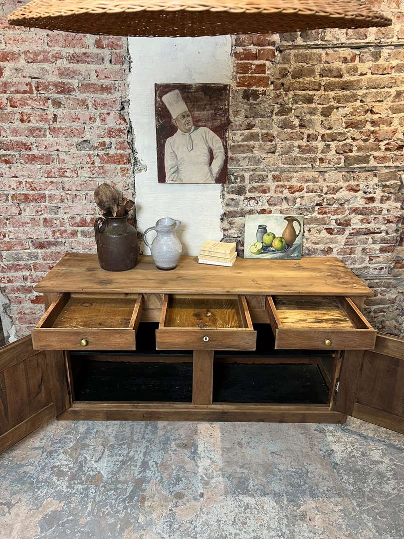 Cet ancien buffet en noyer du XIXᵉ présente une belle patine et des lignes simples. Il est équipé de boutons en laiton, d’une porte qui ferme à clé et de tiroirs montés en queue d’aronde. Un meuble solide et élégant, idéal pour une salle à manger ou un intérieur classique.