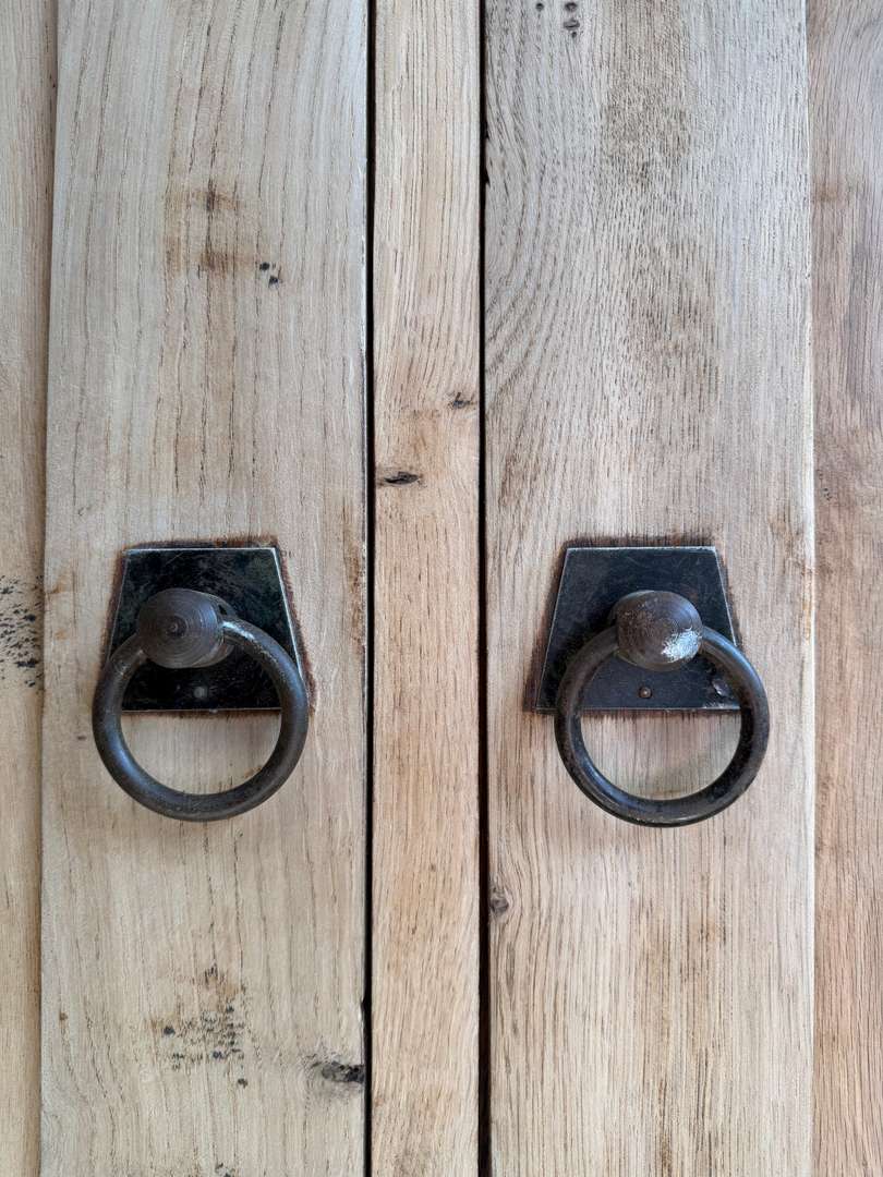 Quatre portes avec poignées en métal et système de fermeture en bois. Intérieur en sapin avec étagères.
