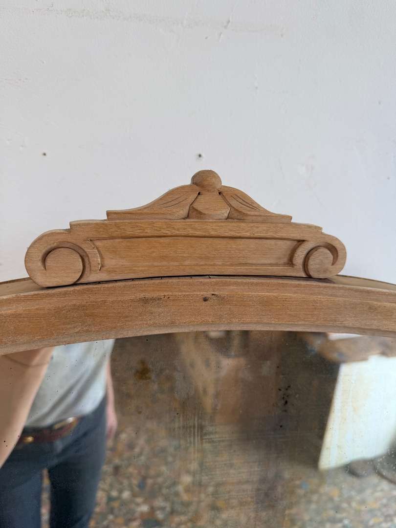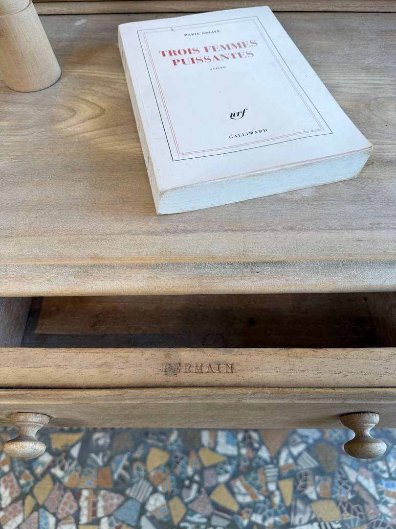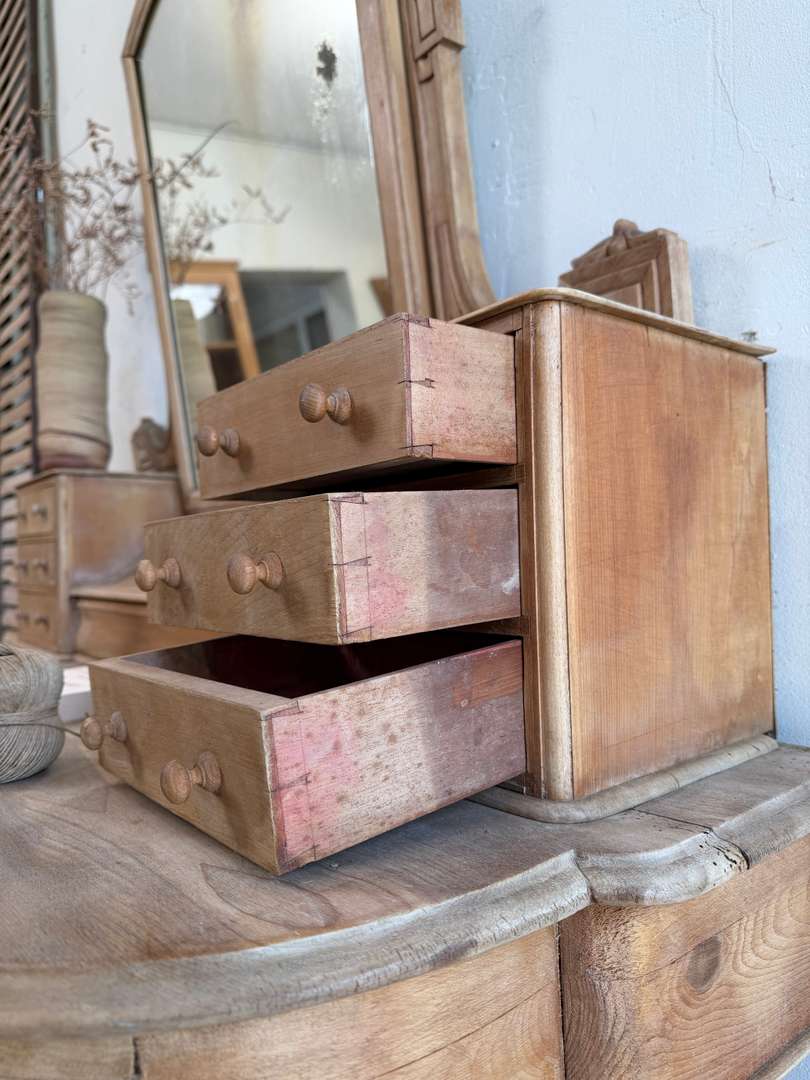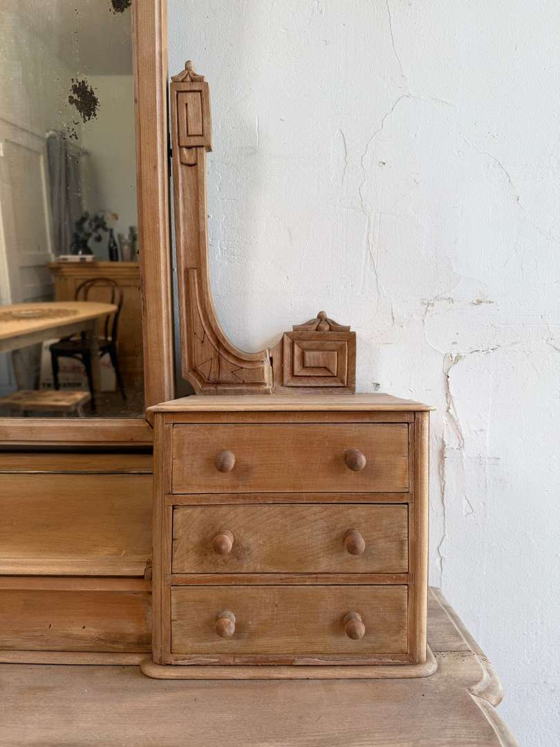 Tiroirs montés en queue d’aronde, avec le nom de l’artisan inscrit à l’intérieur. Miroir au teint légèrement fané, plein de charme.