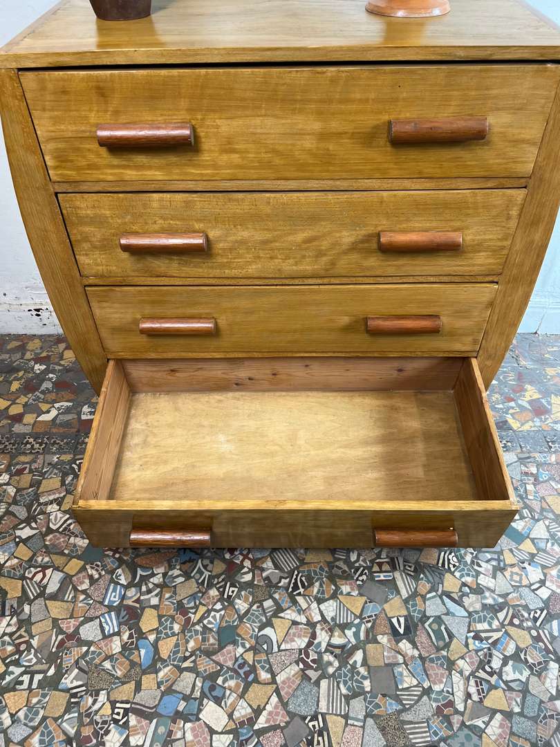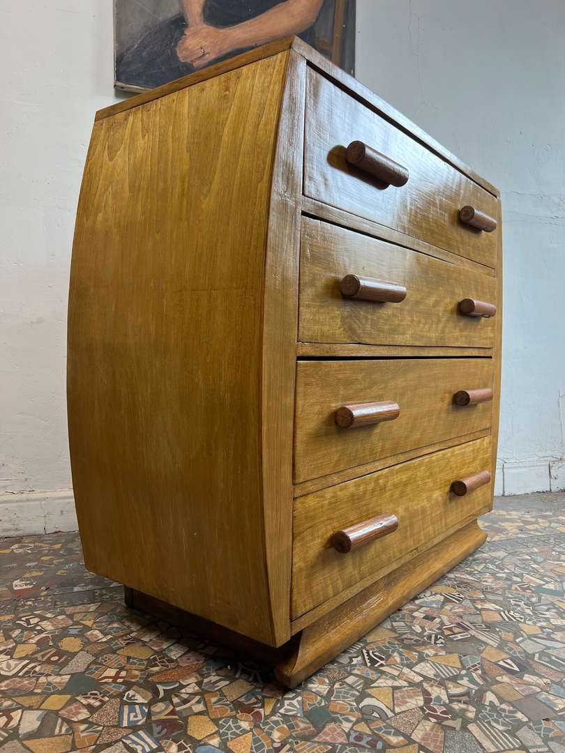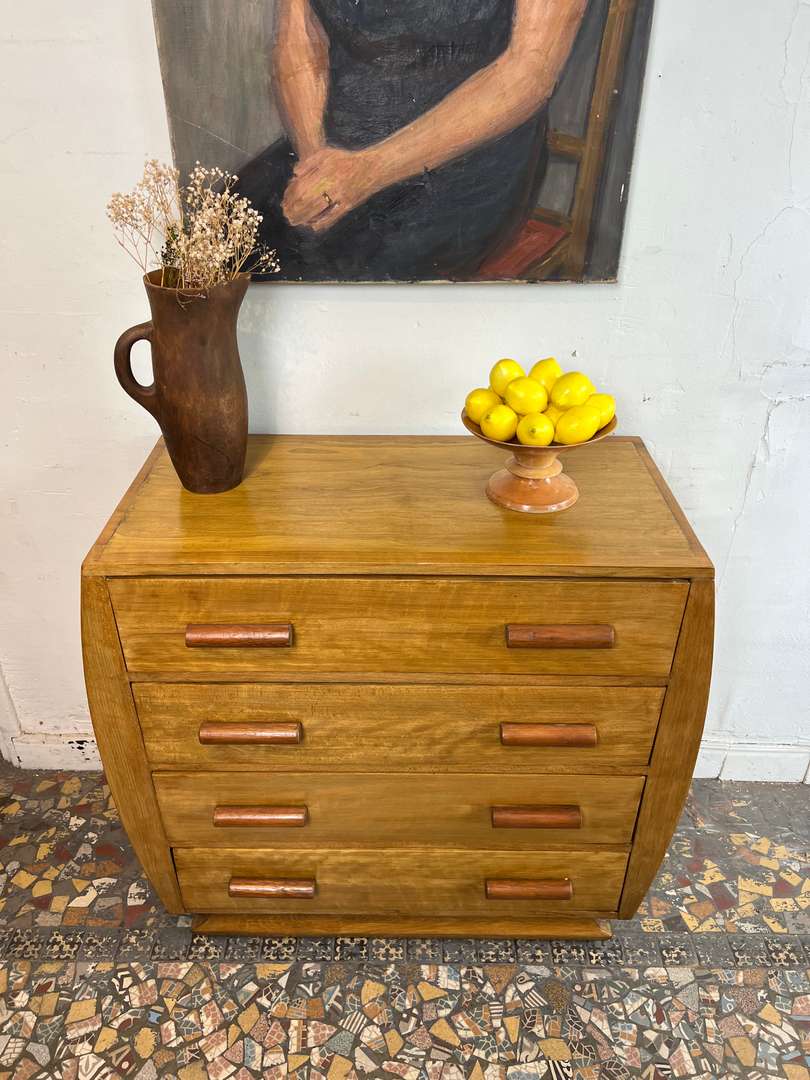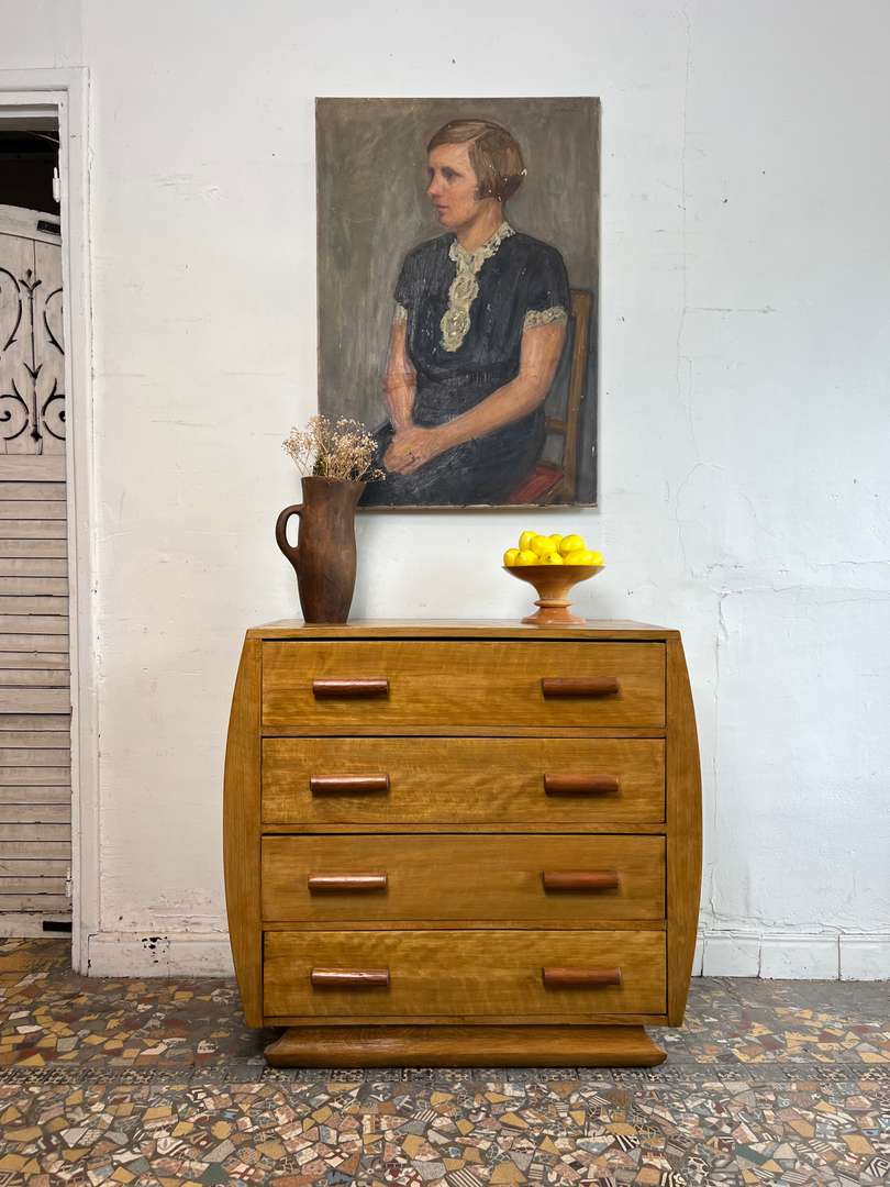 Commode Art DécoCe produit est venduAncienne commode Art Déco en bois clair, composée de quatre tiroirs. Sa forme galbée et ses larges poignées en bois lui donnent une allure géométrique et élégante, typique de cette période. #commodeancienne #artdeco #meublevintage #meubleancien #brocante #decoauthentique #decorationinterieurDimensionsLargeur99.5 cmProfondeur44 cmHauteur92 cmDimensions des tiroirs80 x 38 x 15 cmRenseignementsRéférence2539004