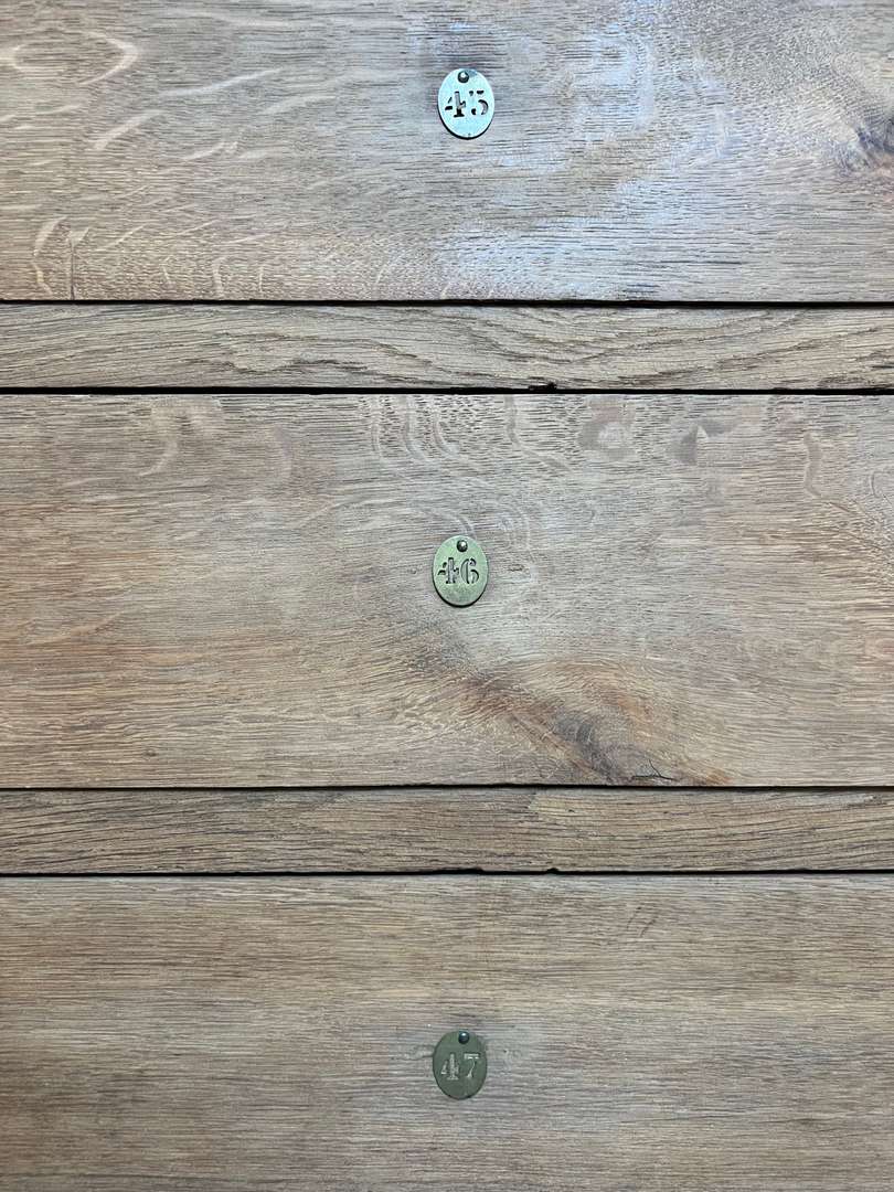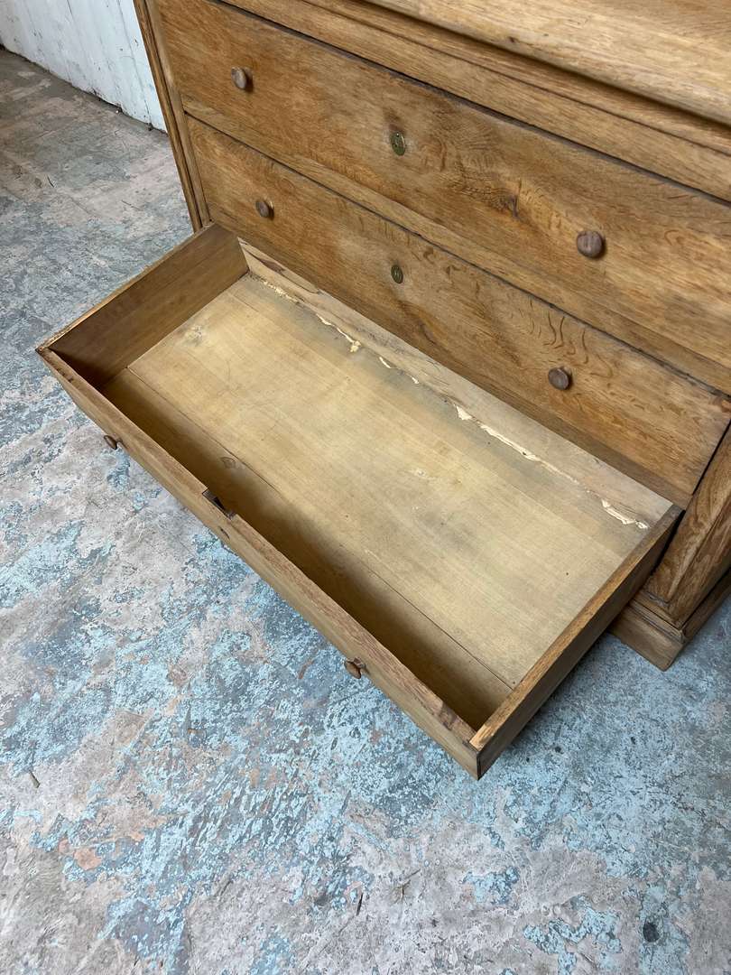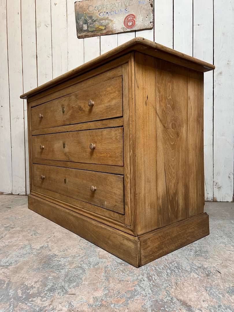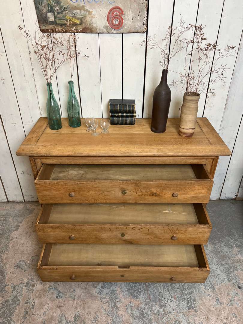 Ancienne commode des années 30 en chêne, composée de trois tiroirs spacieux. Chaque tiroir est numéroté d’un chiffre en laiton, détail original qui lui donne du caractère. Sobre et fonctionnelle, elle repose sur une base moulurée et conserve ses boutons en bois d’origine.