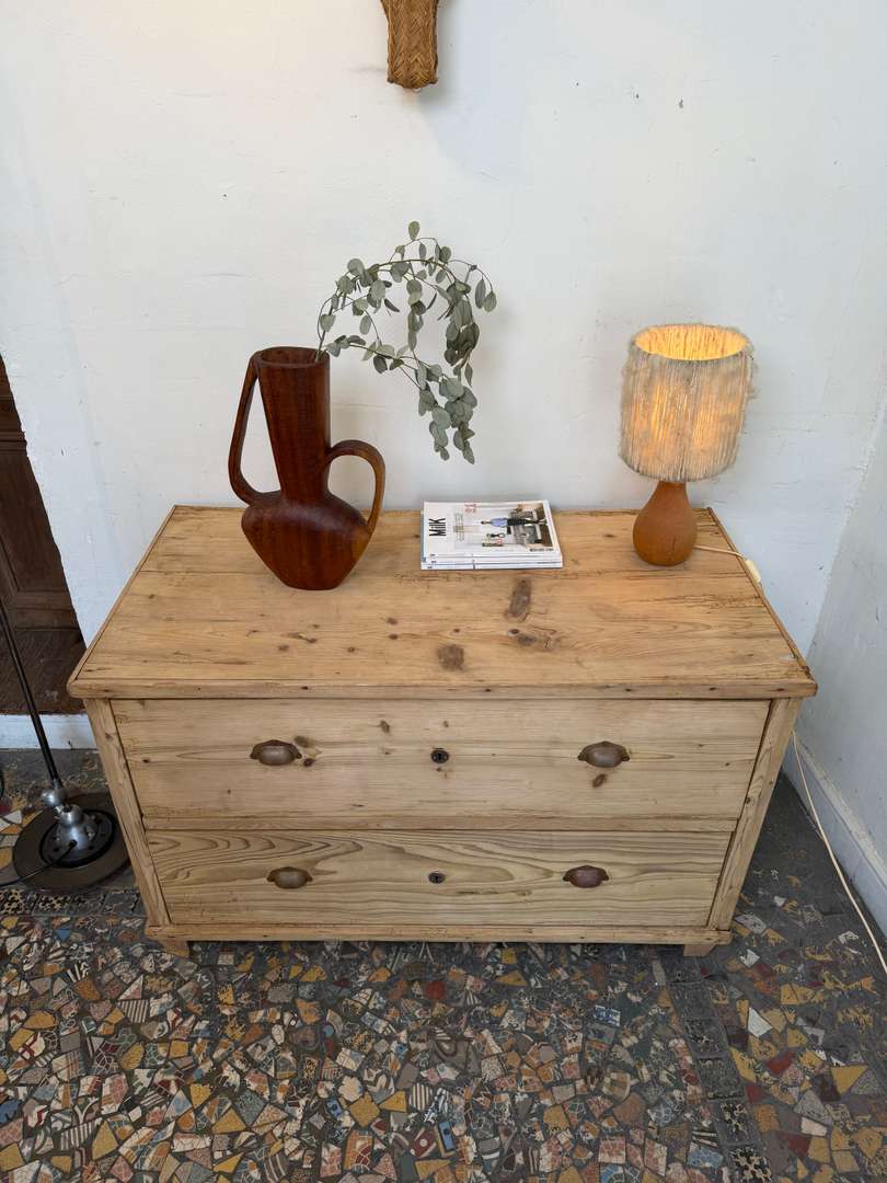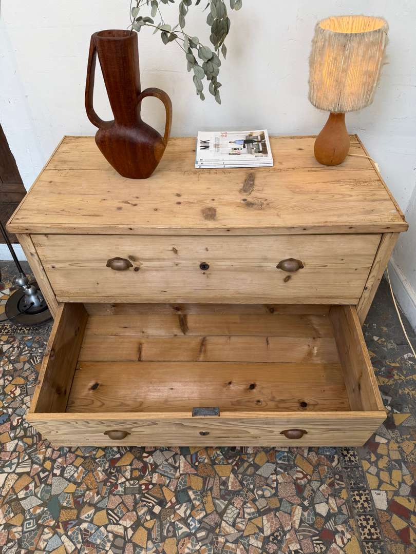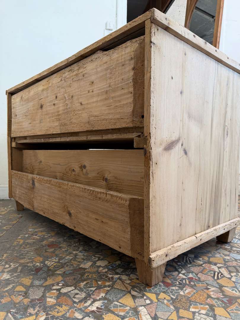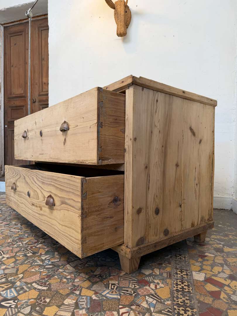 Commode en sapin du 19ᵉ siècle à deux tiroirs. Montage en queues d’aronde, poignées coquilles, et entrées de serrure anciennes.