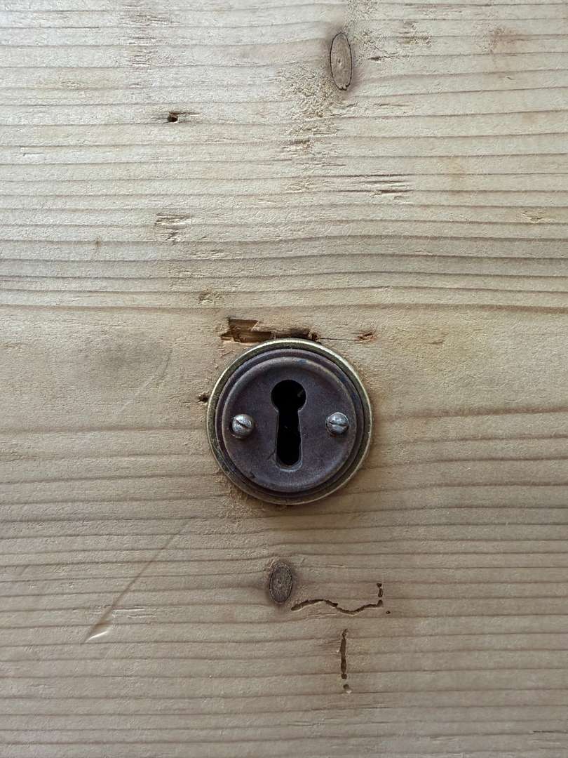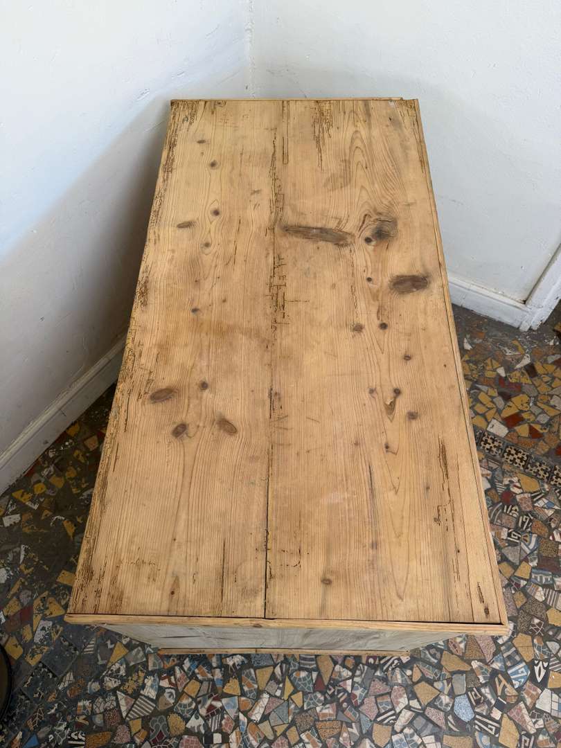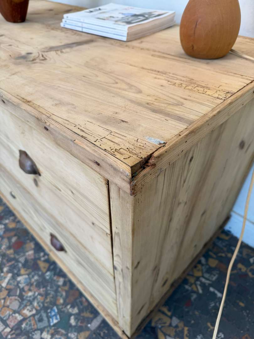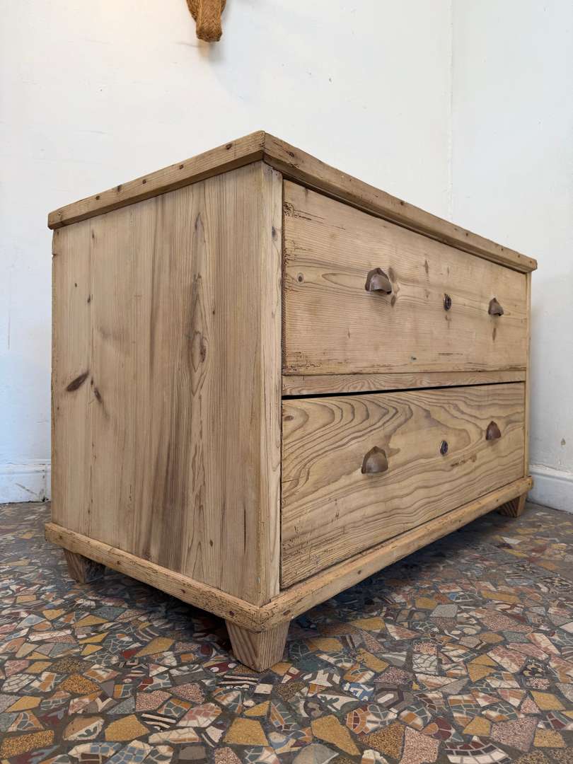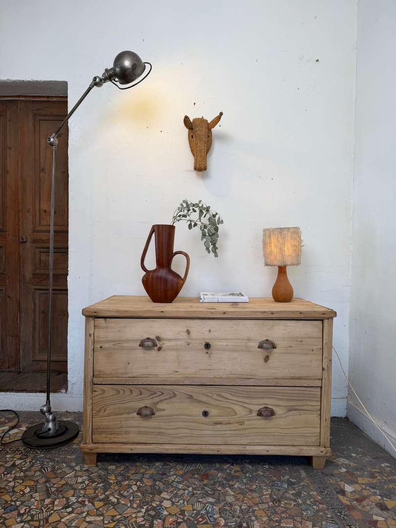 Commode en sapin du 19ᵉ siècle à deux tiroirs. Montage en queues d’aronde, poignées coquilles, et entrées de serrure anciennes.