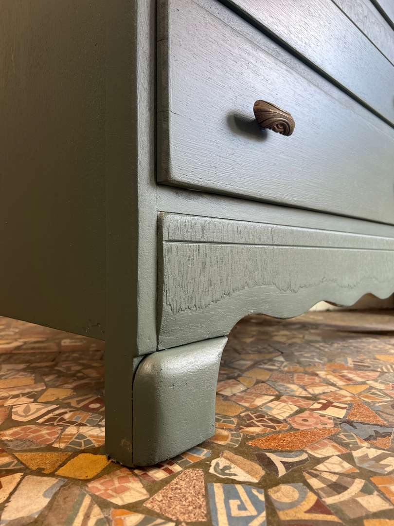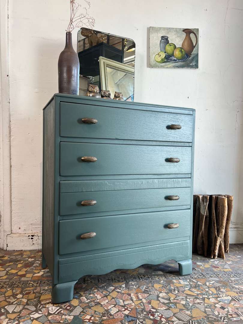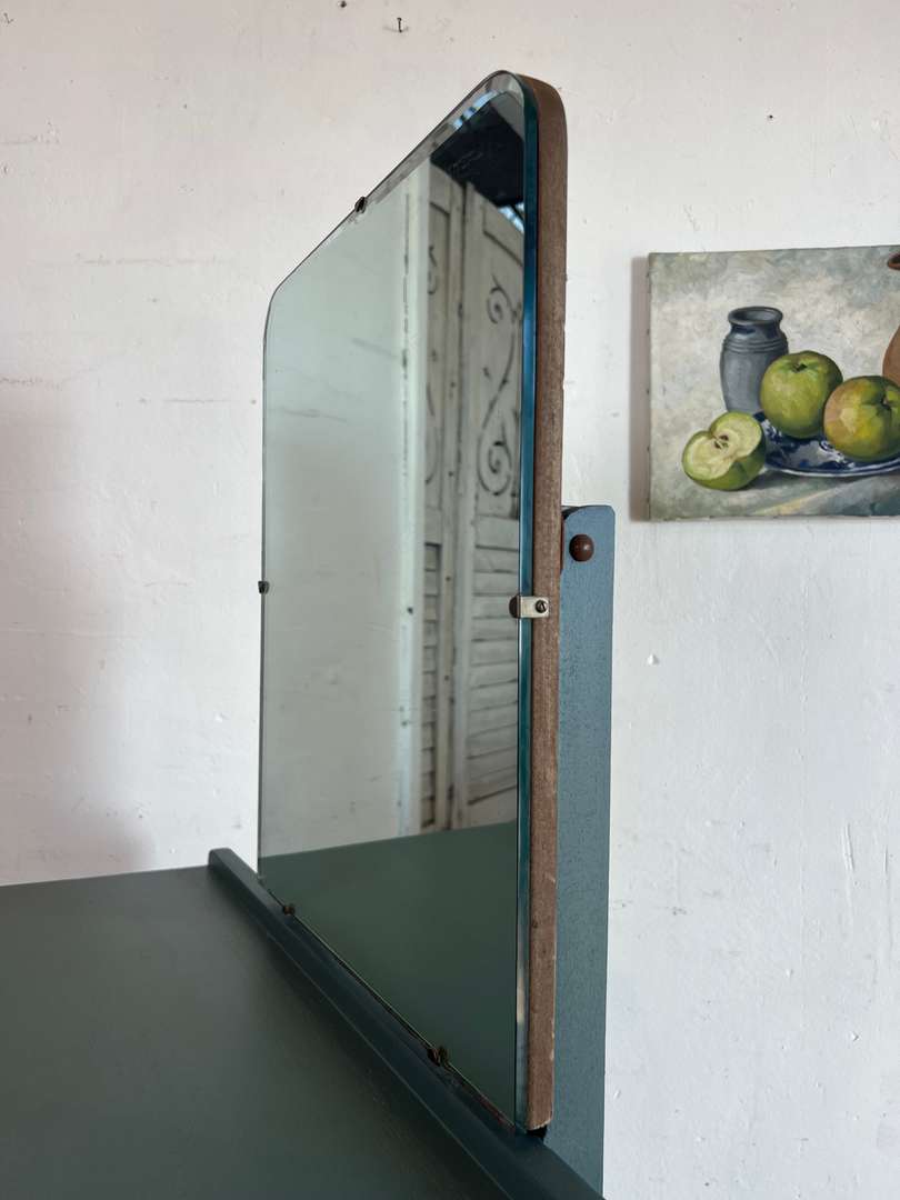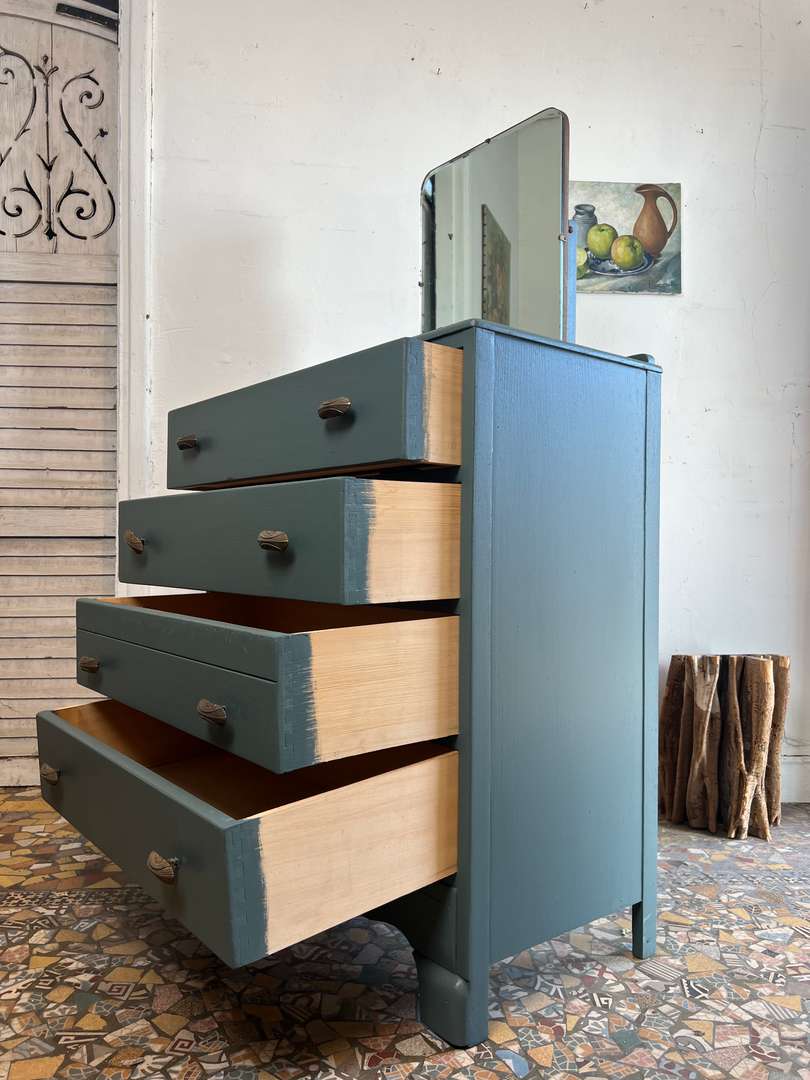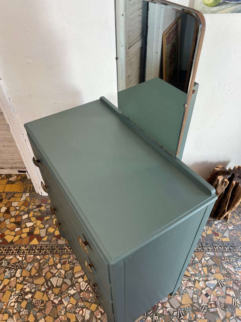 Charmante commode anglaise des années 50, équipée de son miroir d’origine. Elle a été peinte dans un joli ton vert, mettant en valeur ses lignes simples et élégantes. Ses poignées en métal patiné apportent une touche raffinée à l’ensemble. Une pièce à la fois pratique et décorative, idéale dans une chambre ou une entrée.