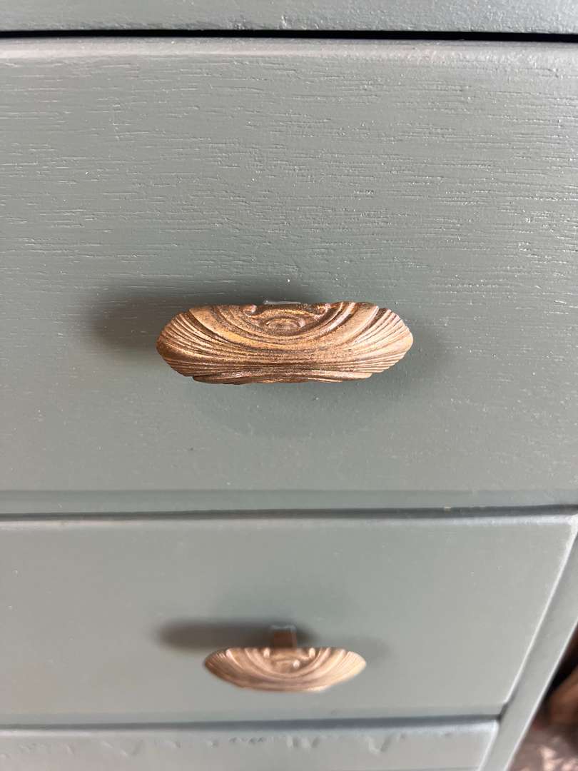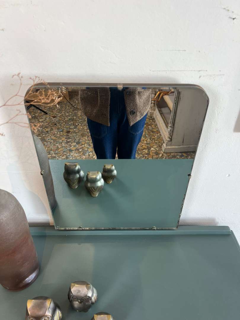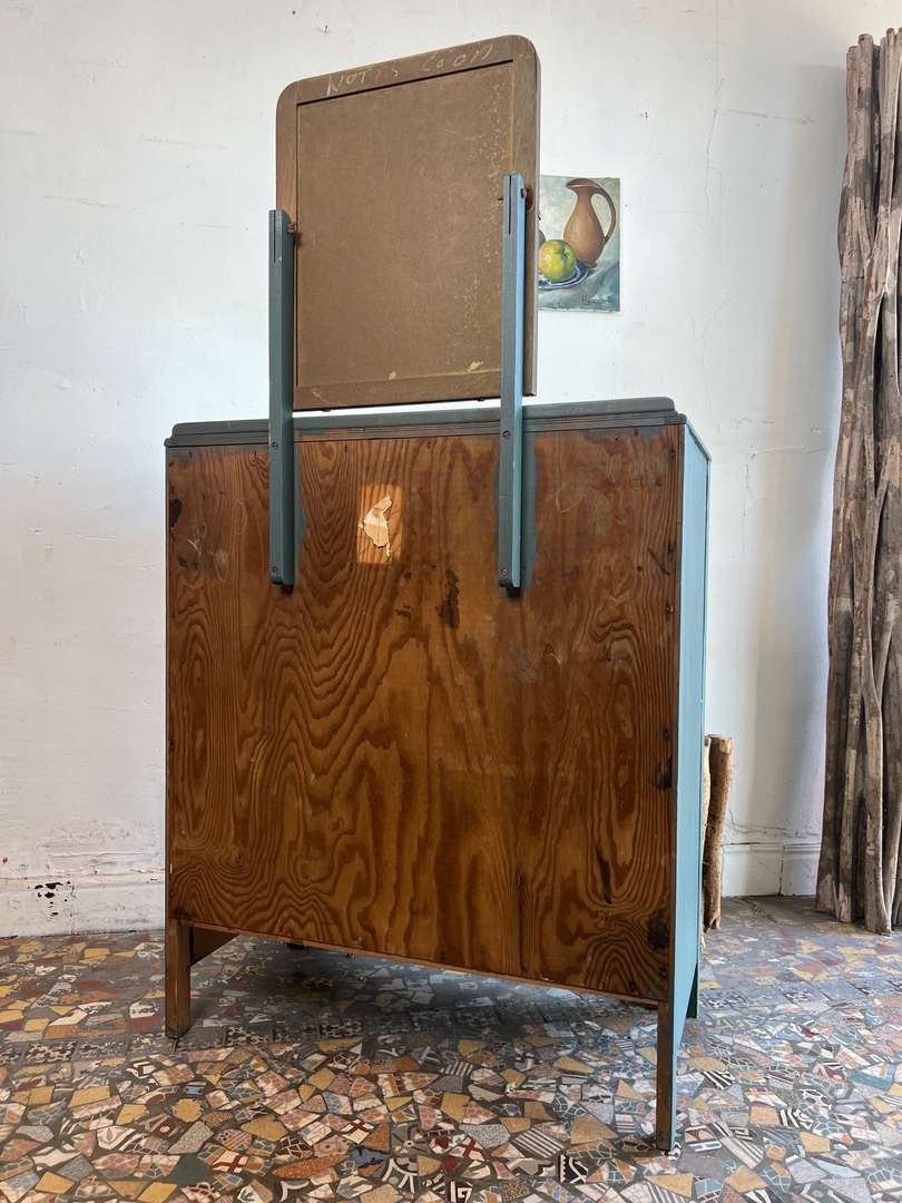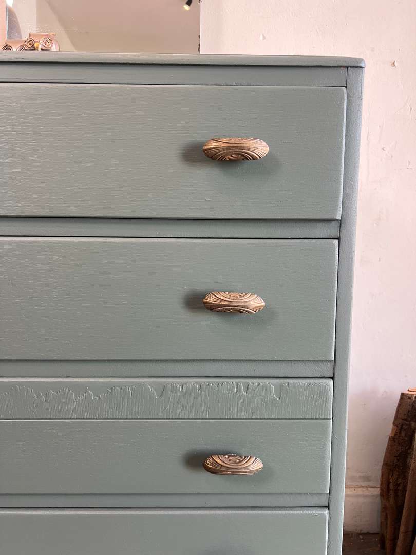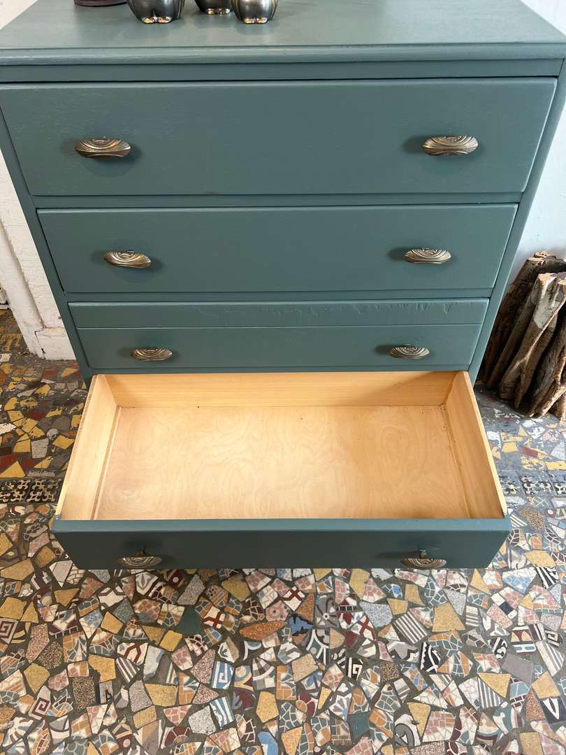 Charmante commode anglaise des années 50, équipée de son miroir d’origine. Elle a été peinte dans un joli ton vert, mettant en valeur ses lignes simples et élégantes. Ses poignées en métal patiné apportent une touche raffinée à l’ensemble. Une pièce à la fois pratique et décorative, idéale dans une chambre ou une entrée.