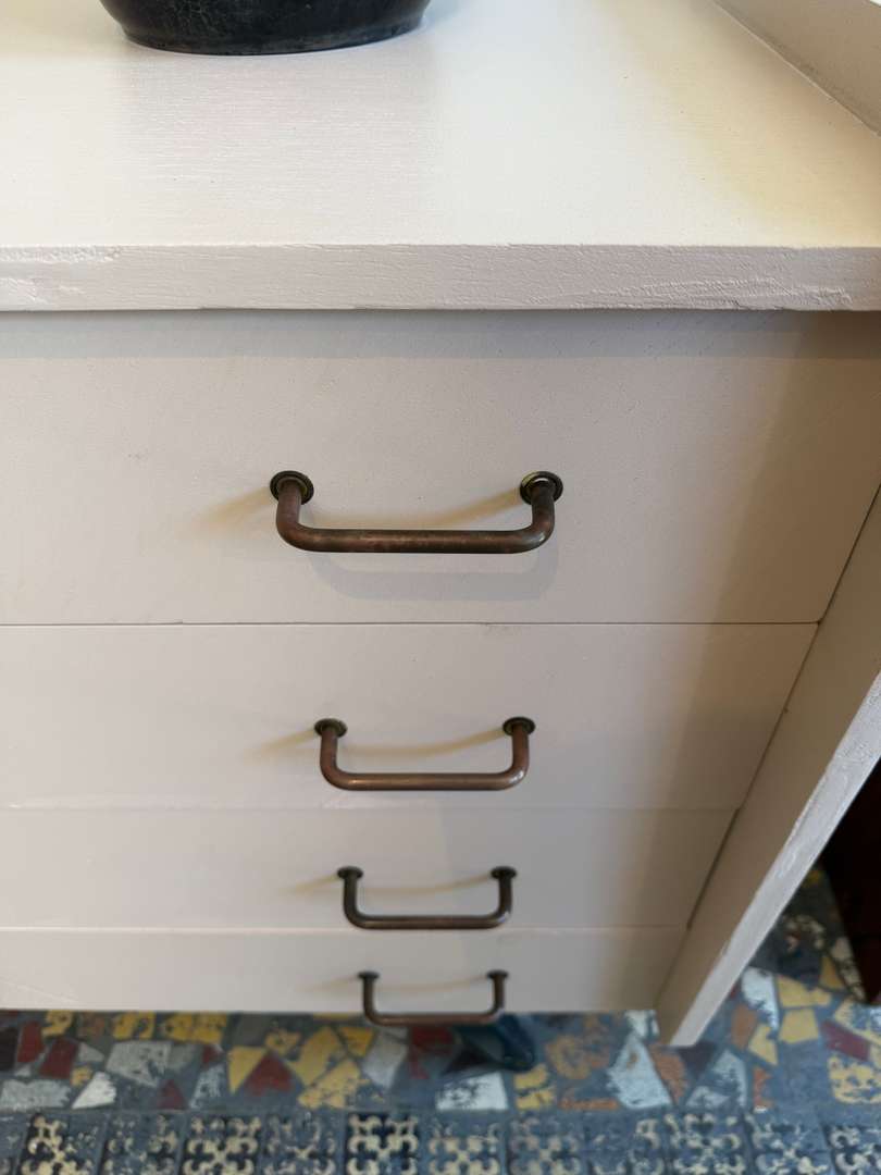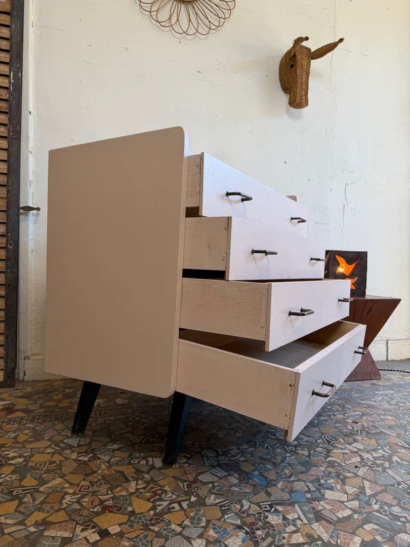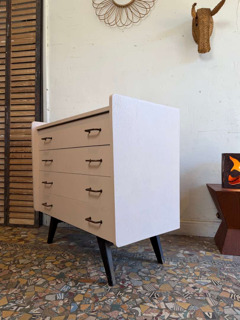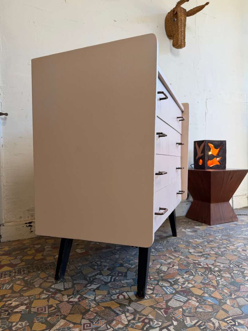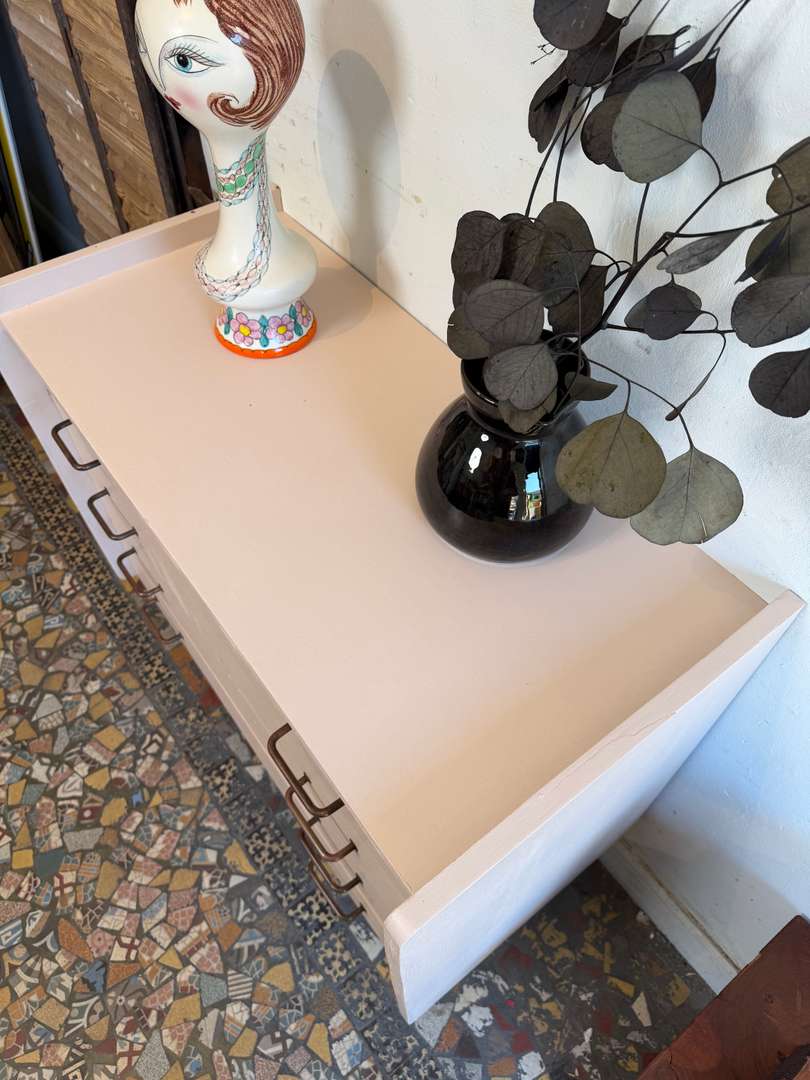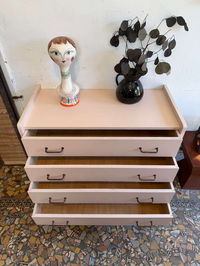 Commode vintage peinte rose 320 € Ajouter au panierCommode vintage en bois, revisitée dans une teinte rose douce. Piètement noir. Poignées en laiton. Quatre tiroirs fonctionnels offrant un beau rangement. #commodevintage #meublevintage #meublerose #decointerieur #mobilierancienDimensionsLargeur90 cmProfondeur45 cmHauteur83 cmRenseignementsRéférence2617007