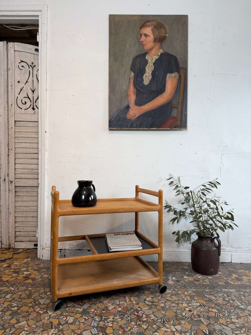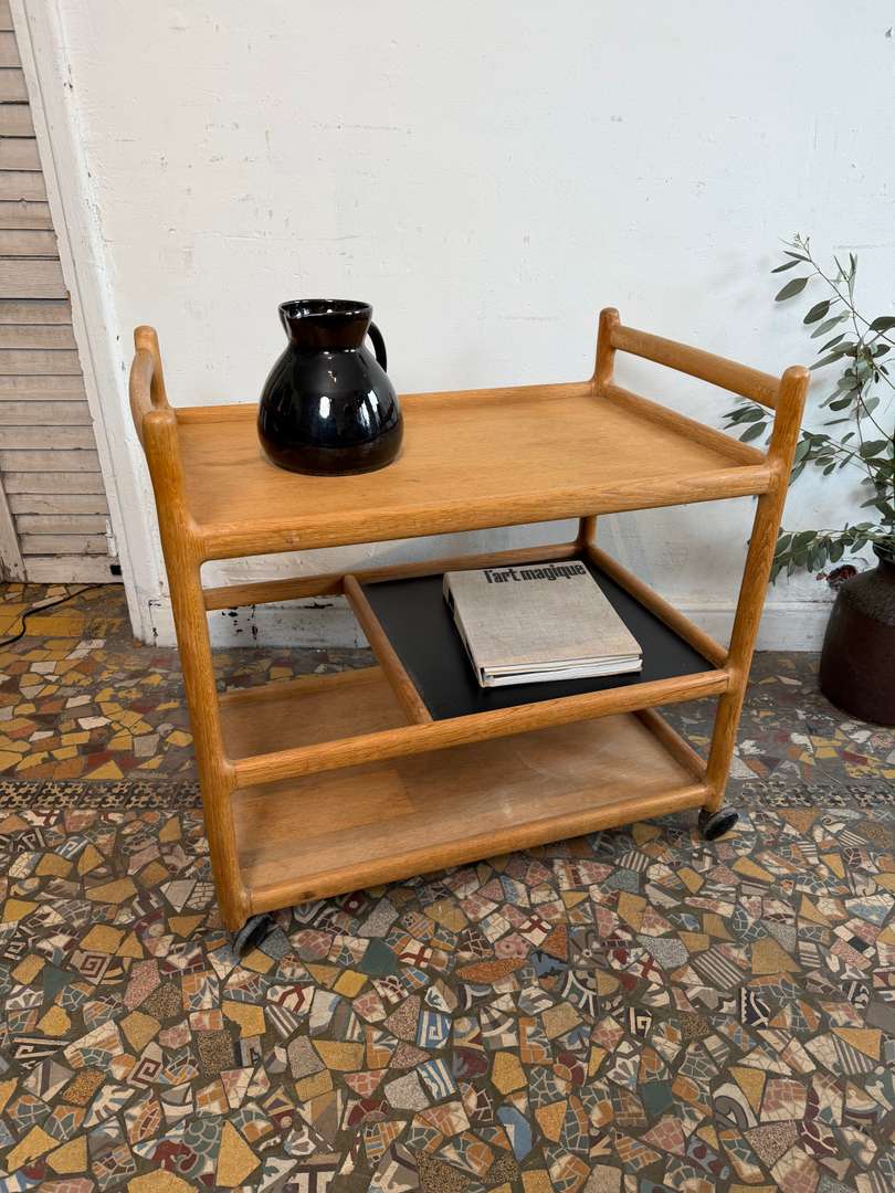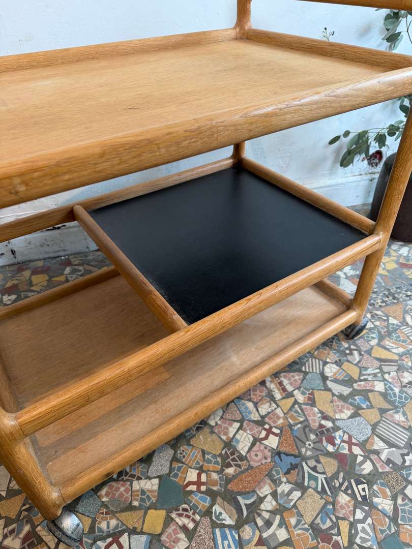 Élégante desserte roulante scandinave des années 60, dessinée par Johannes Andersen et éditée au Danemark par Silkeborg. Structure en chêne massif. Roues en acier chromé. Quelques traces d’usage, meuble estampillé.
