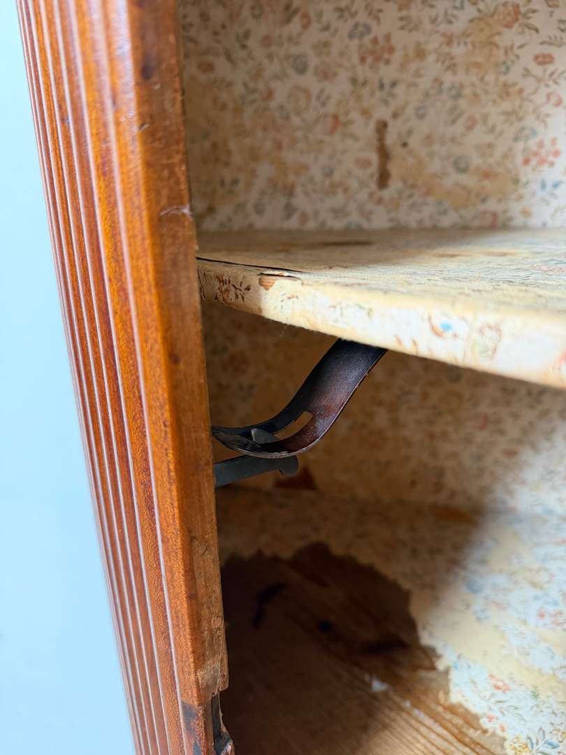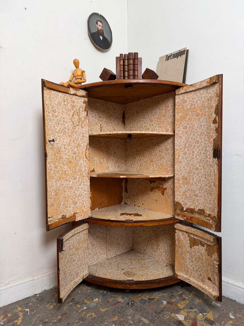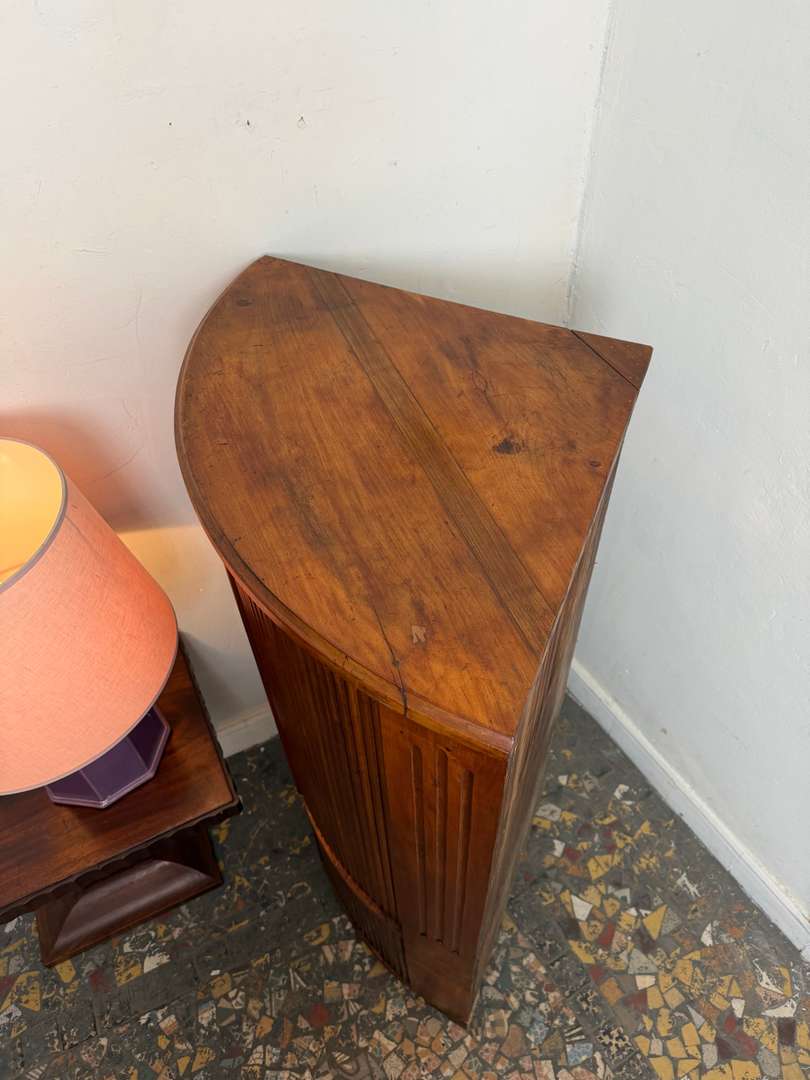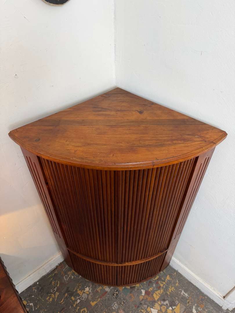 Encoignure d’époque Louis XVI en noyer, datant de la fin du XVIIIᵉ siècle. Belle fabrication, façade à cannelures et proportions équilibrées, conçue pour s’intégrer dans un angle. Intérieur conservé avec son papier d’origine. Le meuble ferme, sans clé. Traces du temps visibles, cohérentes avec son âge.