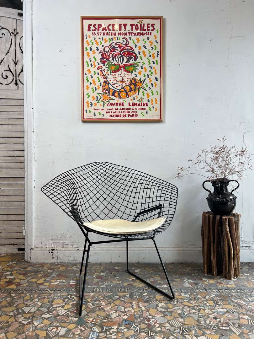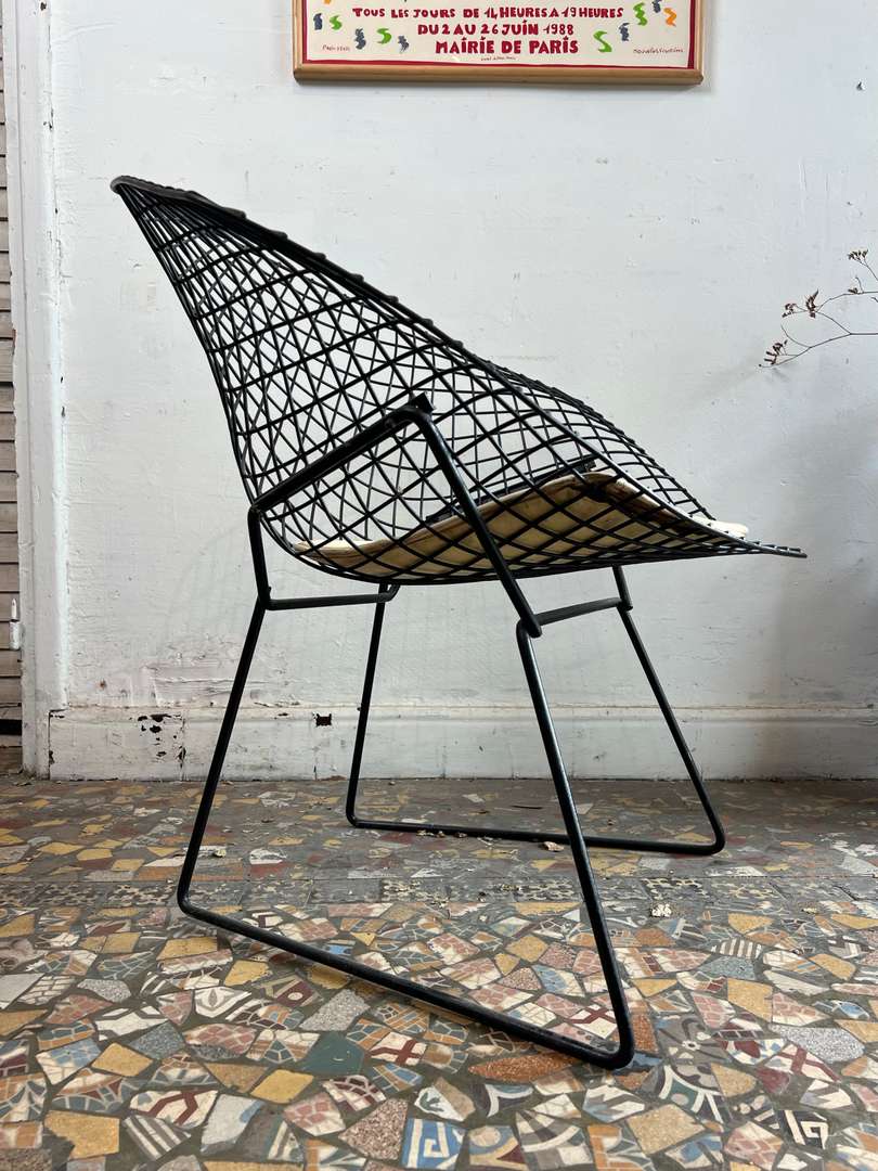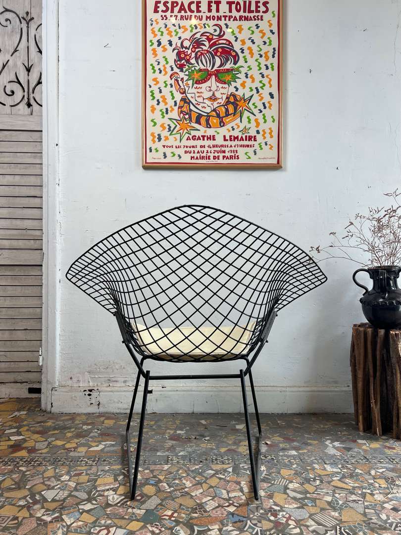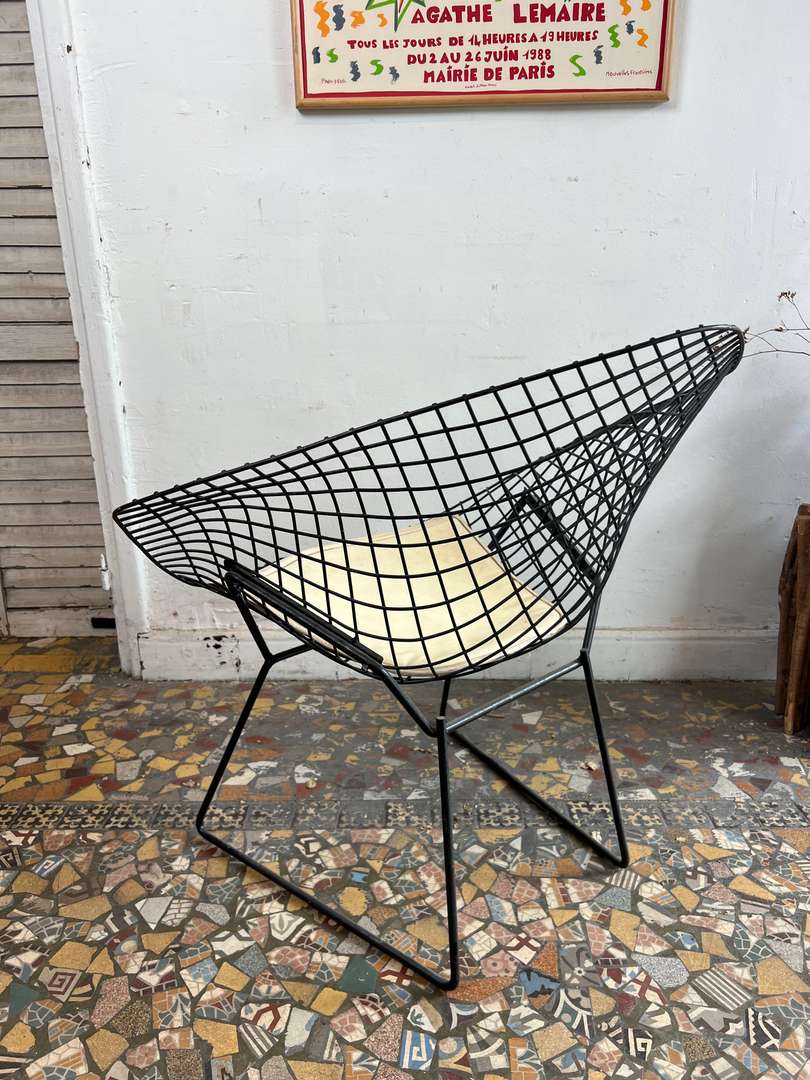 Fauteuil design Harry Bertoïa – modèle Diamond 450 € Ajouter au panierFauteuil design signé Harry Bertoïa, modèle Diamond. Année 50. Structure en fil d’acier noir et galette d’assise d’origine en cuir clair. Un modèle iconique au style aérien et intemporel. #harrybertoia #diamondchair #fauteuildesign #mobiliervintage #designmidcentury #classiquedesignDimensionsLargeur84 cmProfondeur70 cmHauteur76 cmHauteur d'assise39 cmRenseignementsRéférence2544006