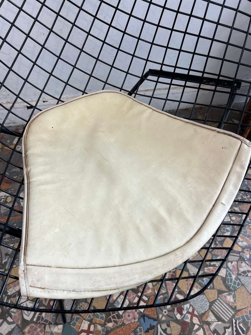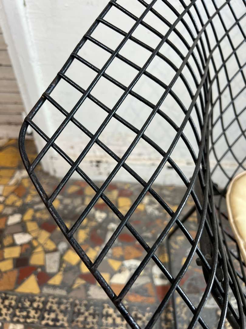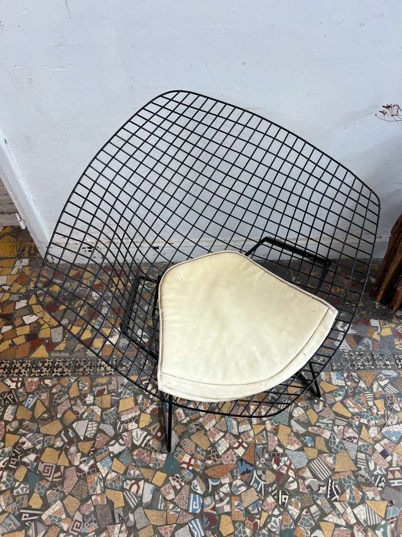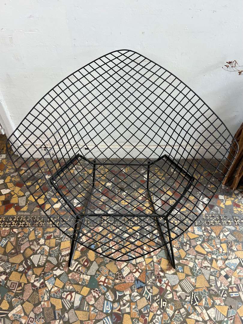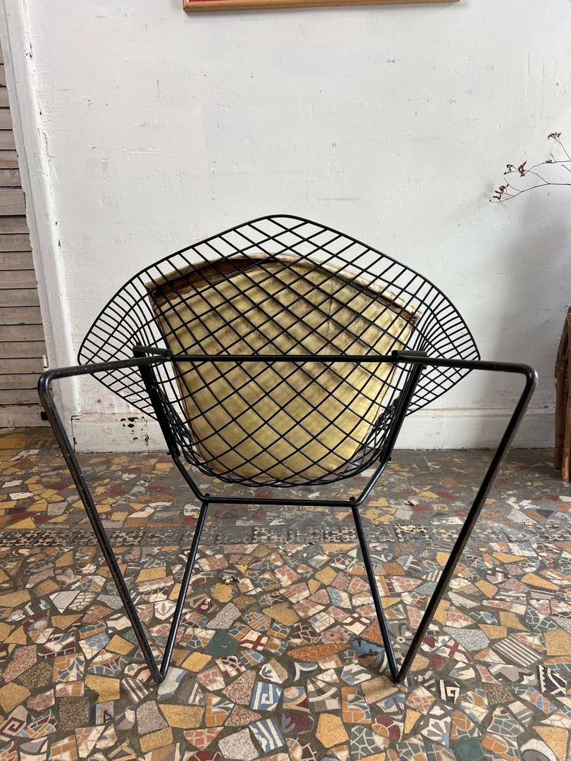 Fauteuil design Harry Bertoïa – modèle Diamond 450 € Ajouter au panierFauteuil design signé Harry Bertoïa, modèle Diamond. Année 50. Structure en fil d’acier noir et galette d’assise d’origine en cuir clair. Un modèle iconique au style aérien et intemporel. #harrybertoia #diamondchair #fauteuildesign #mobiliervintage #designmidcentury #classiquedesignDimensionsLargeur84 cmProfondeur70 cmHauteur76 cmHauteur d'assise39 cmRenseignementsRéférence2544006