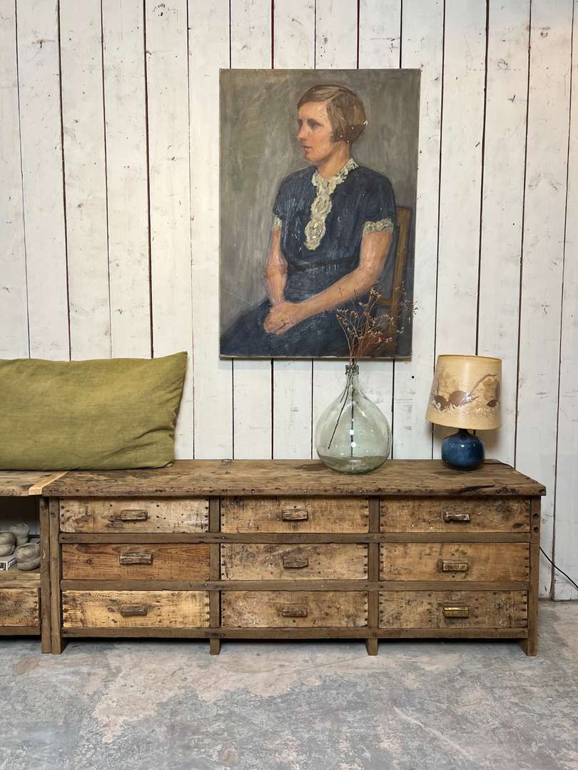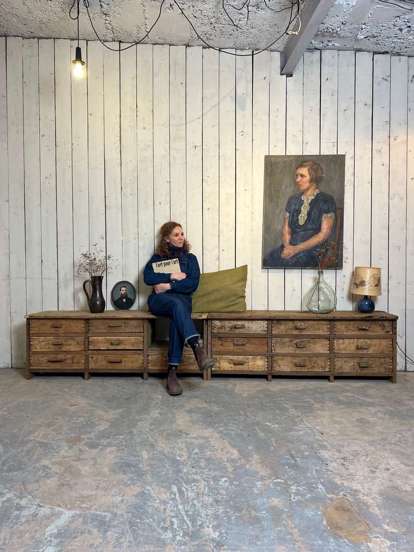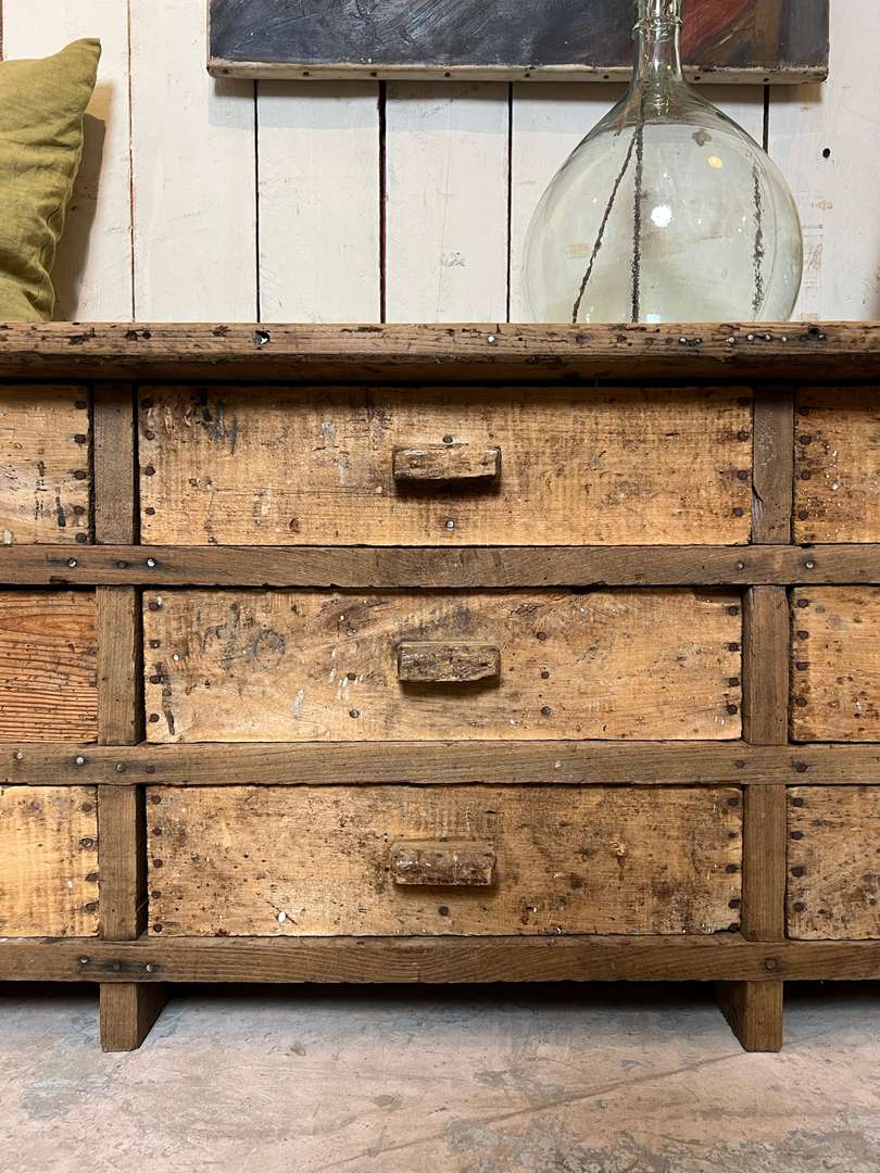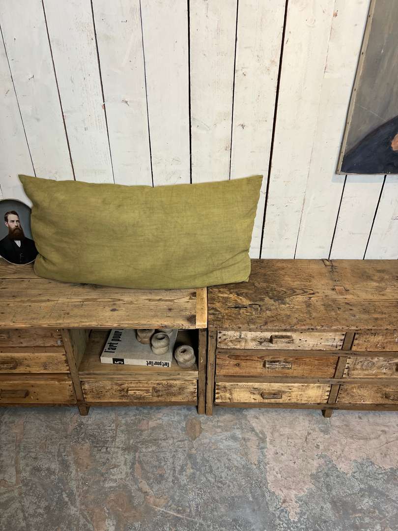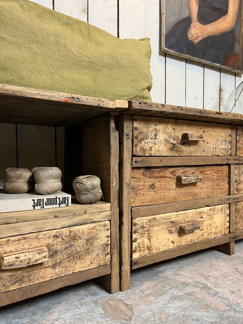 Ancien meuble bas en deux parties, pouvant être disposées ensemble ou séparément. En hêtre et sapin, avec une belle patine du temps. Nombreux tiroirs compartimentés, pratiques et décoratifs. Idéal en meuble TV, dans une entrée ou un espace de vie.