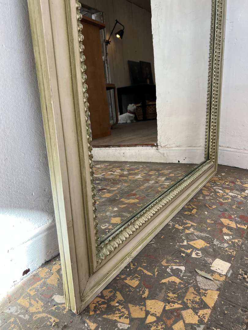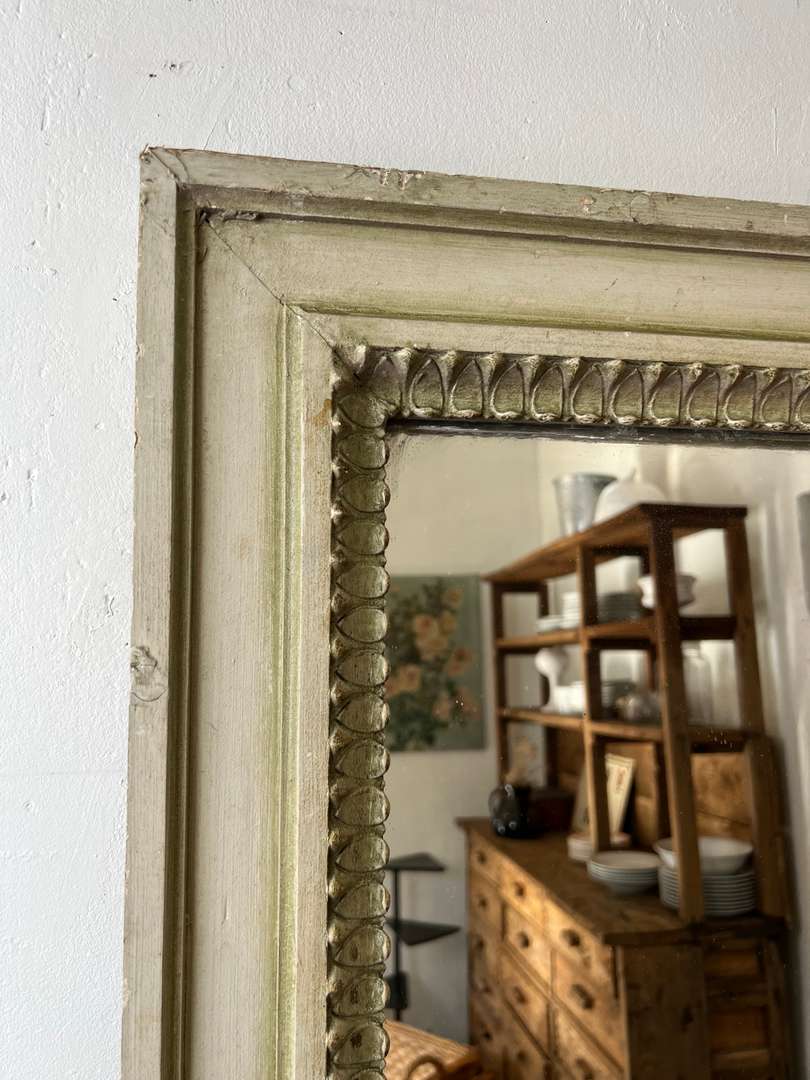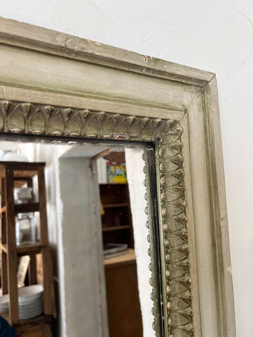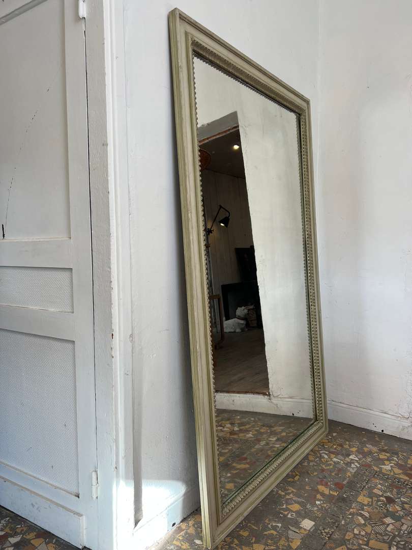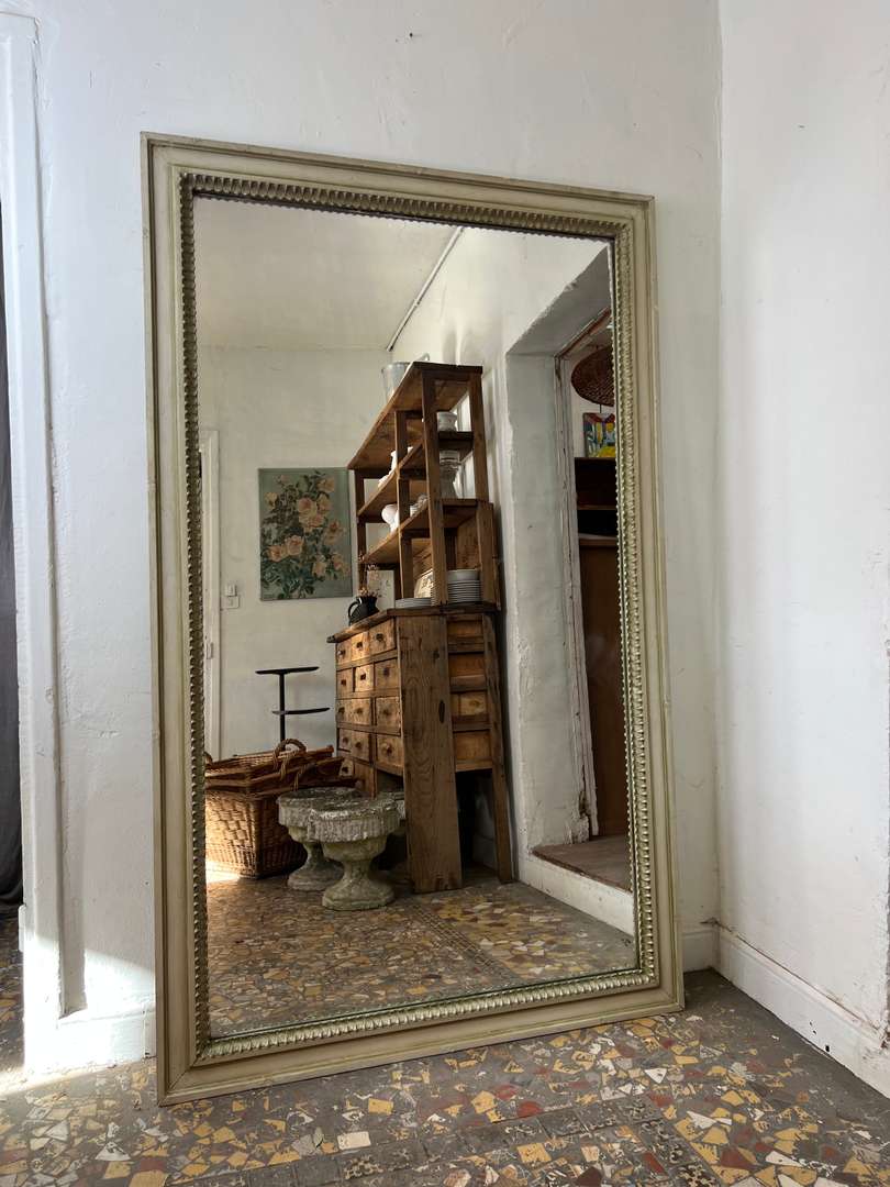 Miroir ancien à taille humaine, datant des années 60. Il peut être posé au sol dans une entrée, une grande pièce ou un dressing. Sa patine d’origine dans les tons verts et sa glace au nitrate d’argent.