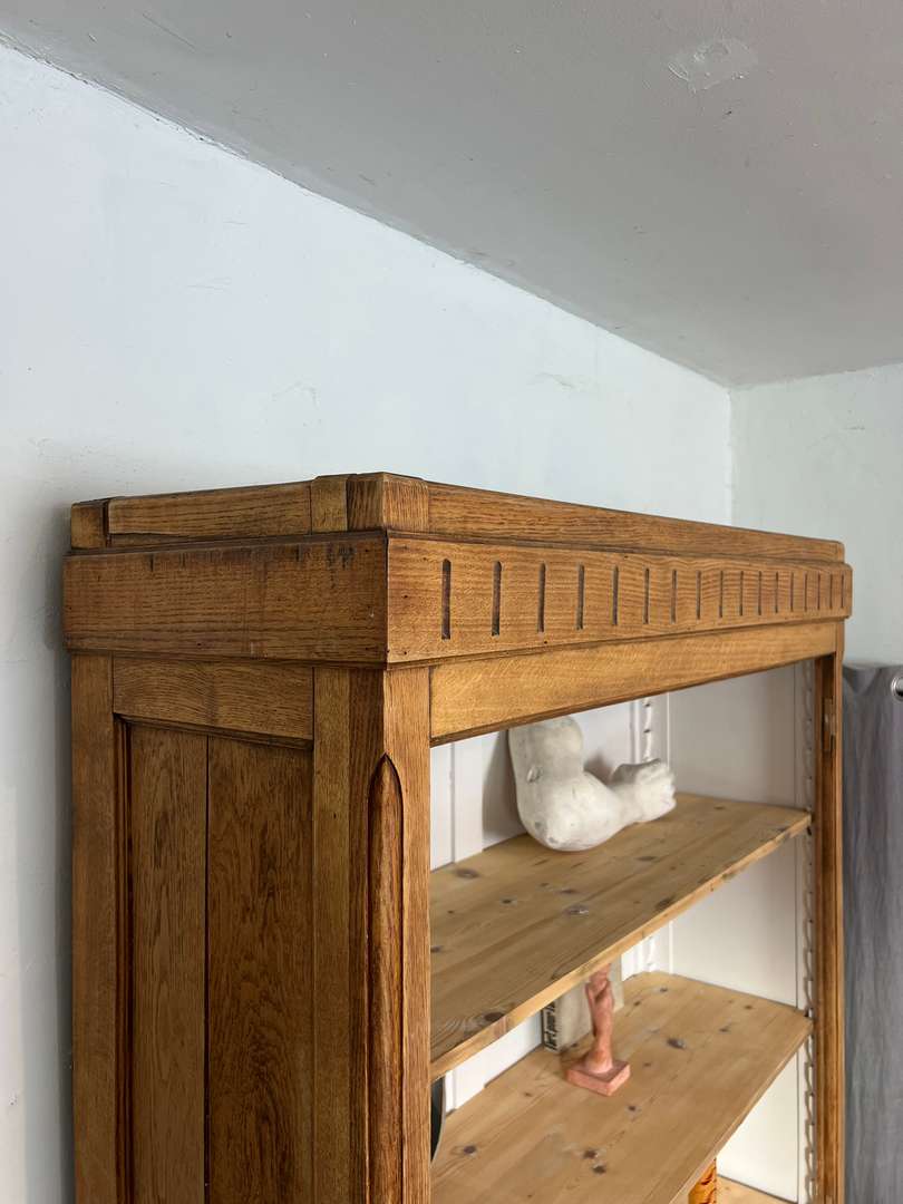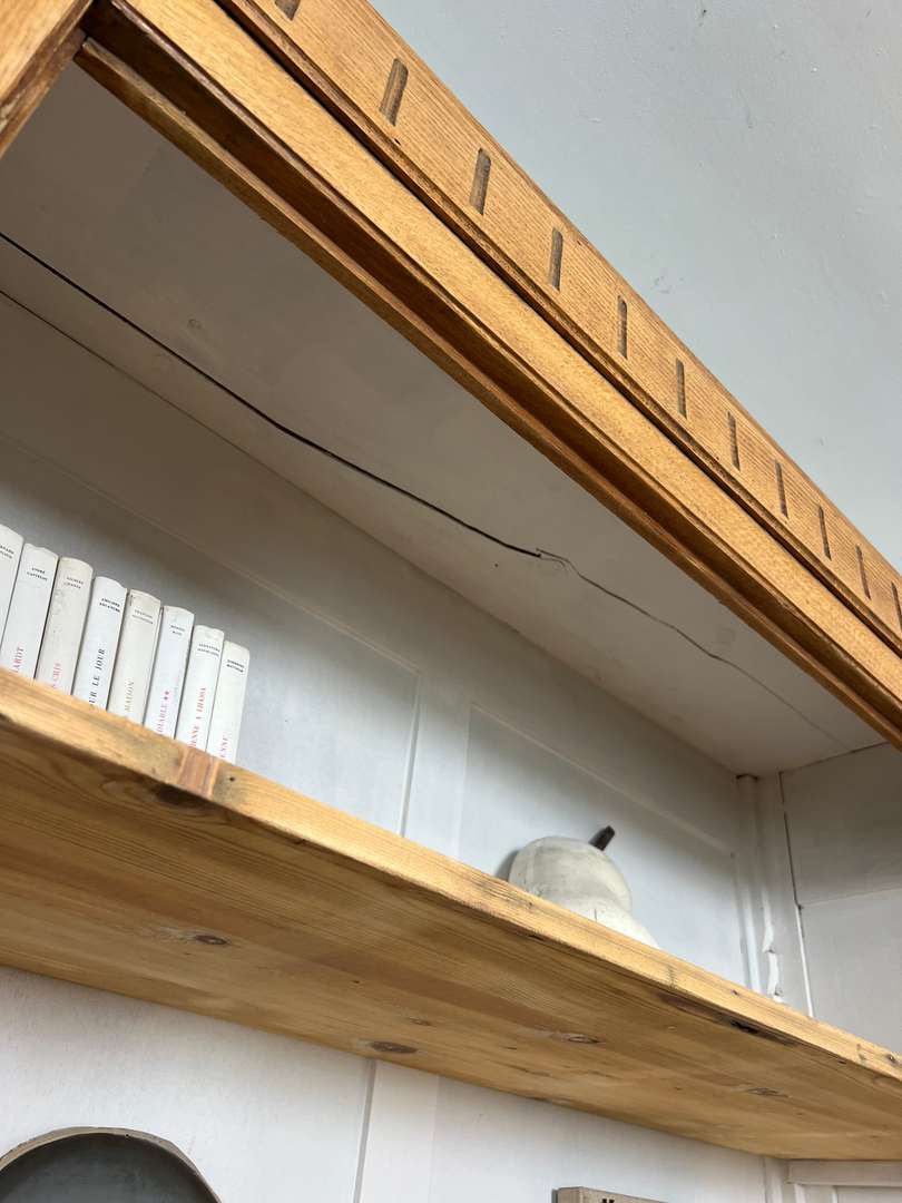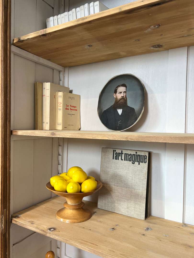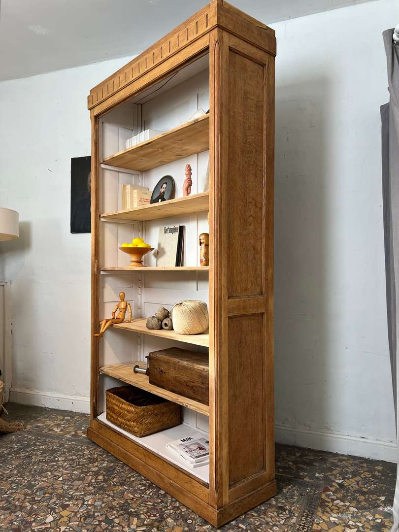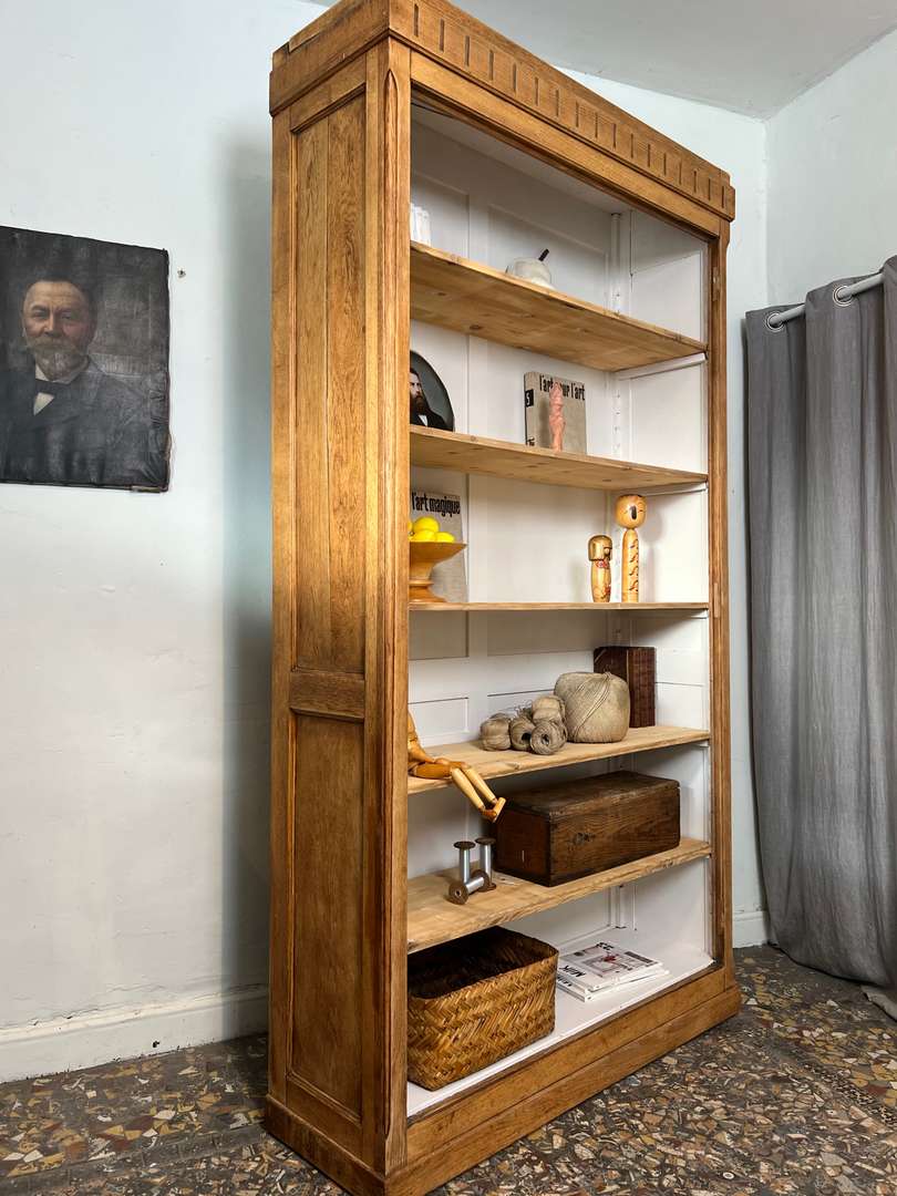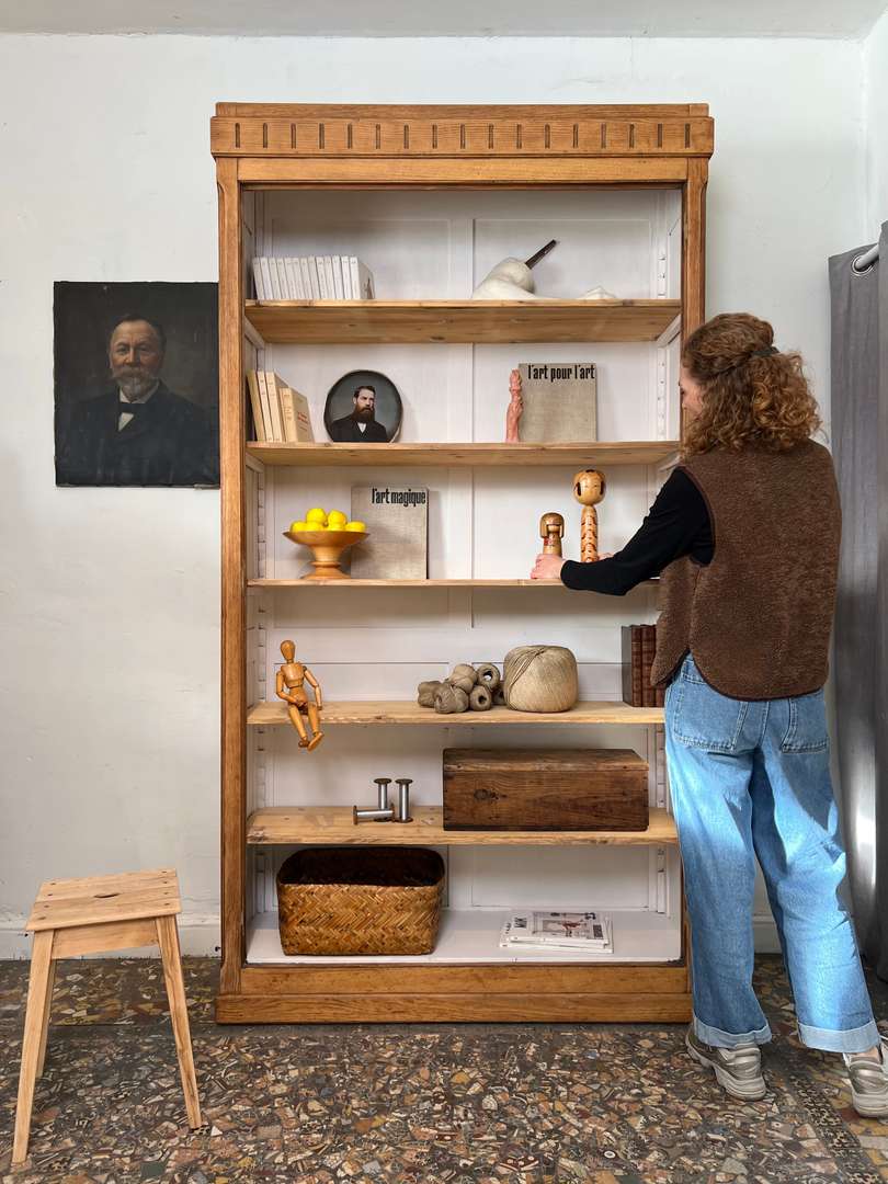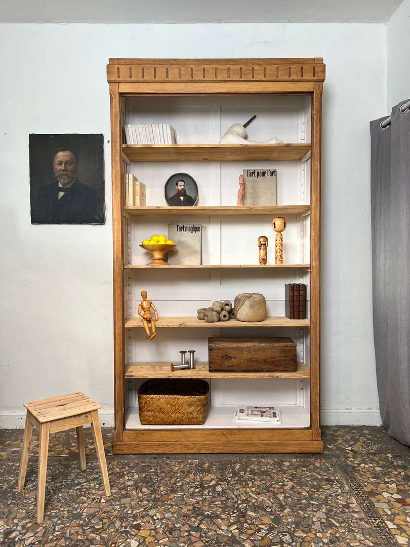 Grande bibliothèque en chêne 650 € Ajouter au panierGrande bibliothèque en chêne avec un fond peint en blanc. Les étagères sont modulables en hauteur pour s’adapter à tous types de livres ou d’objets. Une pièce pratique pour organiser et exposer sa décoration. #bibliothequeancienne #chene #etagere #meubleancien #decoauthentique #brocanteDimensionsLargeur127 cmProfondeur42 cmHauteur234 cmProfondeur des étagères35 cmRenseignementsRéférence2546007