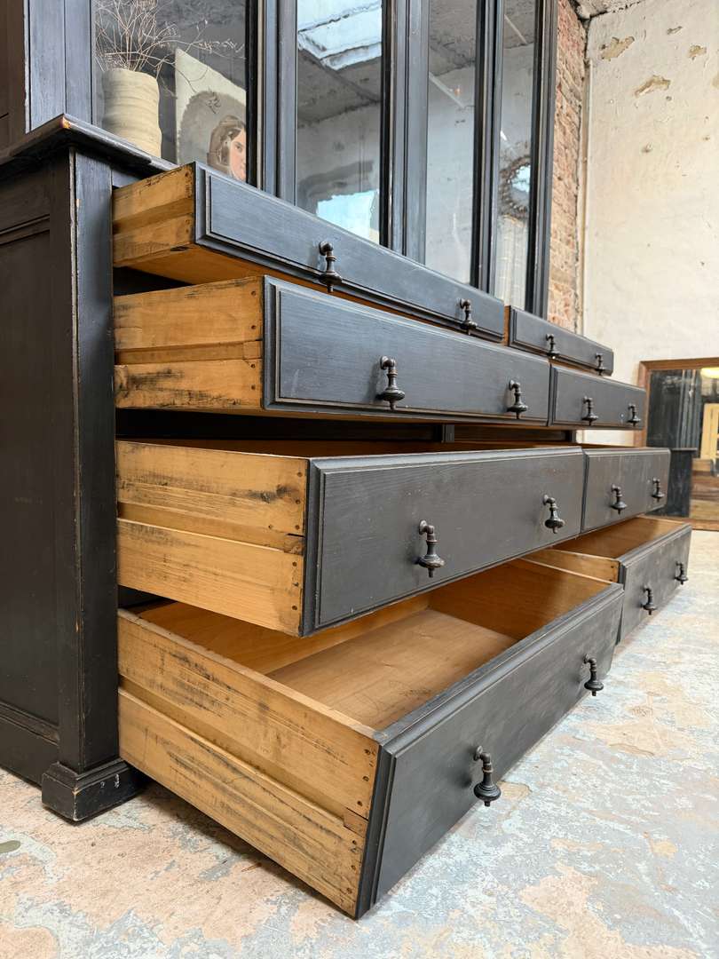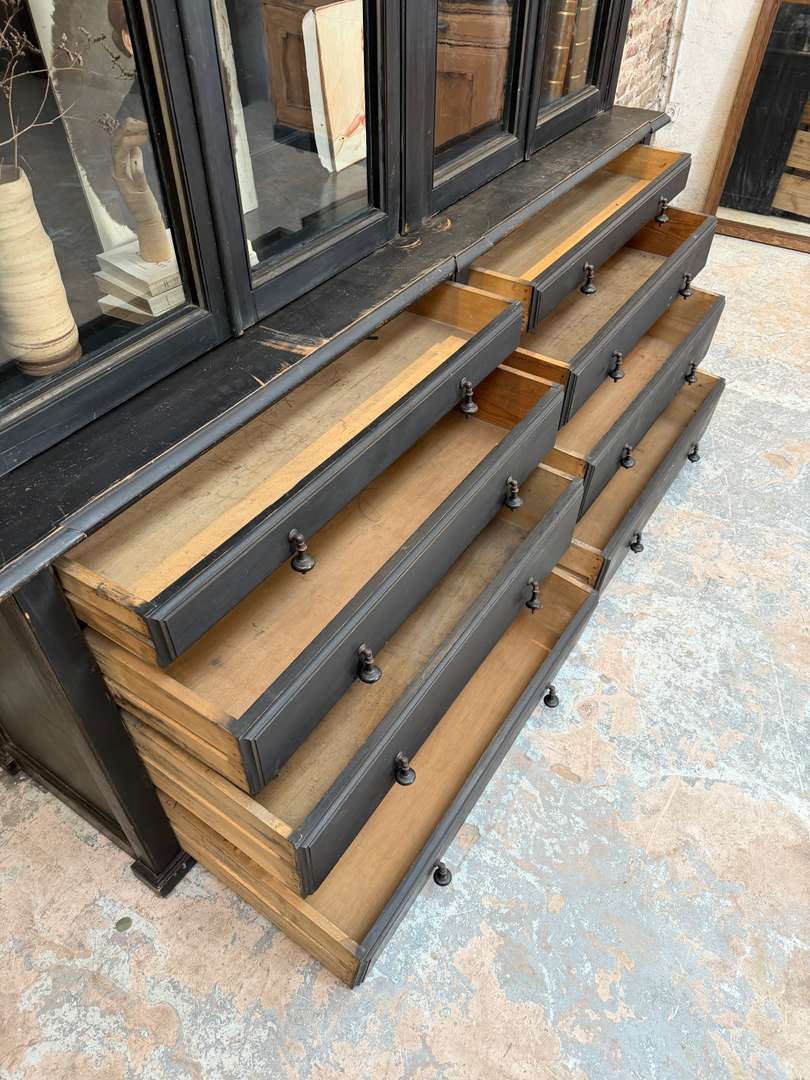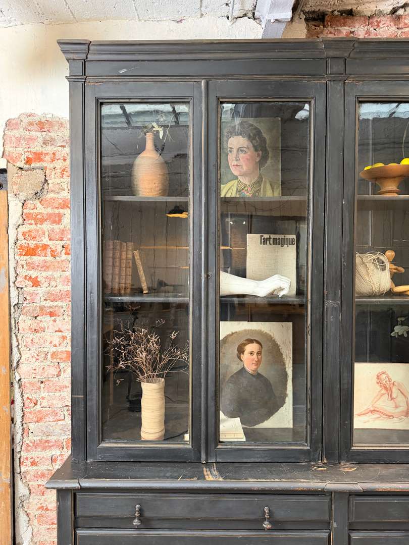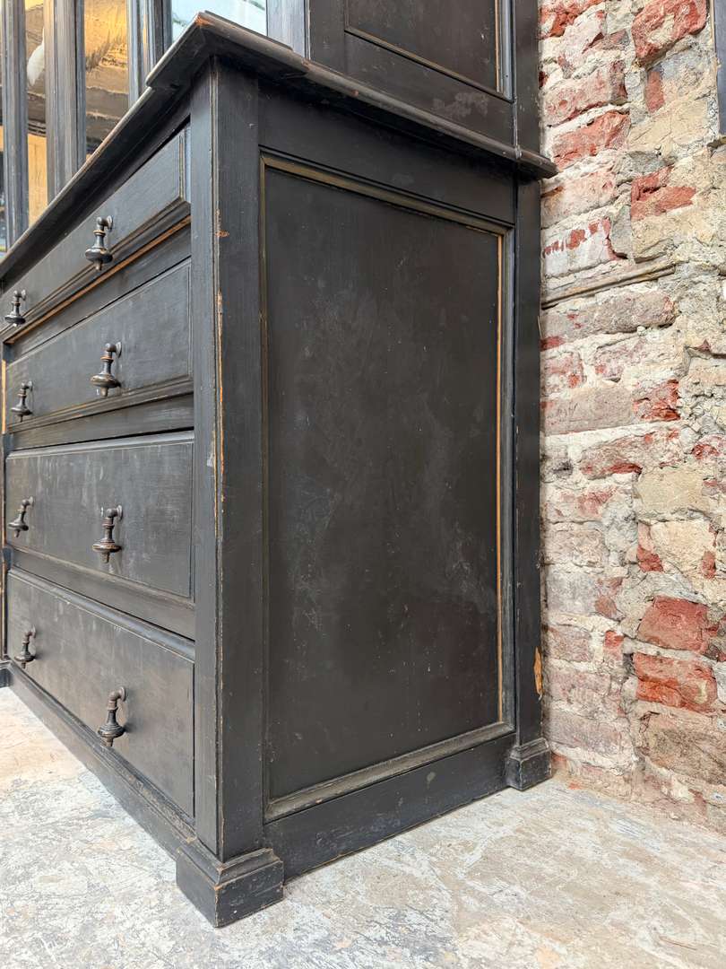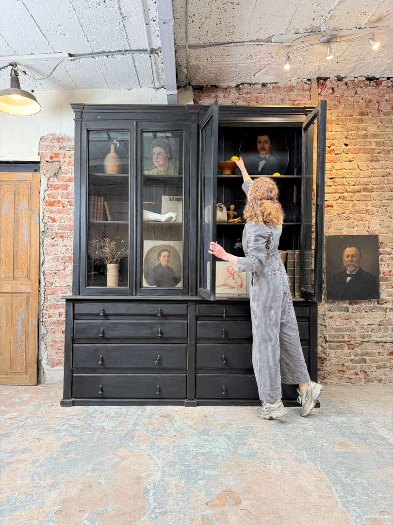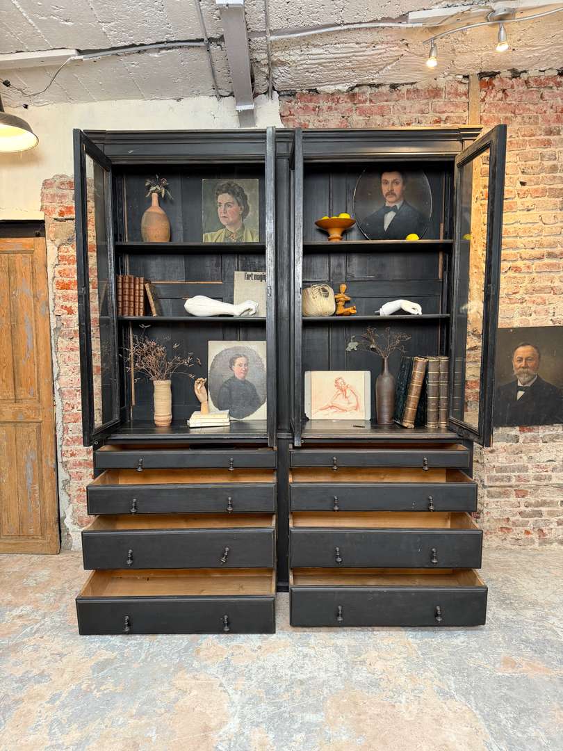 Ancienne bibliothèque vitrée en bois noir d’origine datant de la fin du XIXeme siècle, époque Napoléon III. Elle se compose de deux parties et possède de jolis verres bullés d’origine. Deux étagères sont actuellement en place et une troisième est disponible. Les tiroirs sont fonctionnels et les portes ferment correctement (pas à clé).
