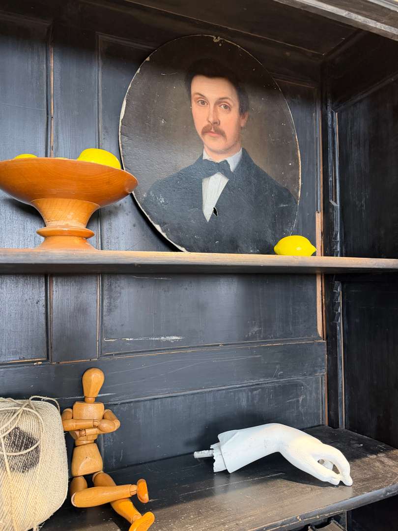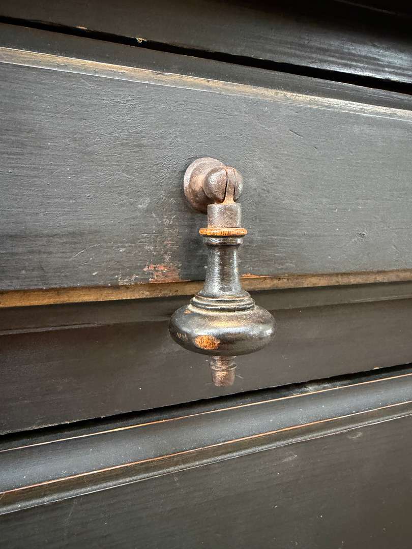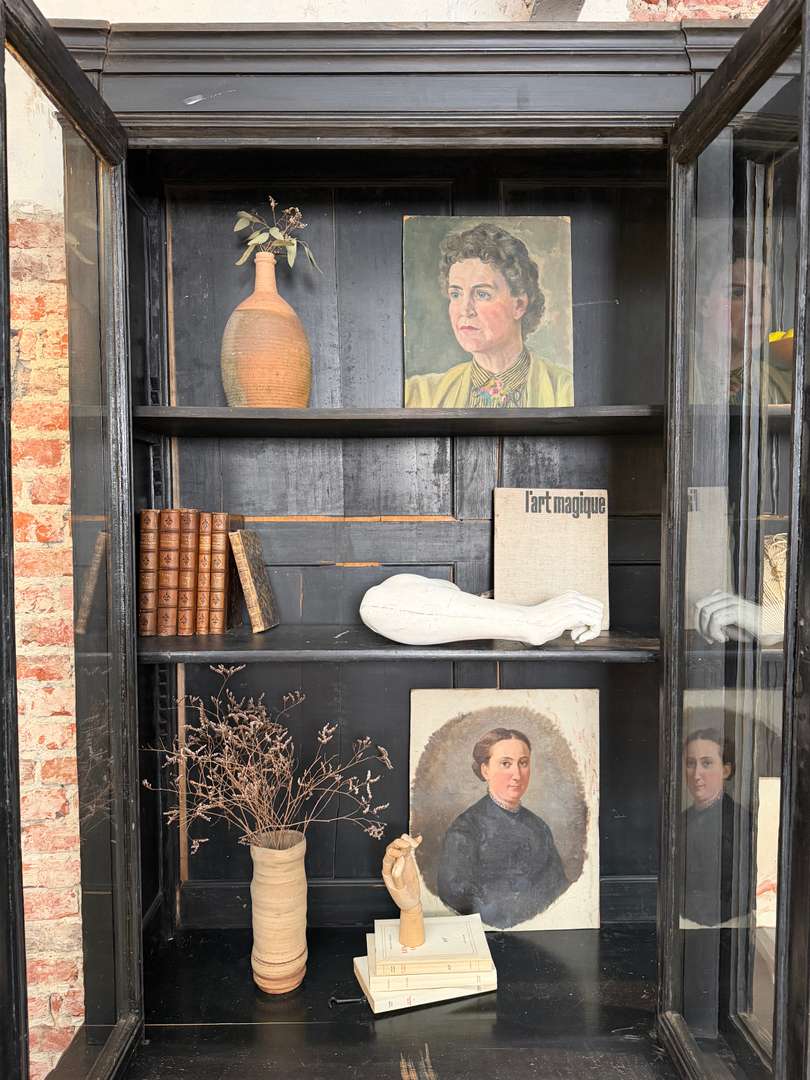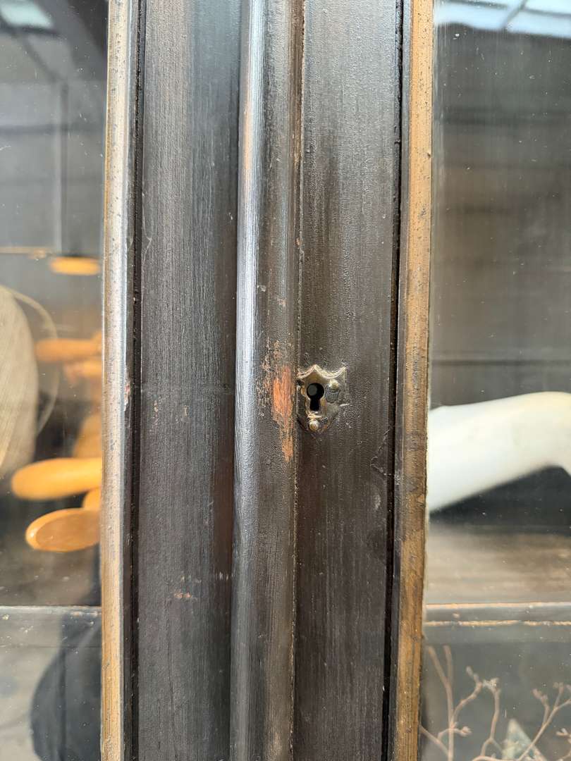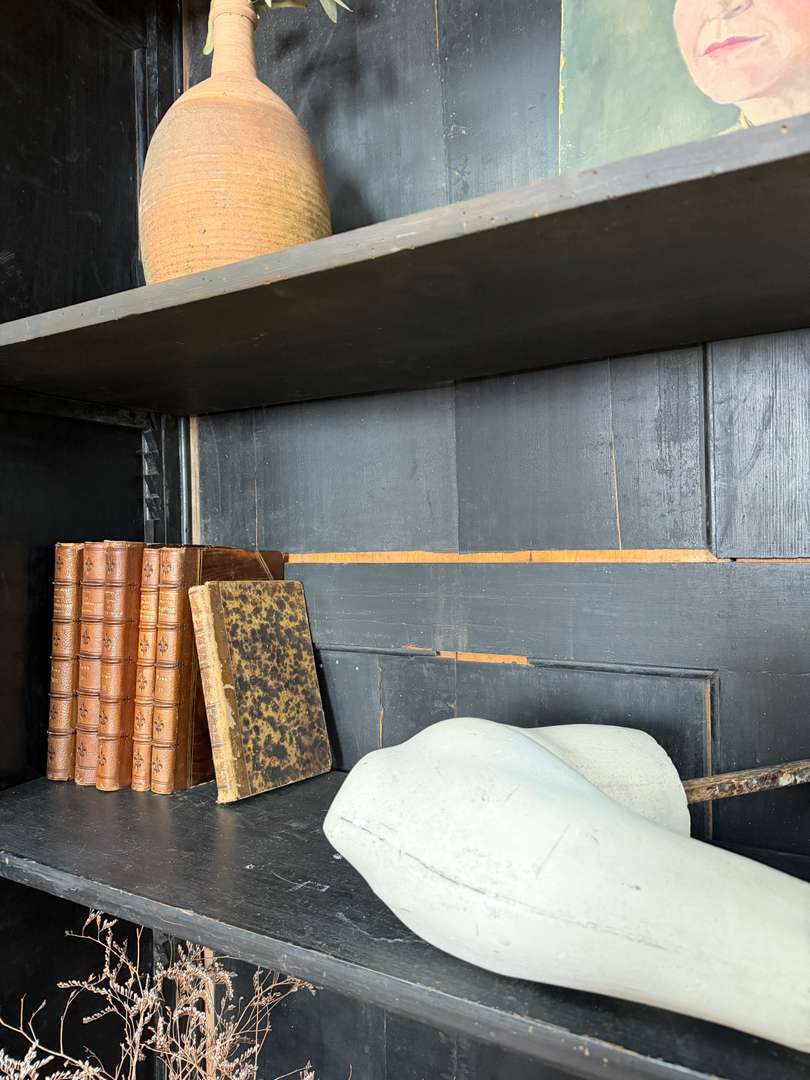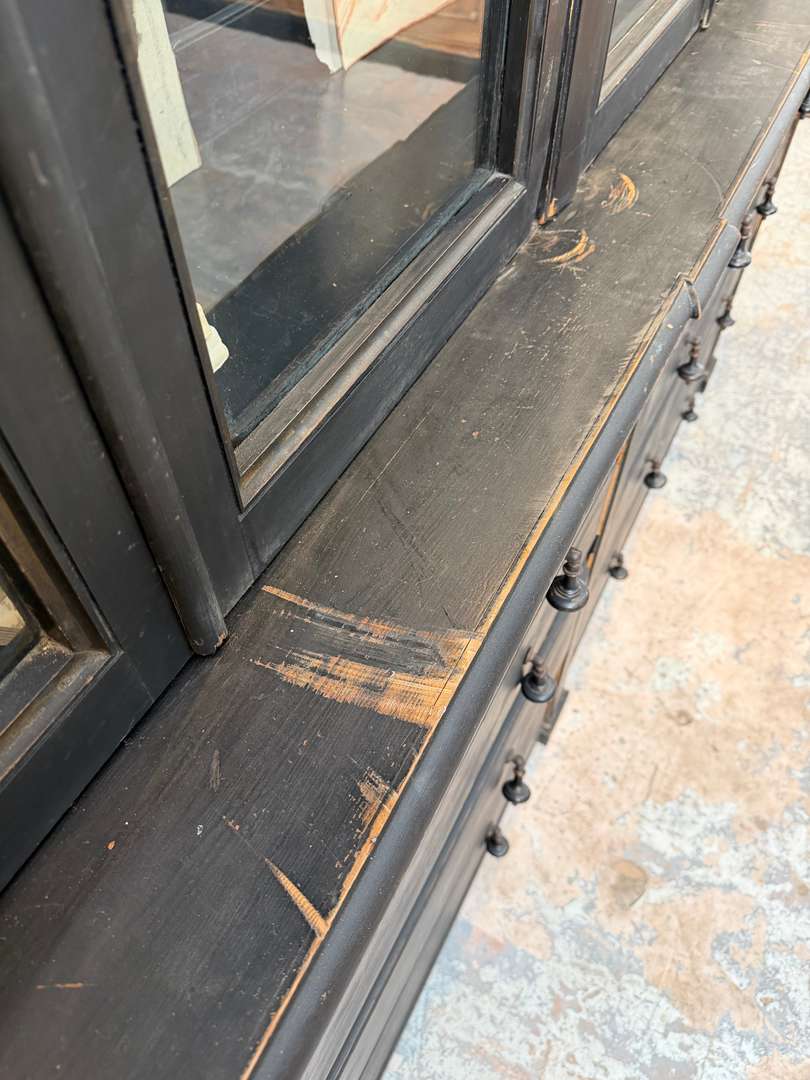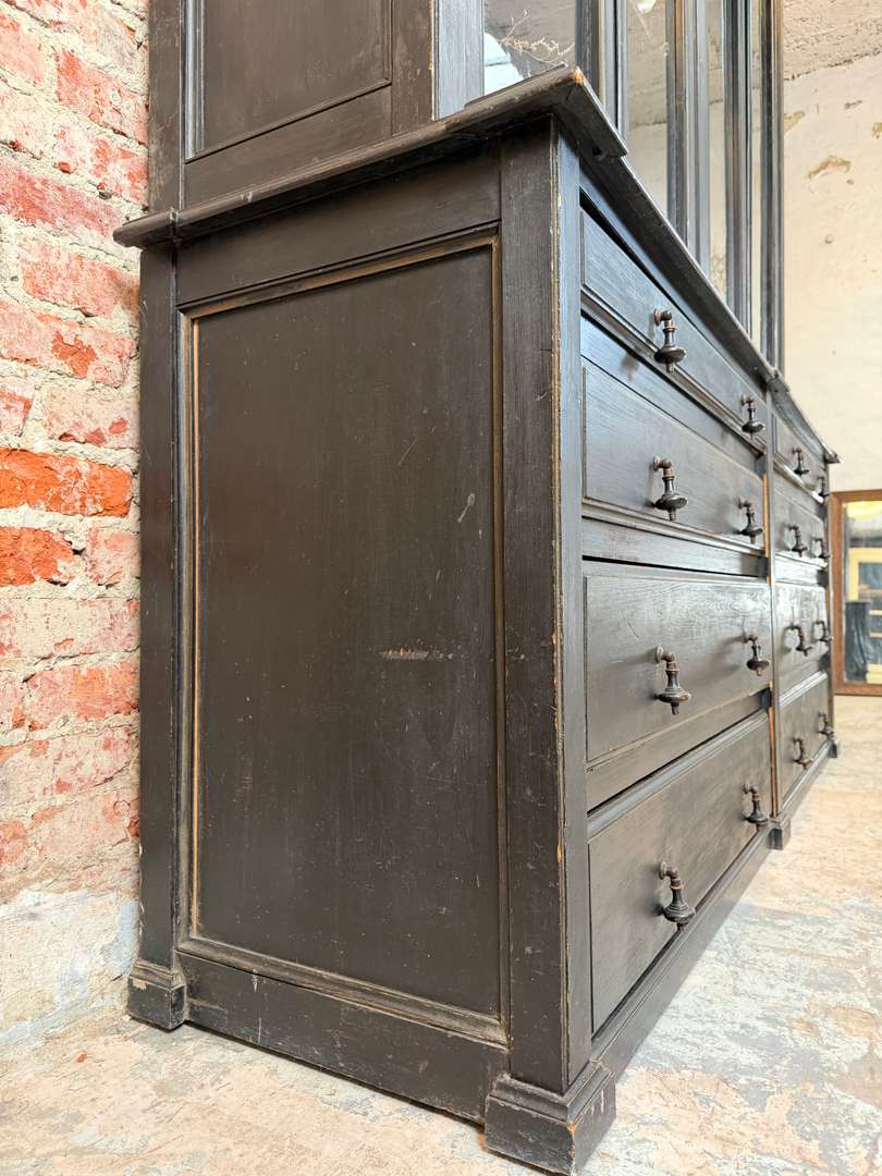 Ancienne bibliothèque vitrée en bois noir d’origine datant de la fin du XIXeme siècle, époque Napoléon III. Elle se compose de deux parties et possède de jolis verres bullés d’origine. Deux étagères sont actuellement en place et une troisième est disponible. Les tiroirs sont fonctionnels et les portes ferment correctement (pas à clé).
