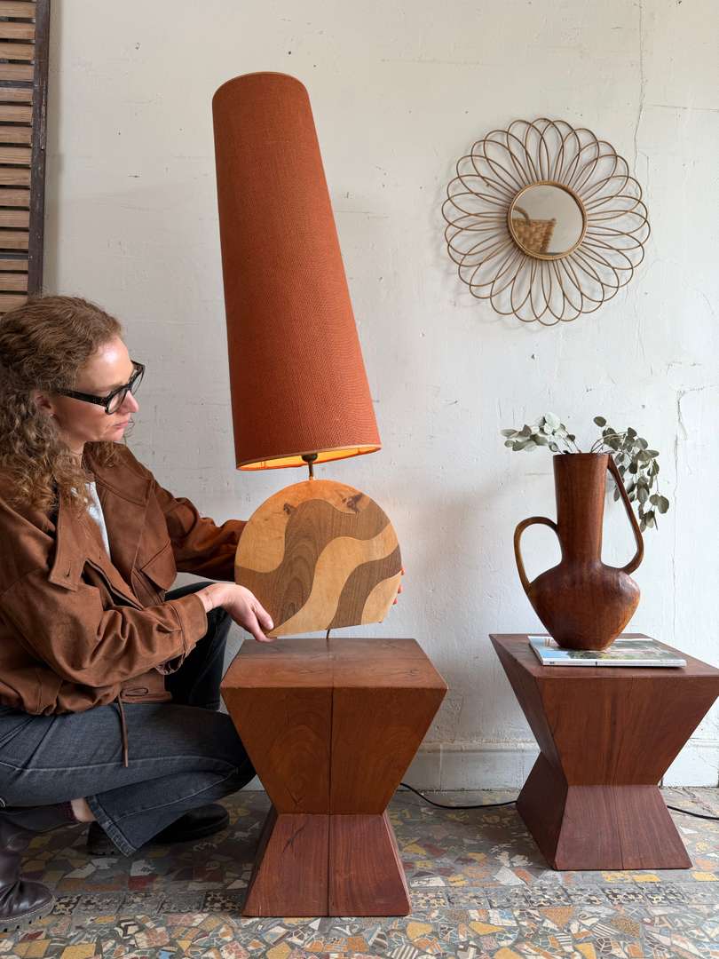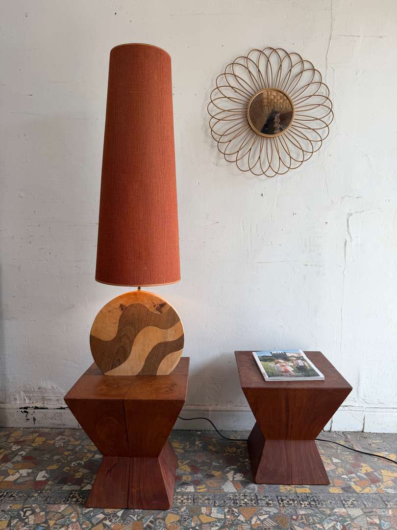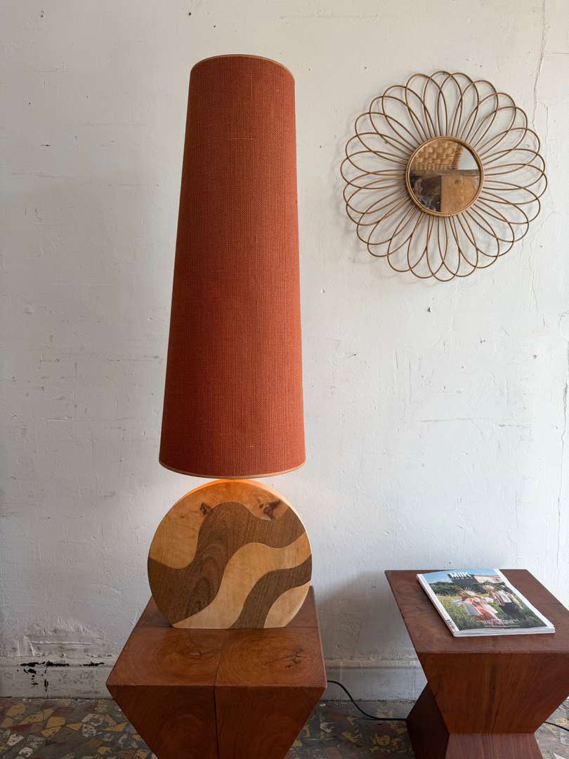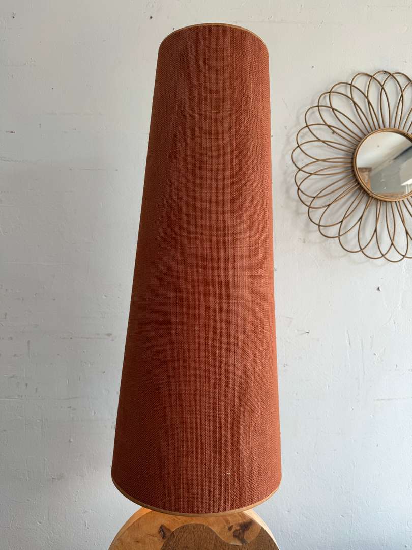 Abat-jour en tissu vintage dans un ton chaud, qui diffuse une lumière douce. Peut être placée dans un salon ou une chambre.