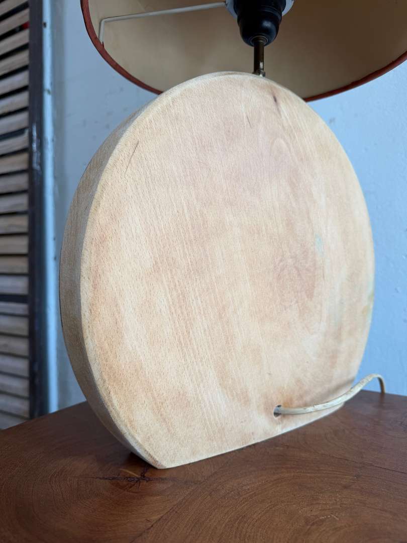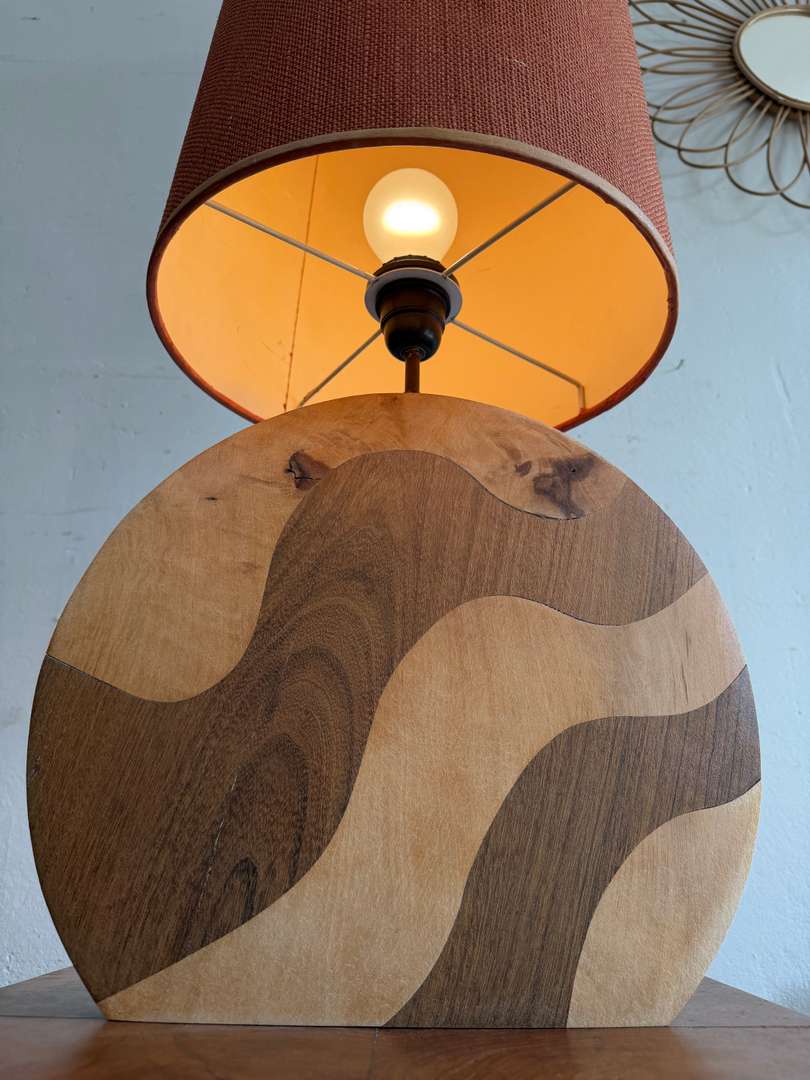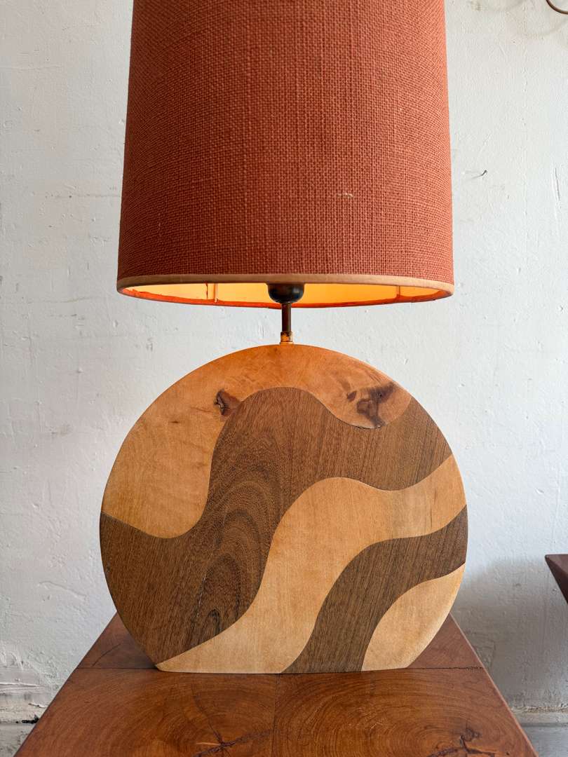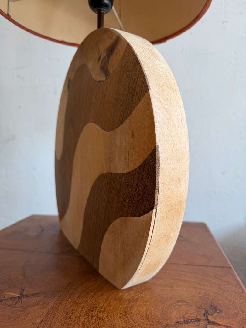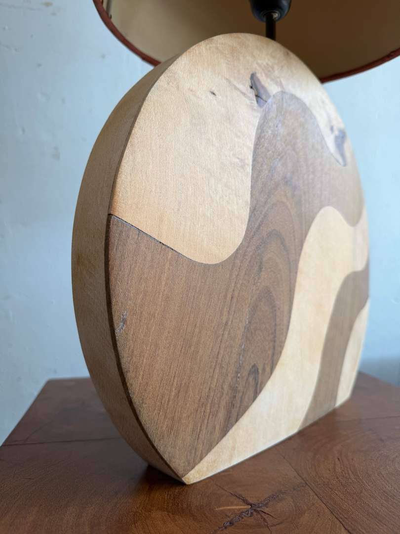 Grande lampe des années 70 avec un pied en bois d’érable et de noyer à décor ondulé.