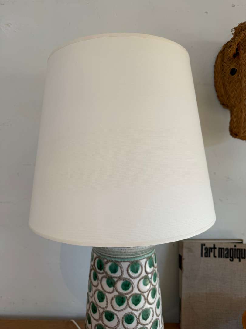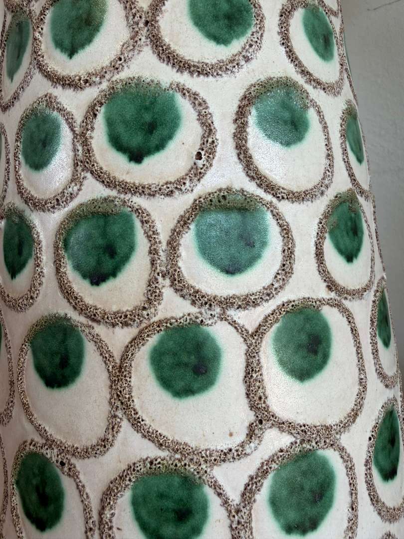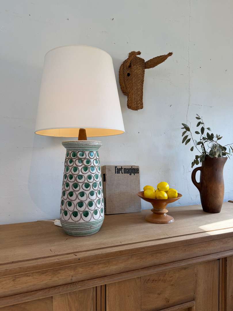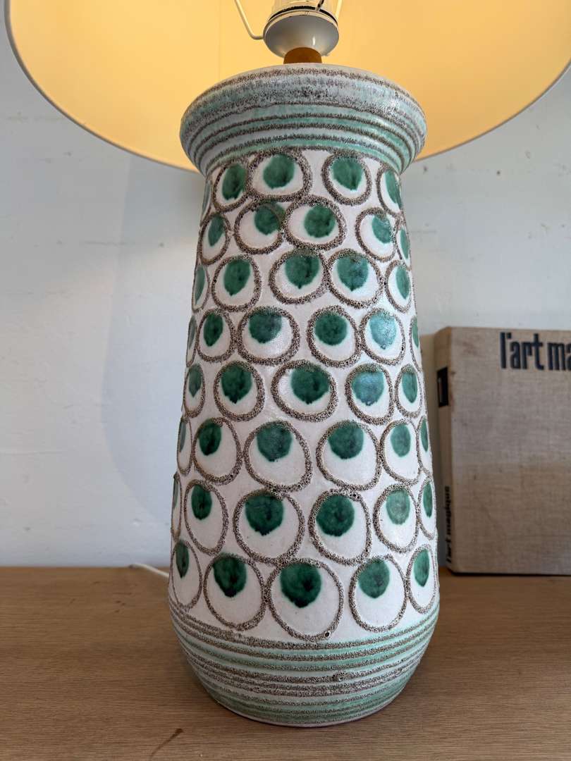 Grande lampe en céramique à décor graphique de pastilles vertes, typique des années 60.