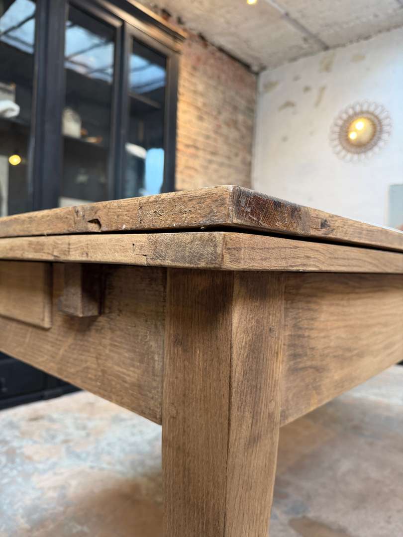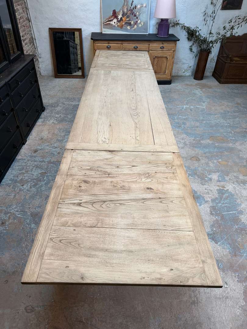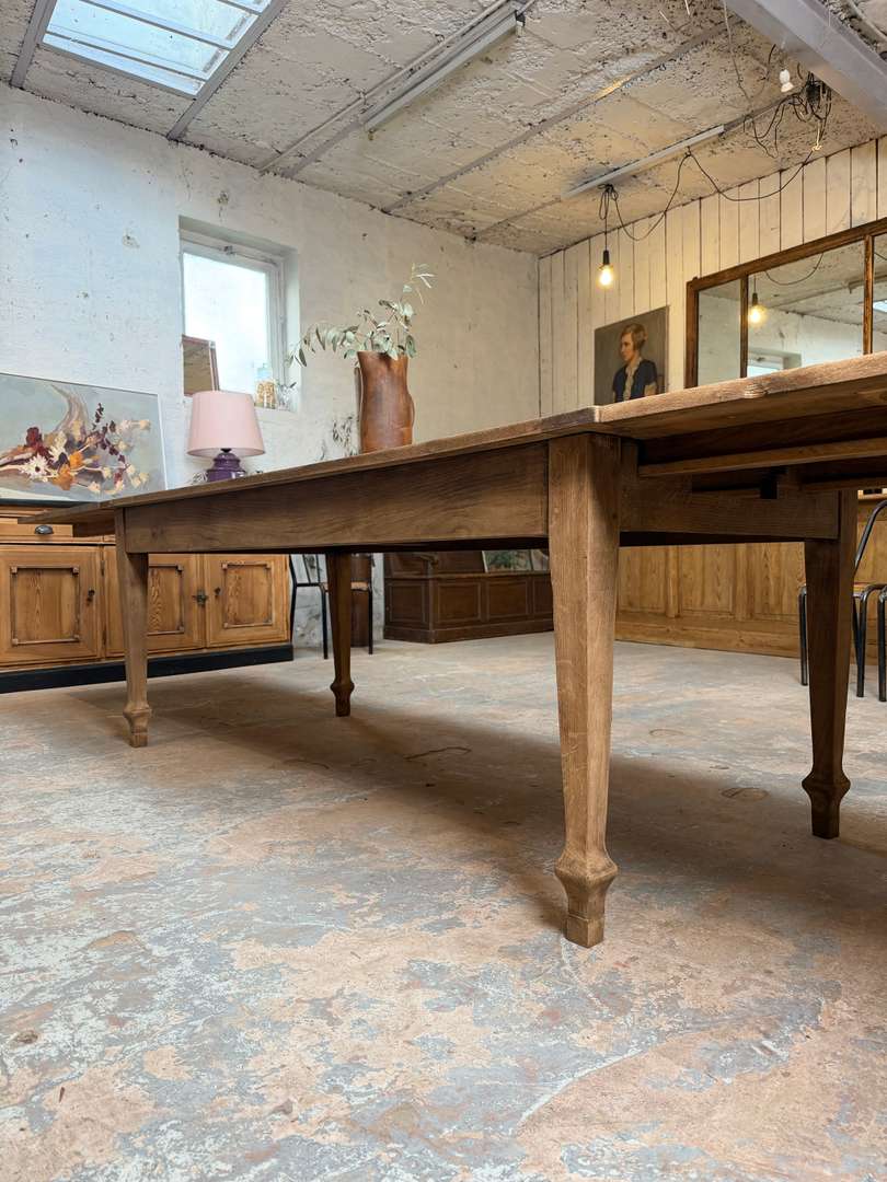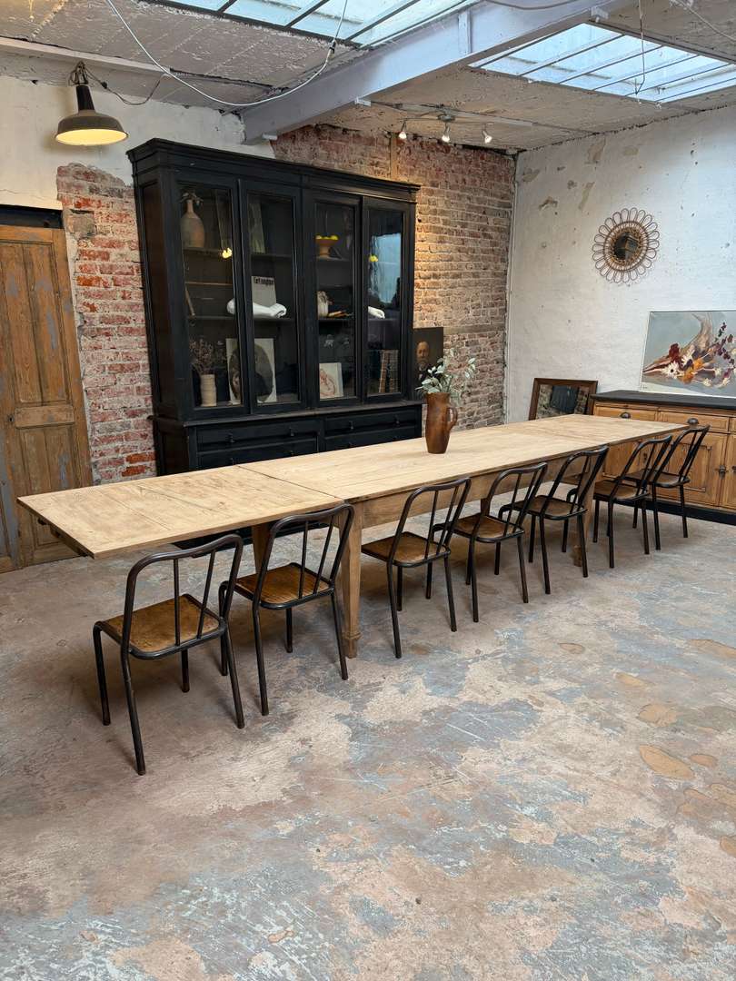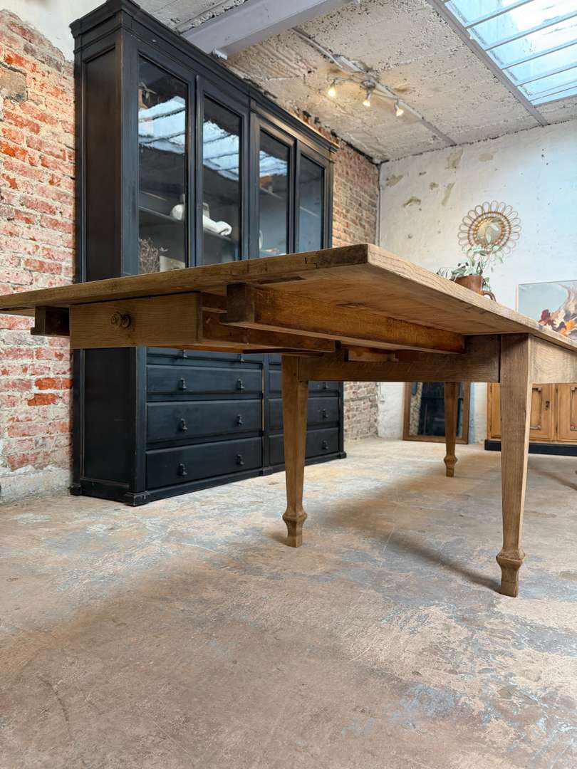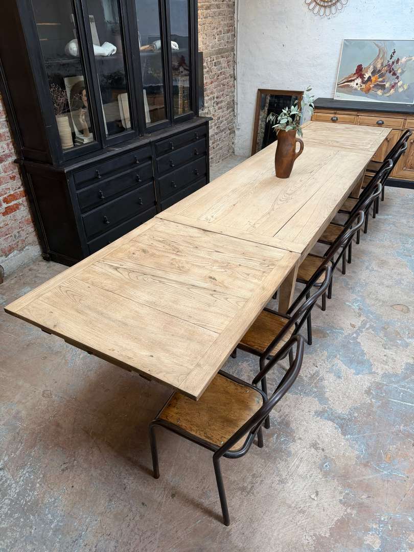 Ancienne table en chêne du début du XXe siècle avec rallonges. Elle passe de 2 à 4 mètres et peut accueillir jusqu’à 16 personnes.