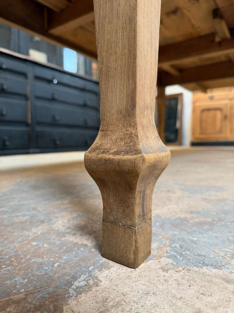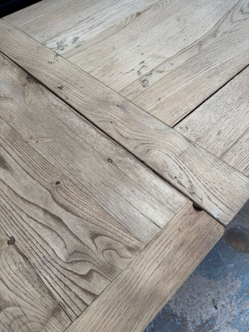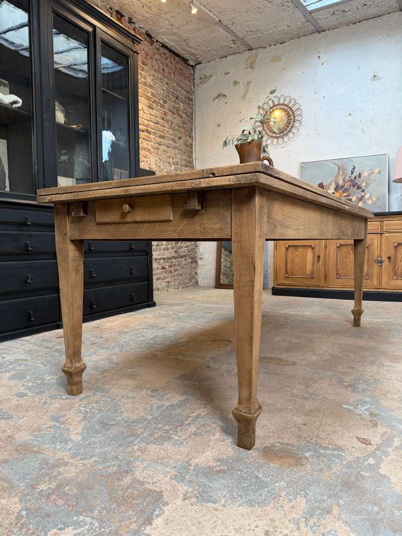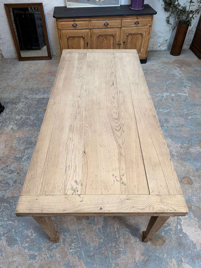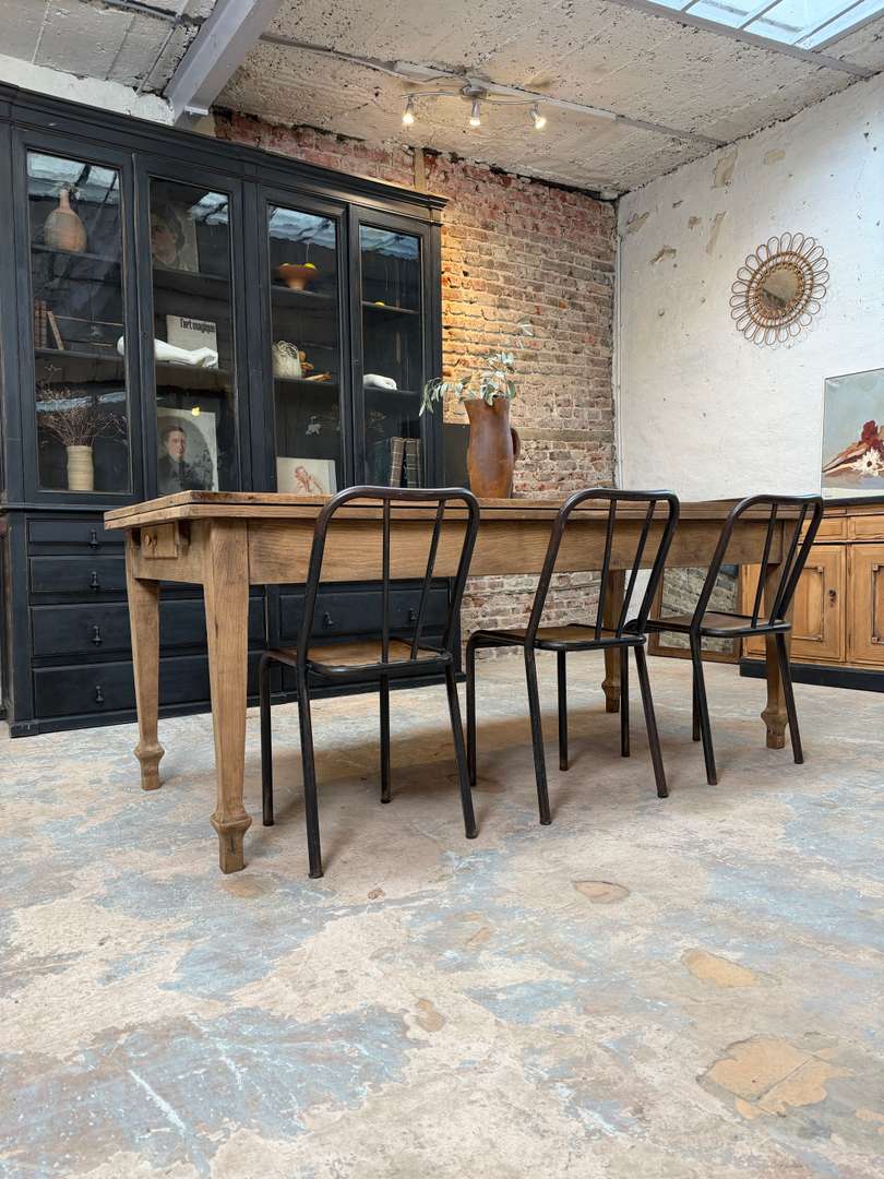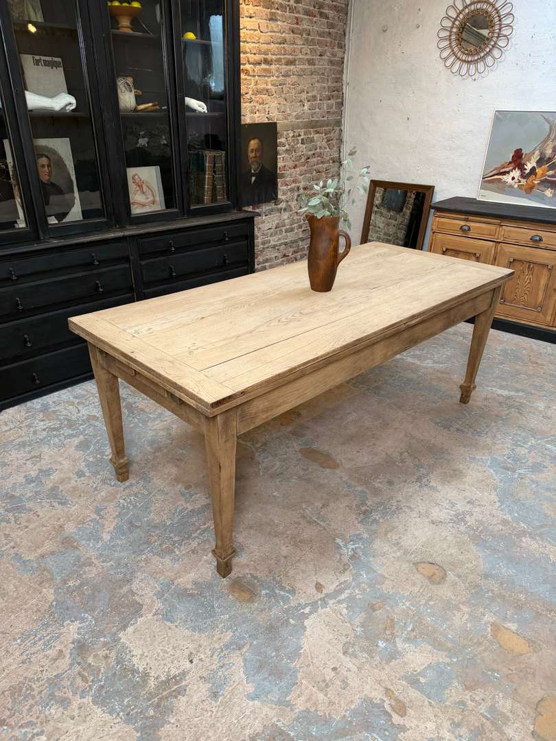 Ancienne table en chêne du début du XXe siècle avec rallonges. Elle passe de 2 à 4 mètres et peut accueillir jusqu’à 16 personnes.