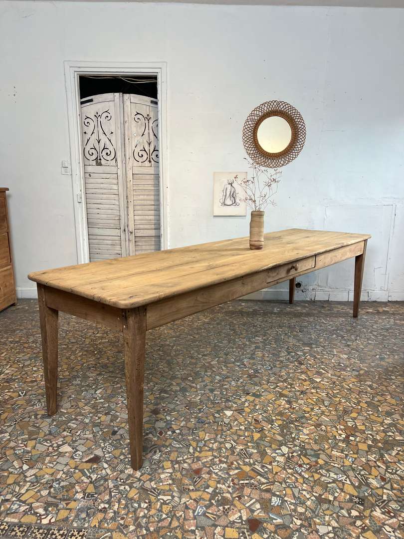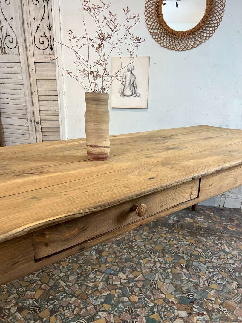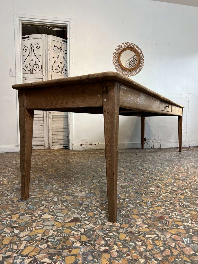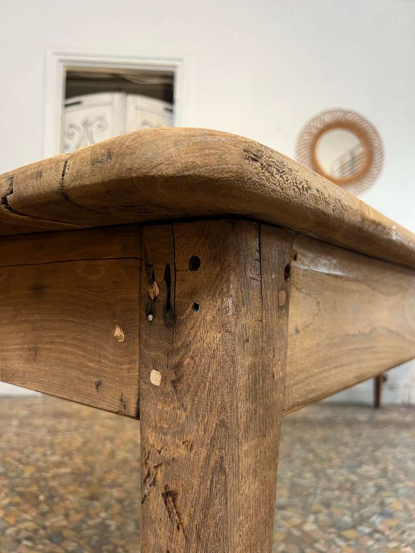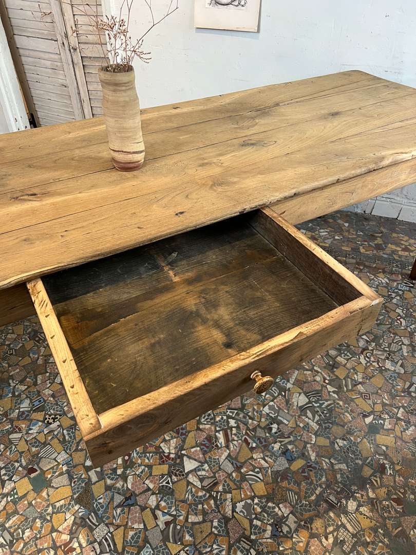 Grande table de ferme en châtaignier 1500 € Ajouter au panierAncienne table du XIXᵉ siècle en châtaignier massif. Plateau en bois brut, belle patine, un tiroir en ceinture. Idéale pour les grandes tablées, jusqu’à 10/12 personnes. #tableancienne #chataignier #mobilierancienDimensionsLargeur285 cmProfondeur78 cmHauteur76 cmHauteur dessous bandeau61 cmRenseignementsRéférence2551011