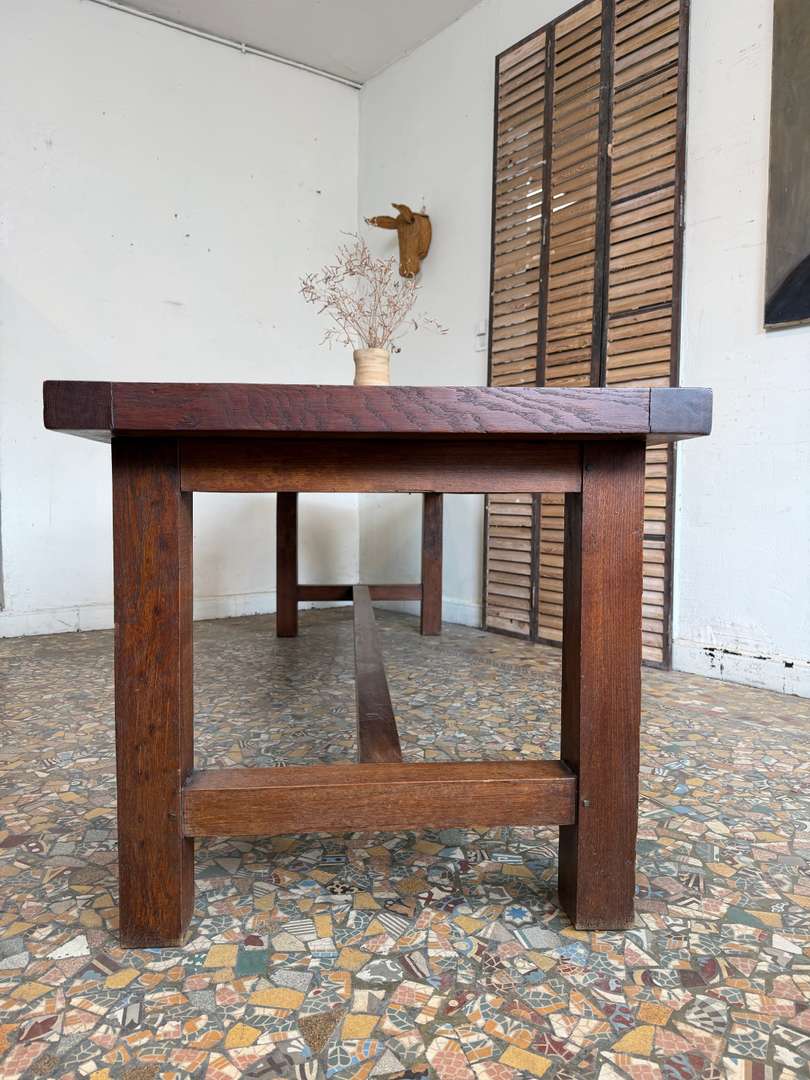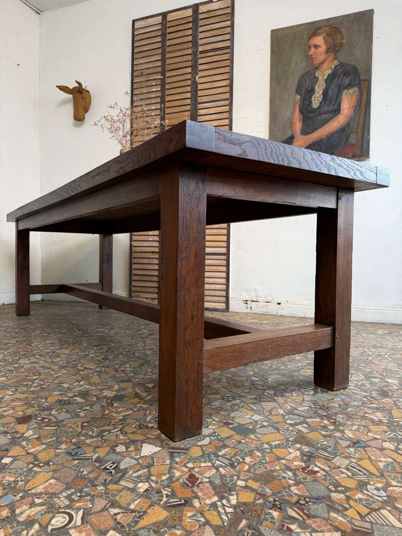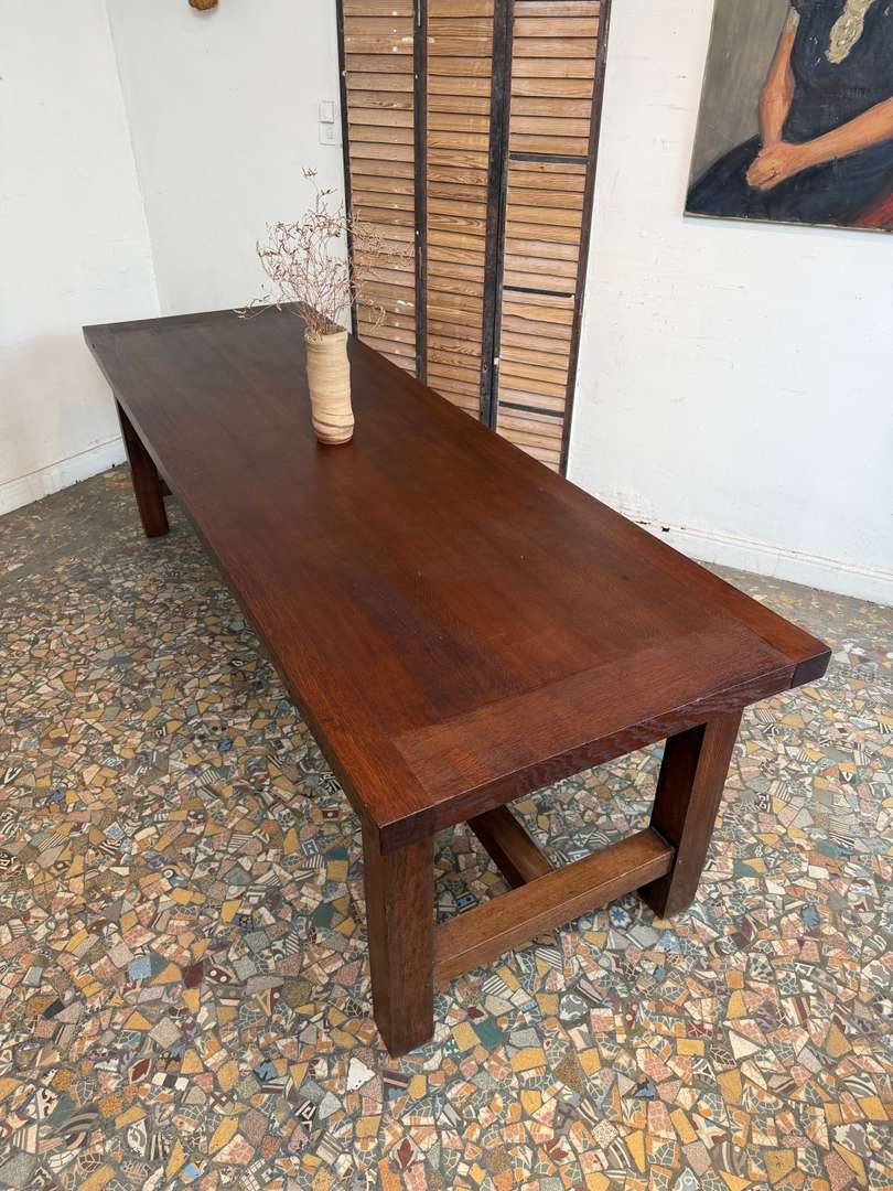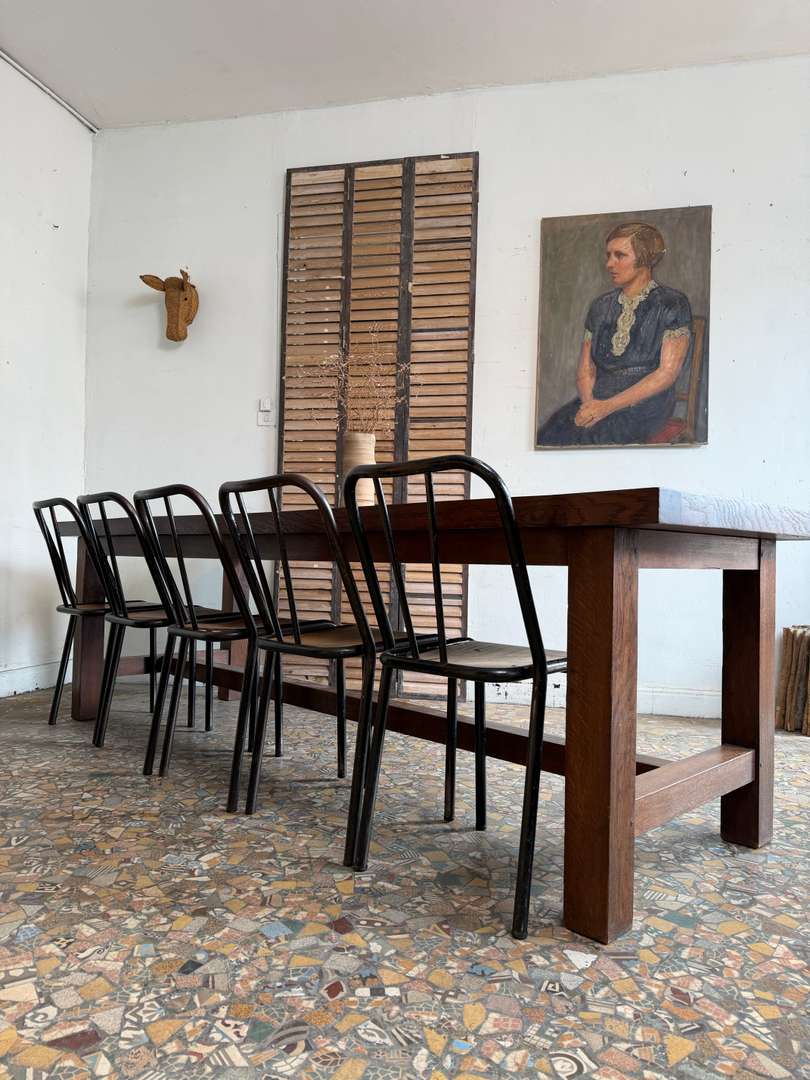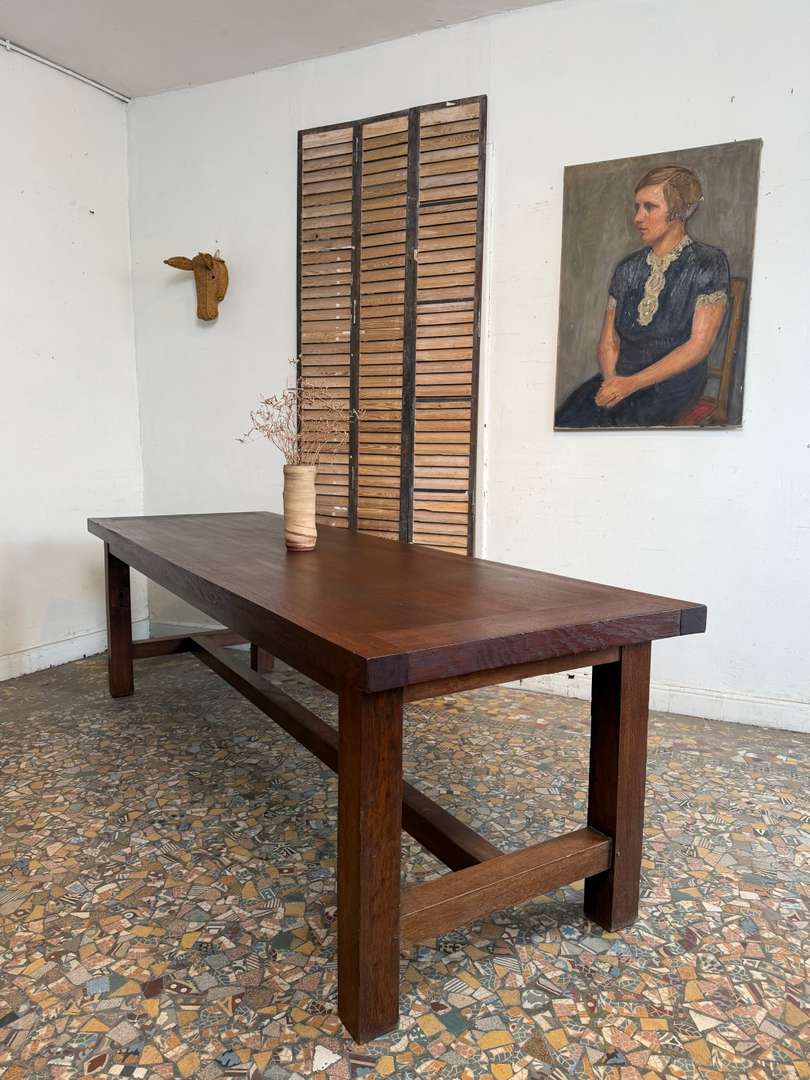 Elle peut accueillir facilement 10 à 12 personnes, idéale en table de salle à manger ou grande table de travail. Le plateau présente une belle patine, avec quelques marques du temps qui participent à son charme.
