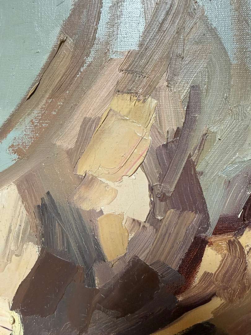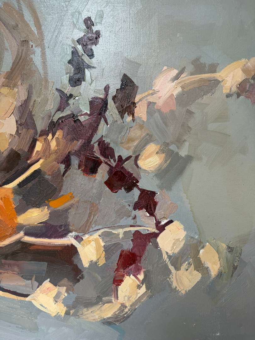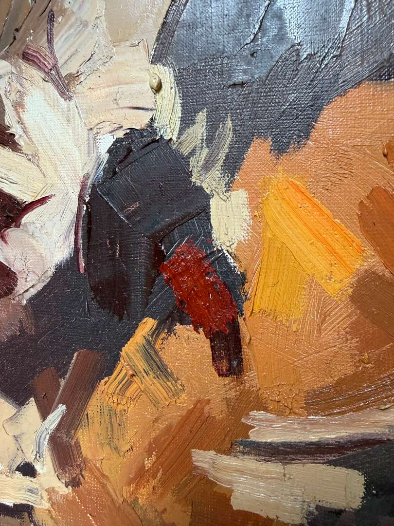 Cette huile sur toile signée René Guinand représente un bouquet traité de manière libre et expressive. La matière est présente, avec des touches épaisses et des couleurs chaudes.