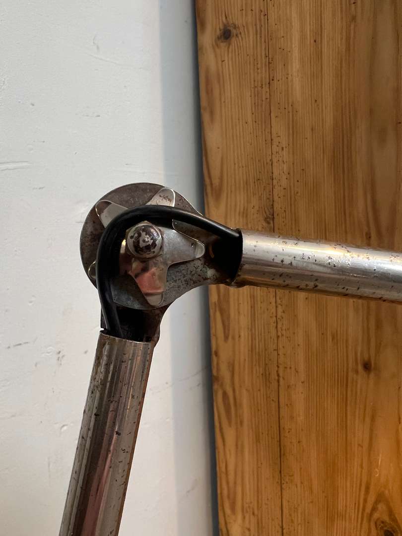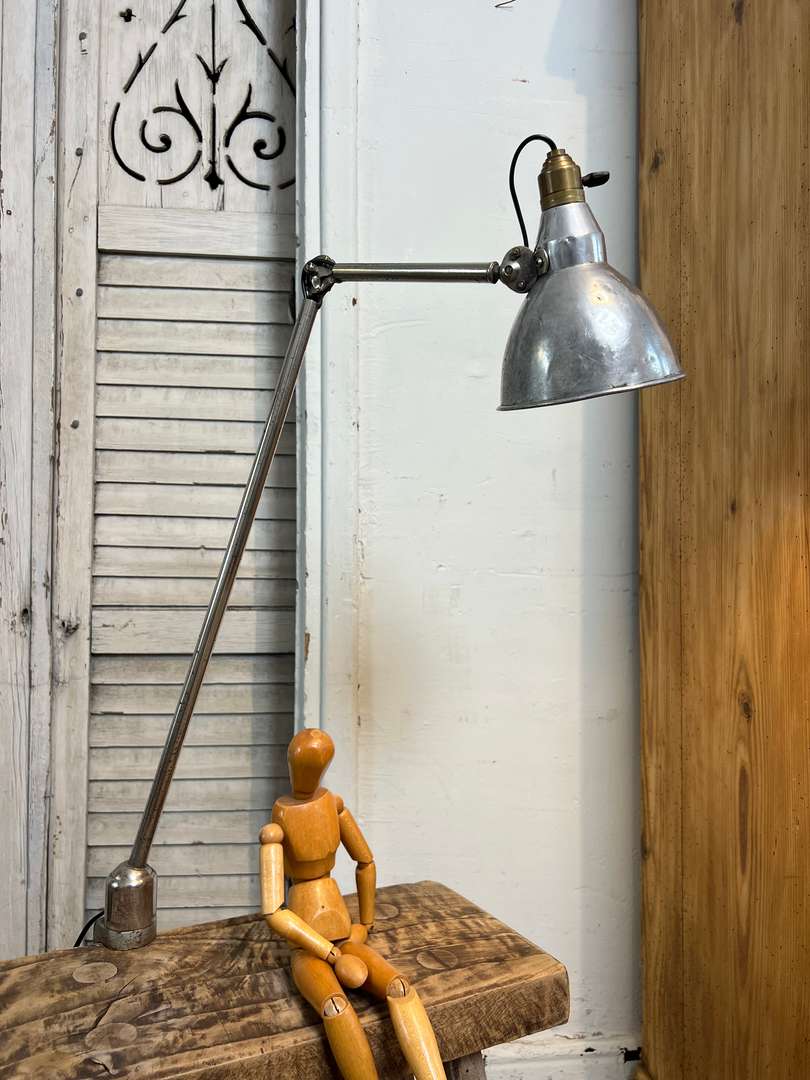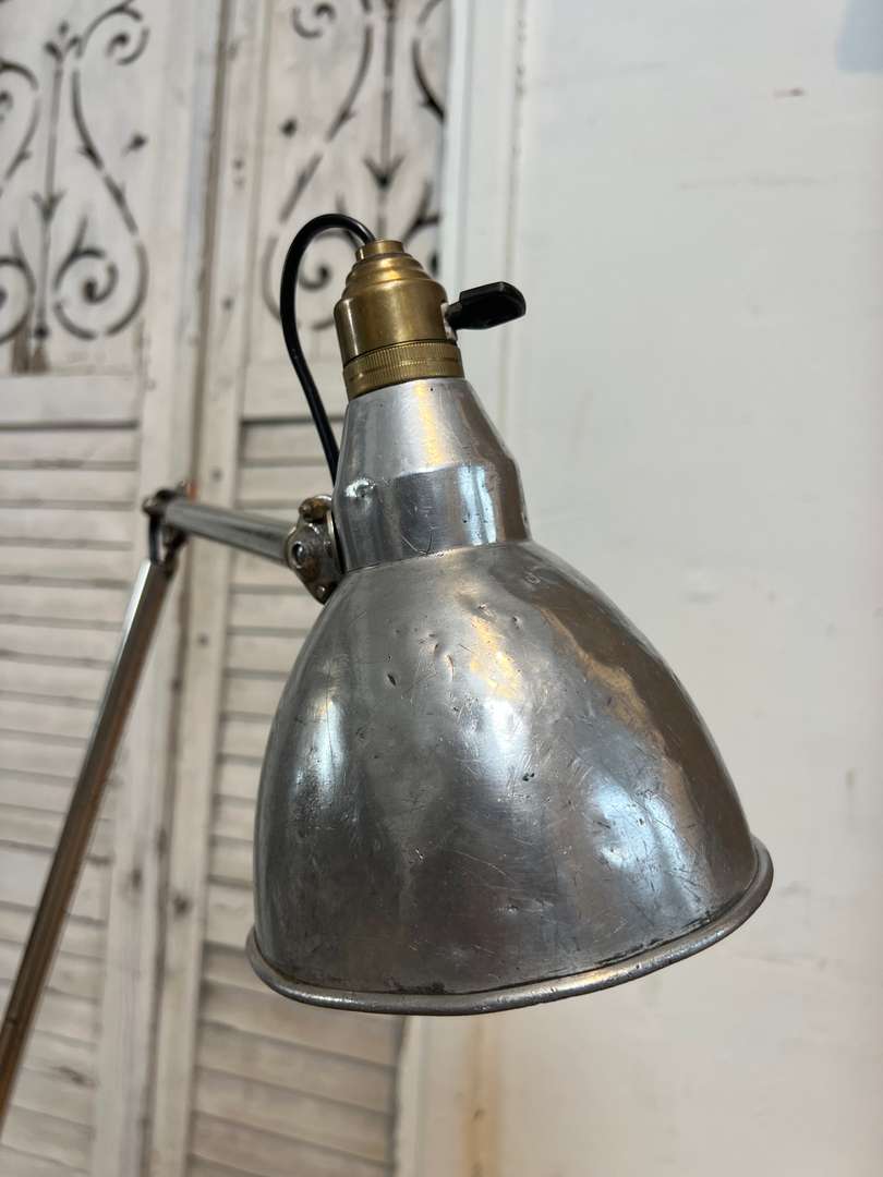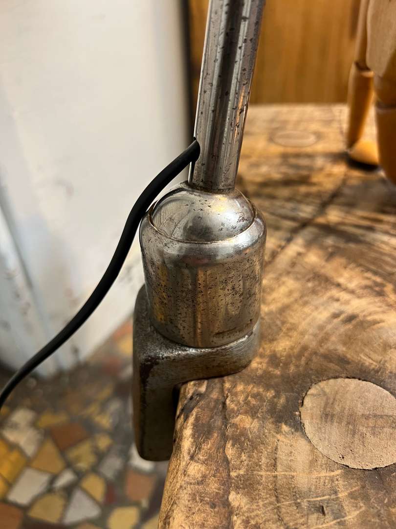 Ancienne lampe d’atelier Mazda, modèle à étau, typique des années 40. Elle est entièrement chromée, articulable grâce à ses bras réglables et se fixe facilement sur un plateau grâce à son étau d’origine. Une vraie lampe d’architecte, idéale en bureau, atelier ou en lampe d’appoint. Électricité refaite.