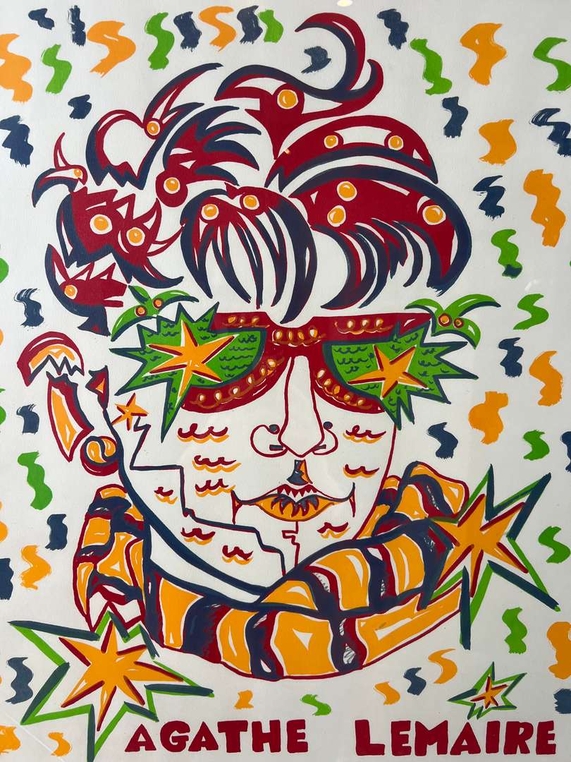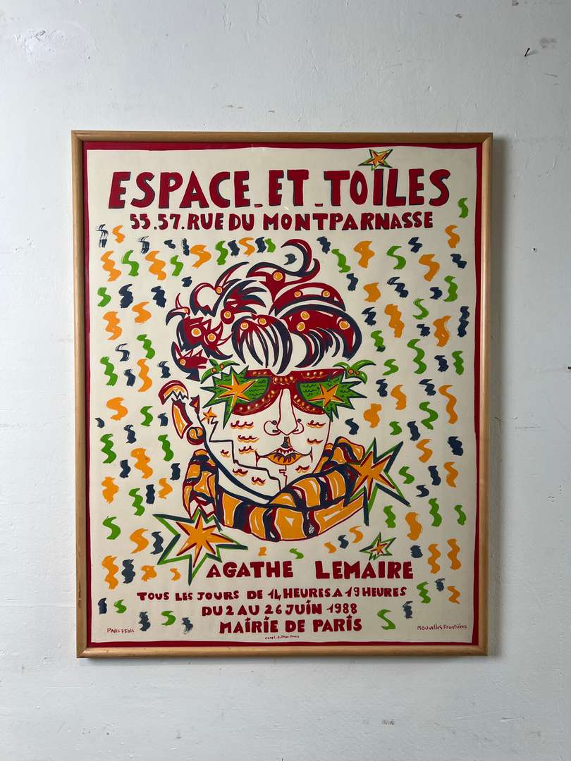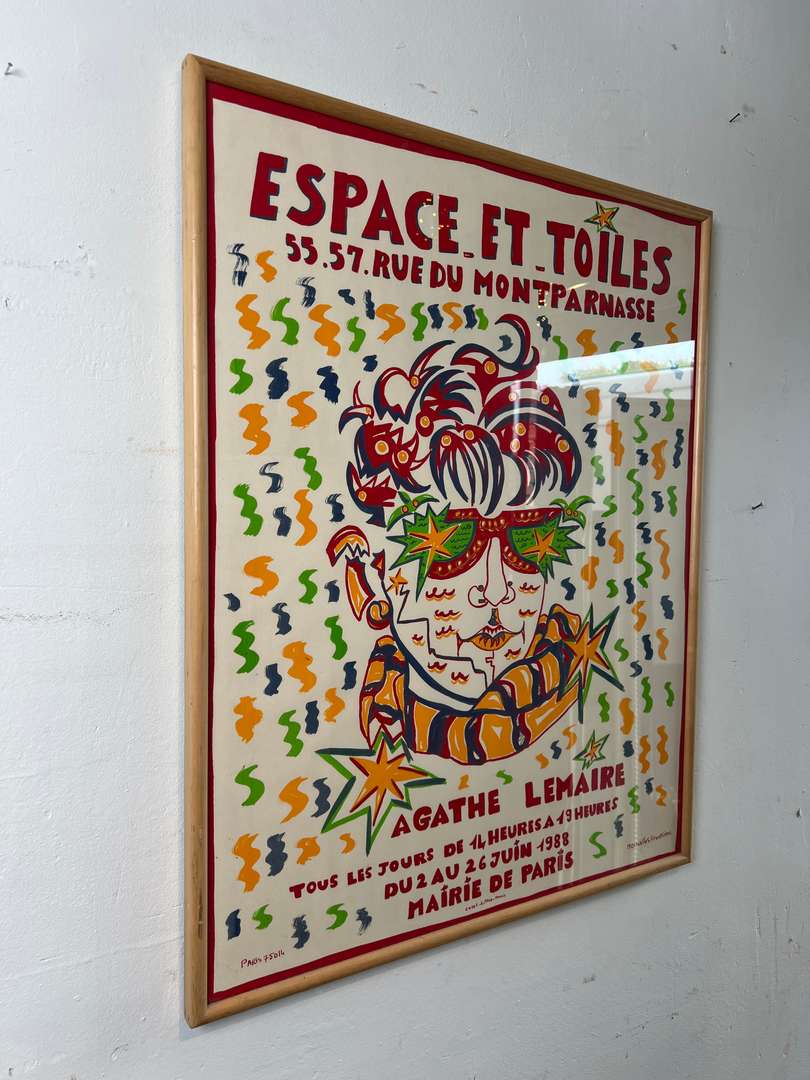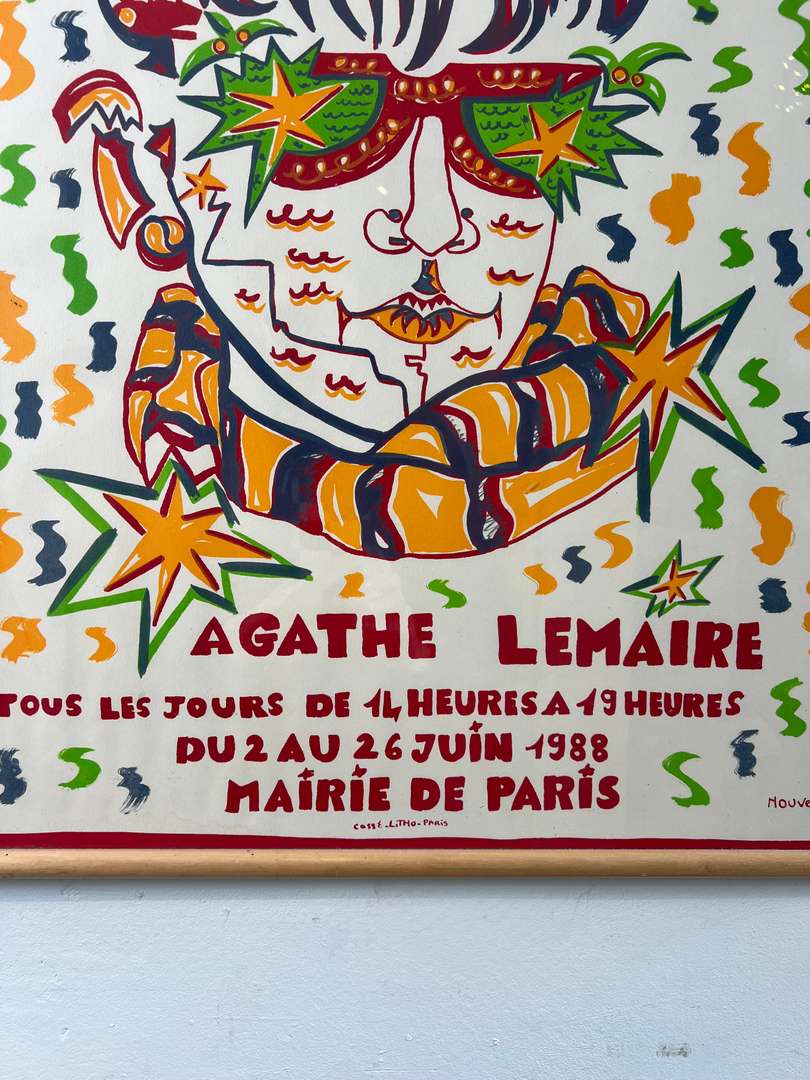Lithographie colorée datant des années 80, représentant une affiche d’exposition de l’artiste Agathe Lemaire à la Mairie de Paris en 1988. L’œuvre est placée sous verre dans un encadrement en hêtre. Une pièce graphique et décorative au charme typiquement années 80.