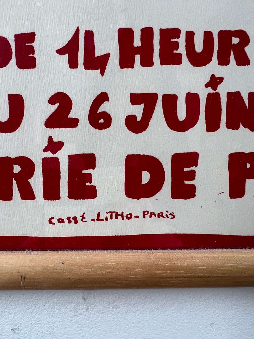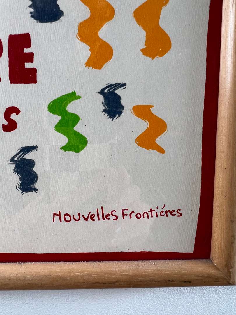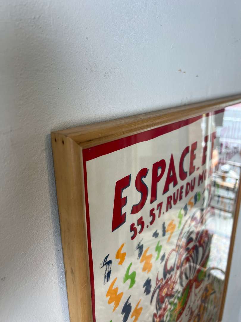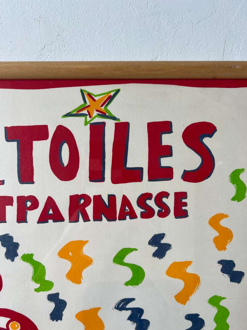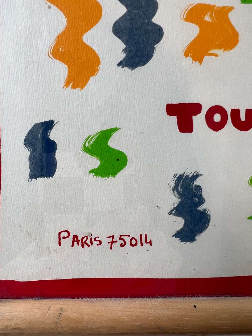 Lithographie colorée datant des années 80, représentant une affiche d’exposition de l’artiste Agathe Lemaire à la Mairie de Paris en 1988. L’œuvre est placée sous verre dans un encadrement en hêtre. Une pièce graphique et décorative au charme typiquement années 80.