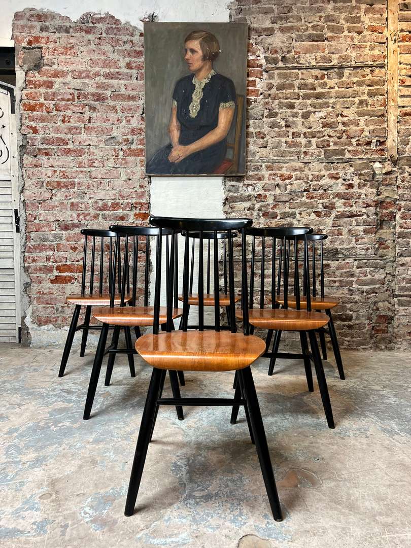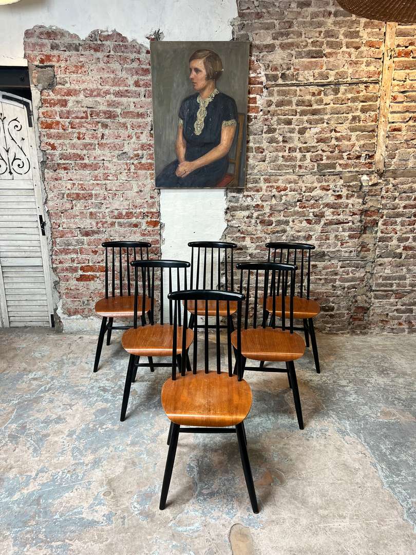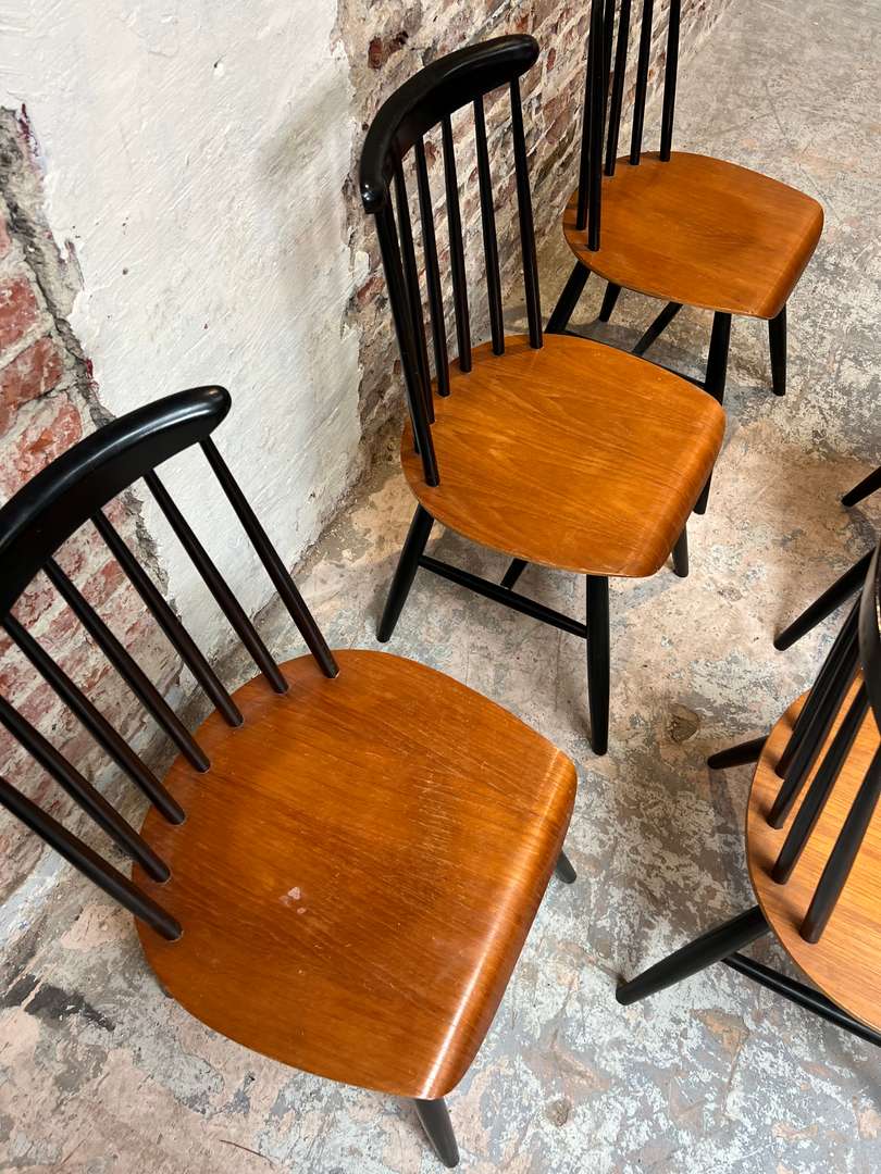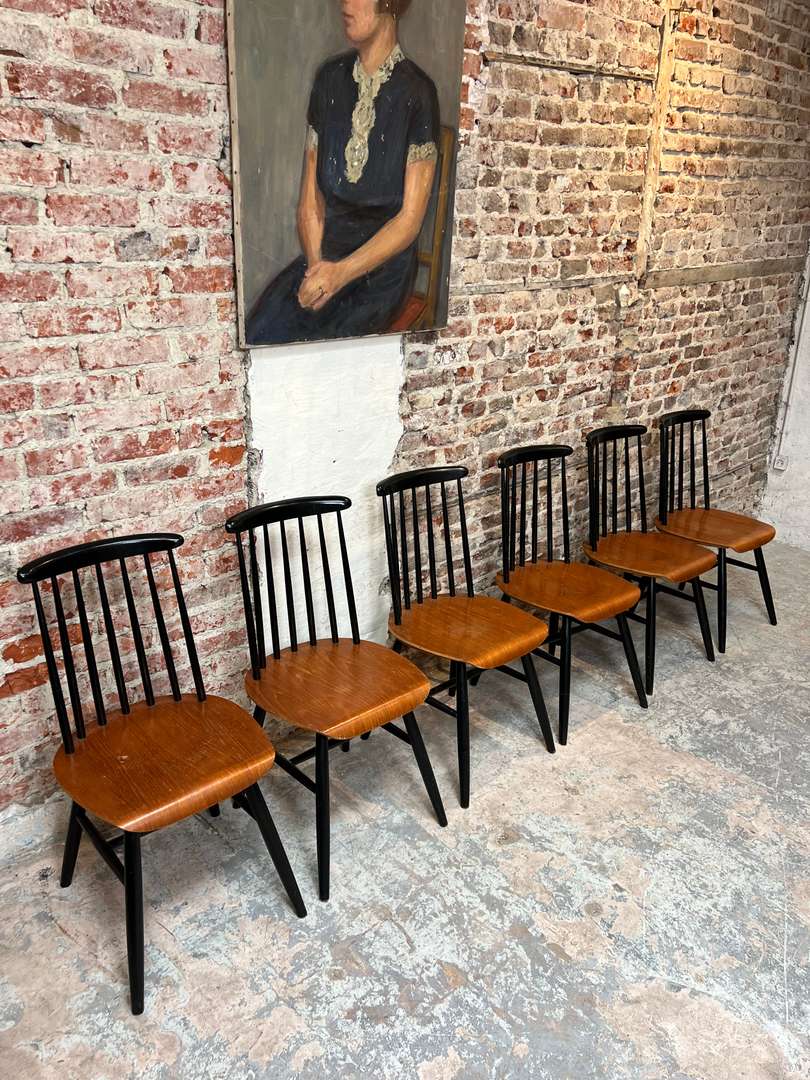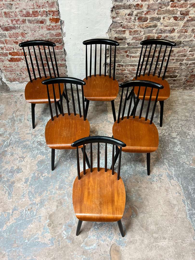 Ensemble de six chaises des années 60 Tapiovaara. Elles présentent une assise en bois naturel et une structure noire à barreaux fins. Un design scandinave iconique, en superbe état de conservation. À noter : l’une des chaises conserve encore son étiquette de livraison d’époque.