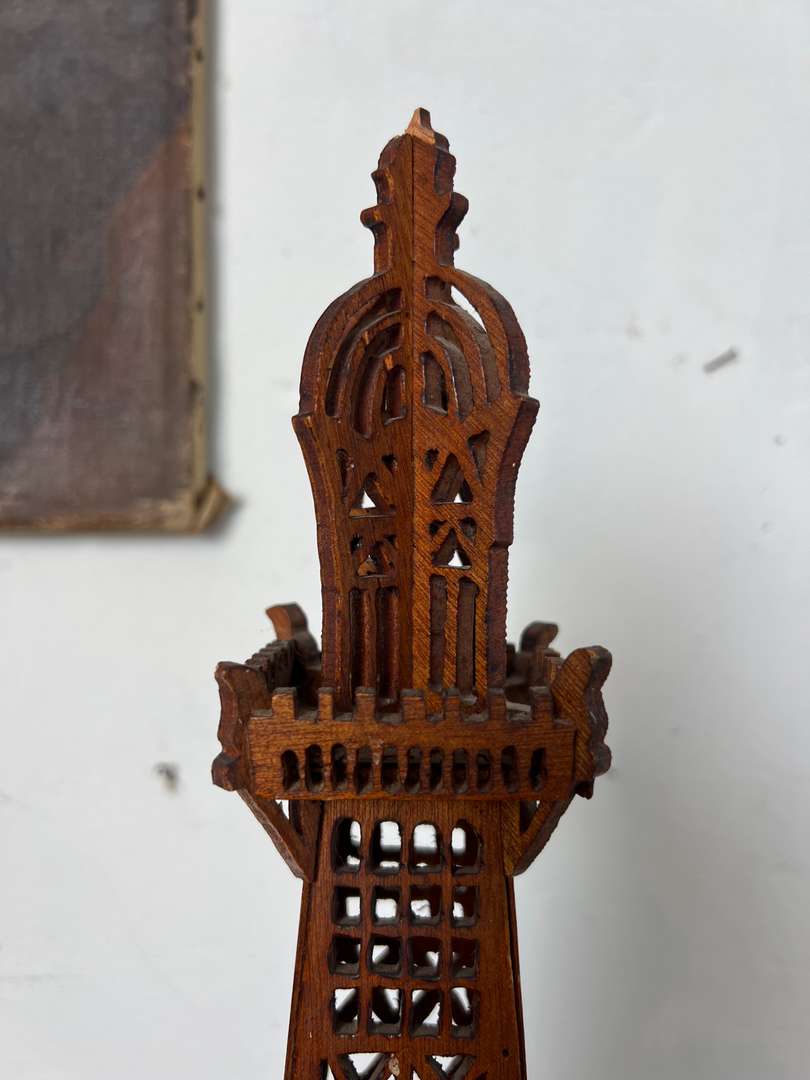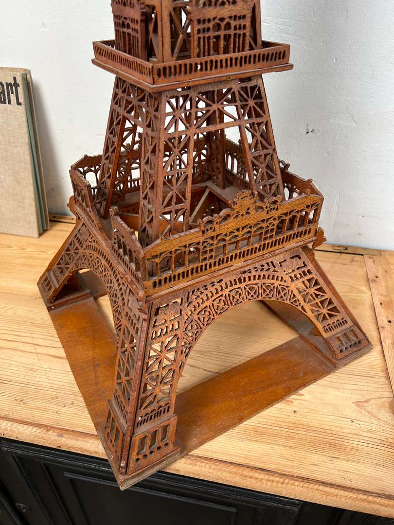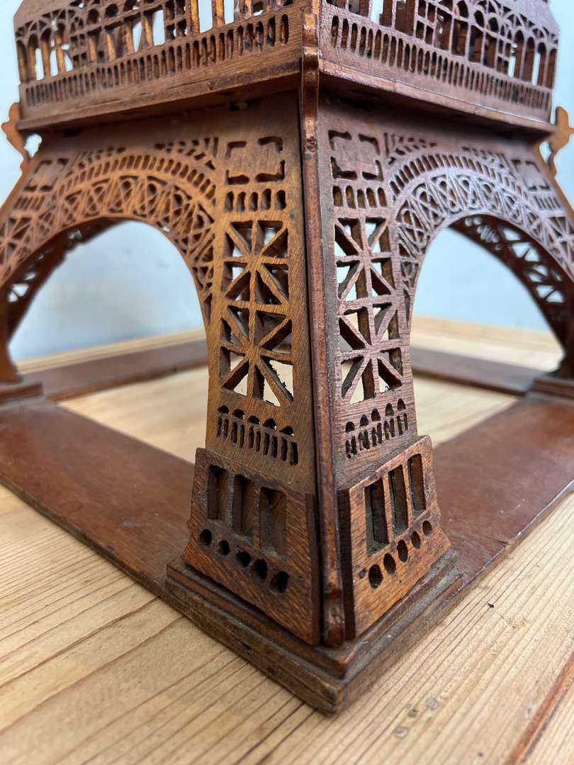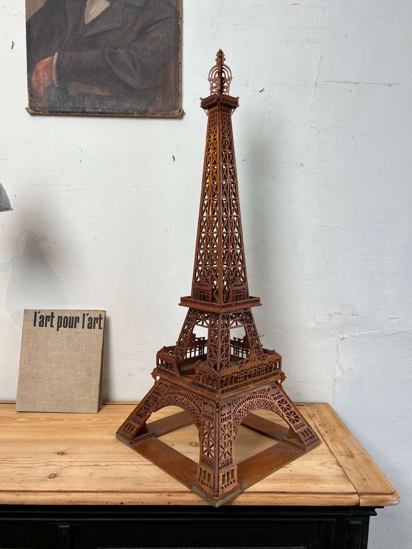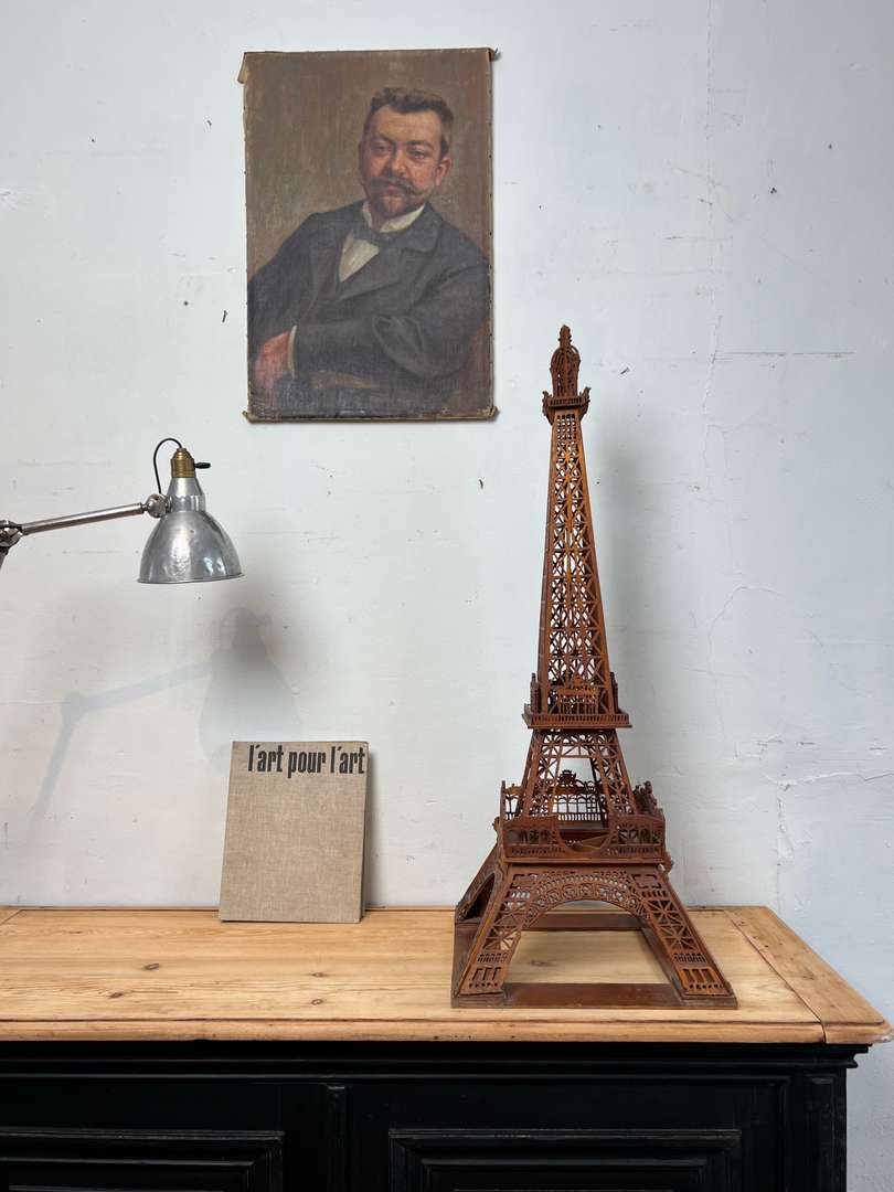 Cette ancienne maquette de la Tour Eiffel, réalisée autour des années 1900, est entièrement découpée dans le bois. Un travail minutieux d’art populaire français, avec de nombreux détails ajourés qui reprennent la structure emblématique du monument. Un bel objet décoratif, rare et plein de charme.