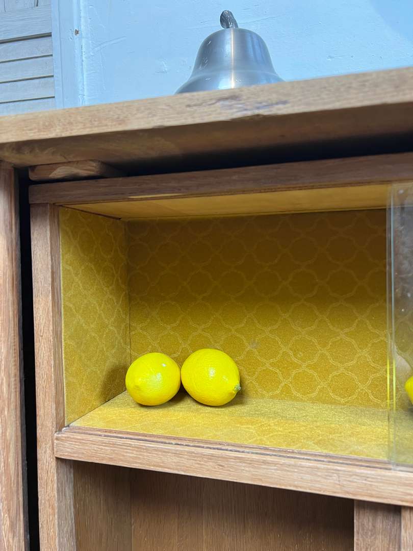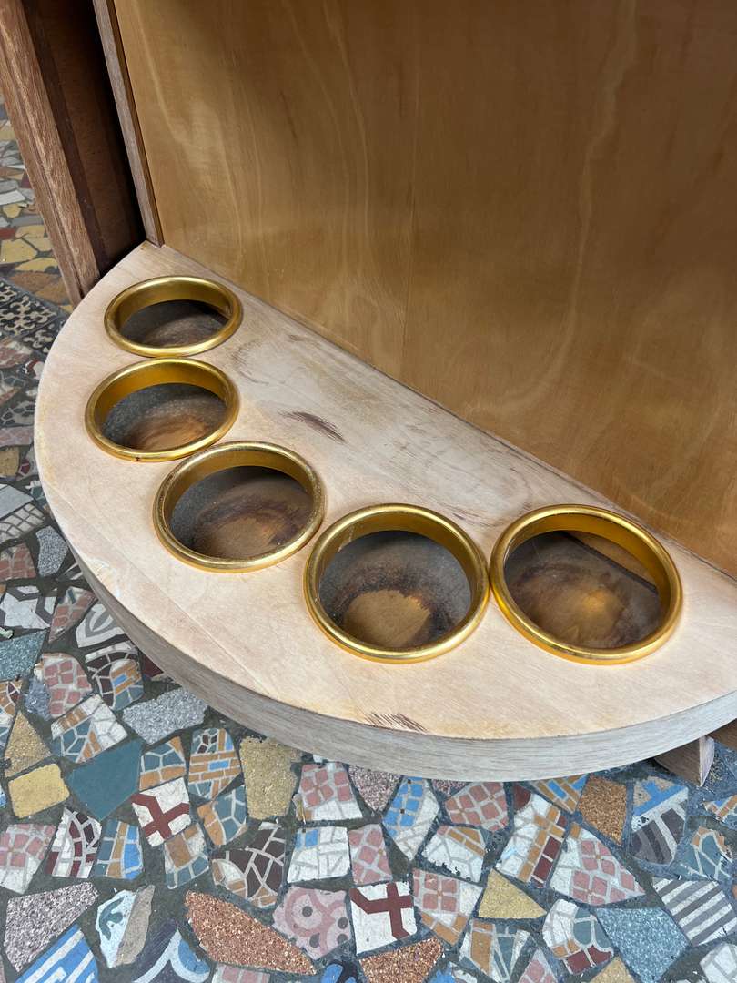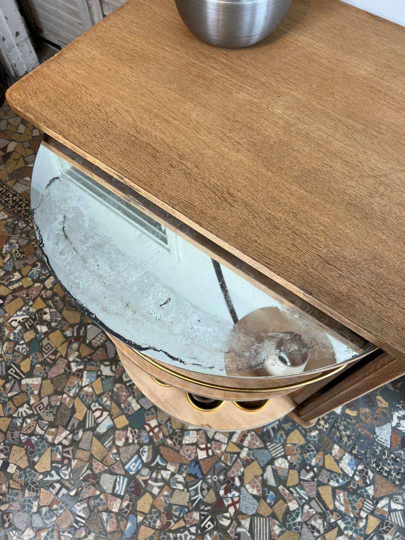 Original meuble bar vintage en chêne et contreplaqué chêne. Monté sur roulettes, il possède une partie intérieure pivotante à 360°. D’un côté, une partie rangement avec quatre portes coulissantes, dont deux vitrées ; de l’autre, un espace bar avec un miroir sur la partie supérieure, un rangement pour les verres et un compartiment pour les bouteilles. Un meuble pratique et plein de caractère, idéal pour une pièce de vie ou un coin détente.