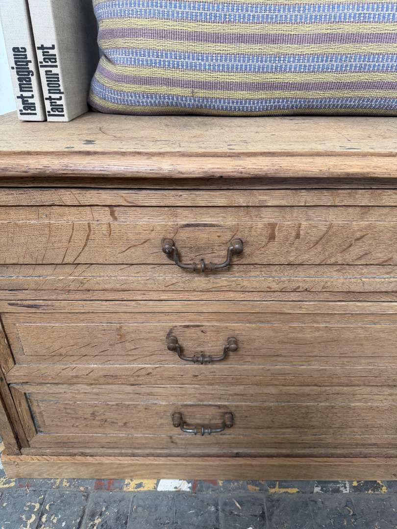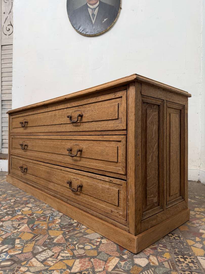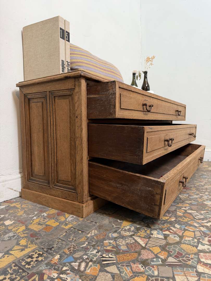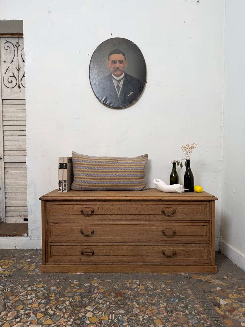 Ancien meuble bas en chêne datant du début du 20ᵉ siècle. Il est composé de trois tiroirs montés en queue d’aronde. Le bois présente une belle patine d’origine. Ce meuble peut aussi bien servir dans une entrée pour le rangement des chaussures qu’en meuble TV.