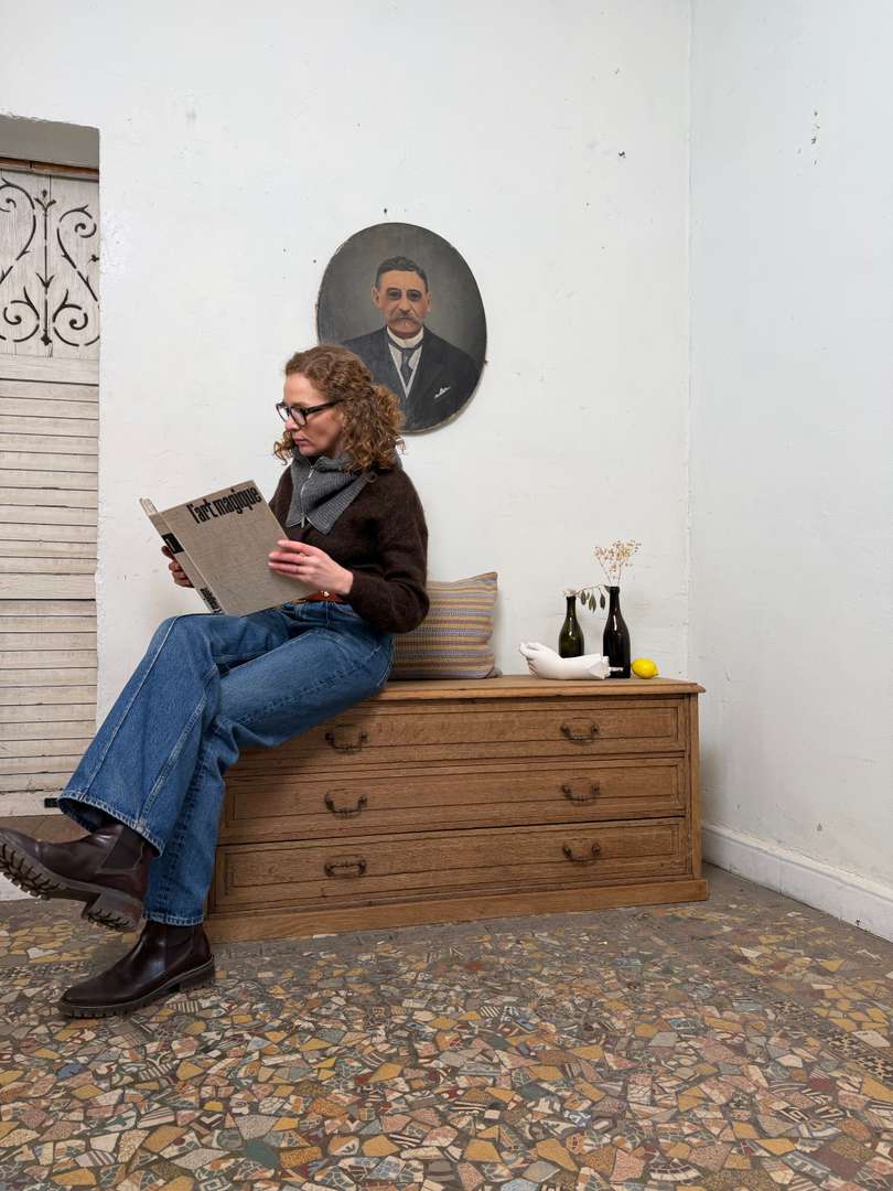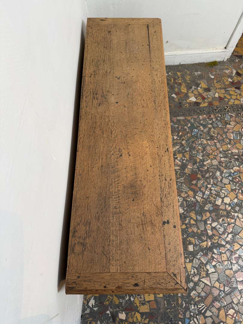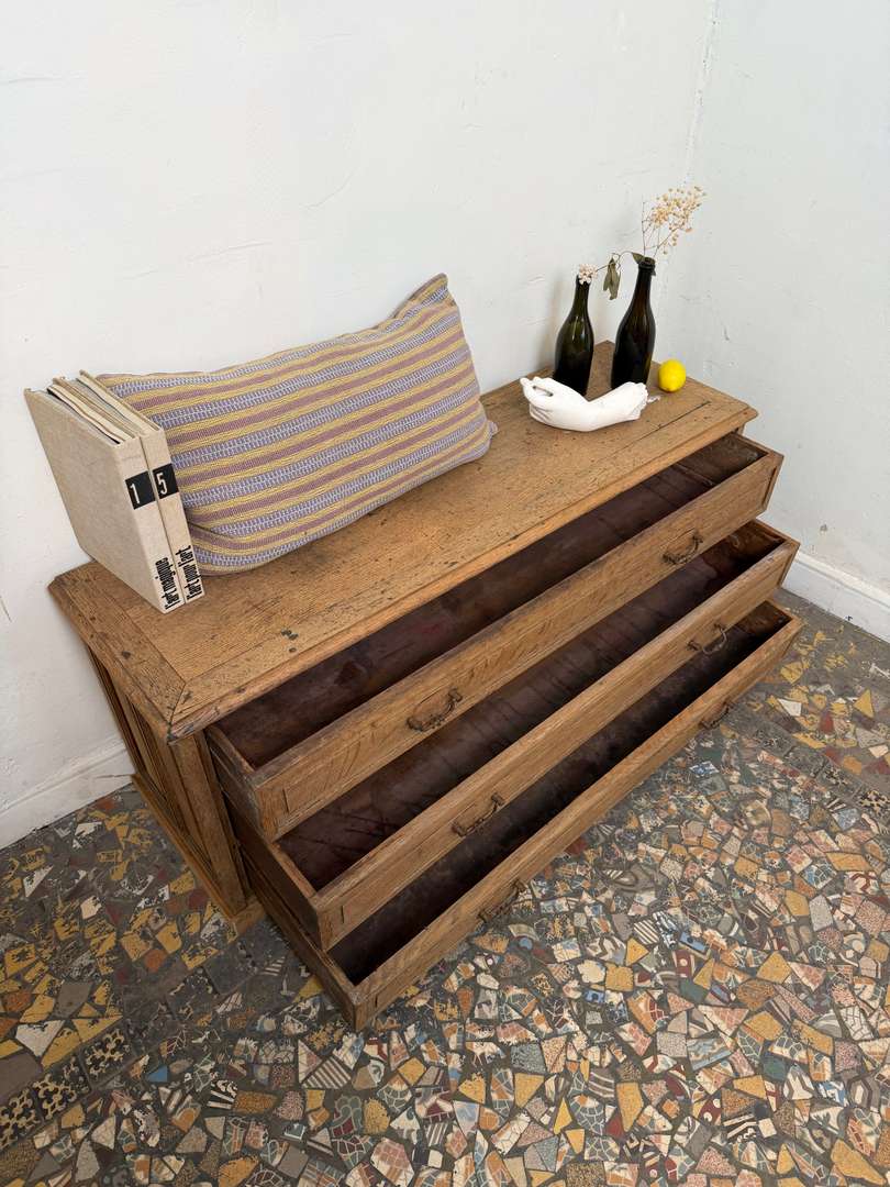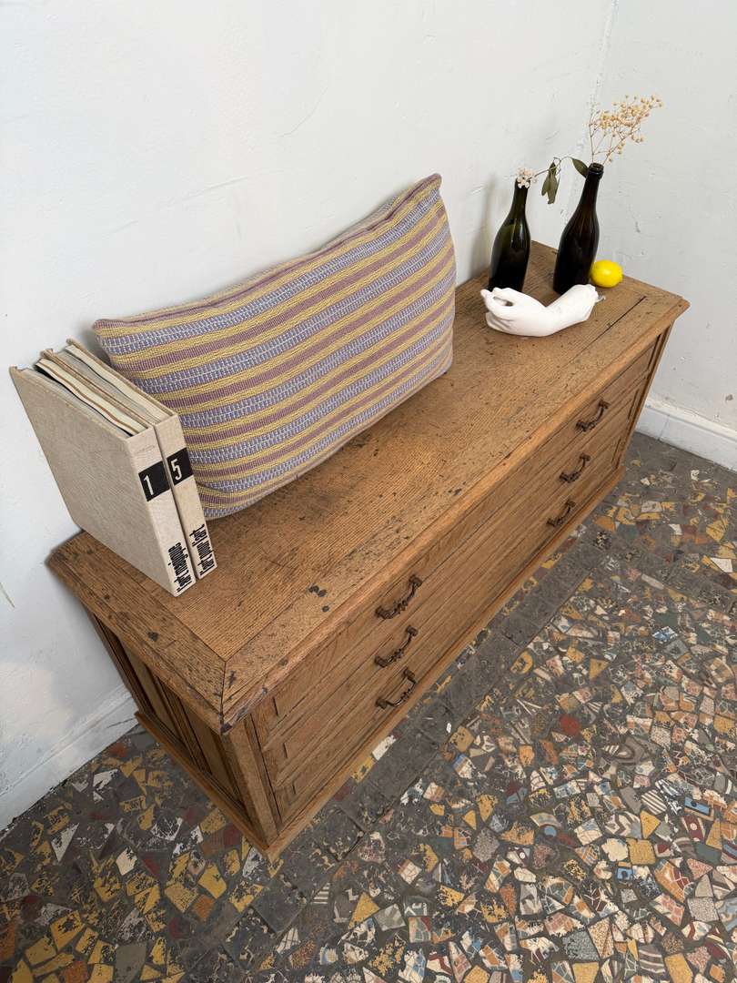 Ancien meuble bas en chêne datant du début du 20ᵉ siècle. Il est composé de trois tiroirs montés en queue d’aronde. Le bois présente une belle patine d’origine. Ce meuble peut aussi bien servir dans une entrée pour le rangement des chaussures qu’en meuble TV.