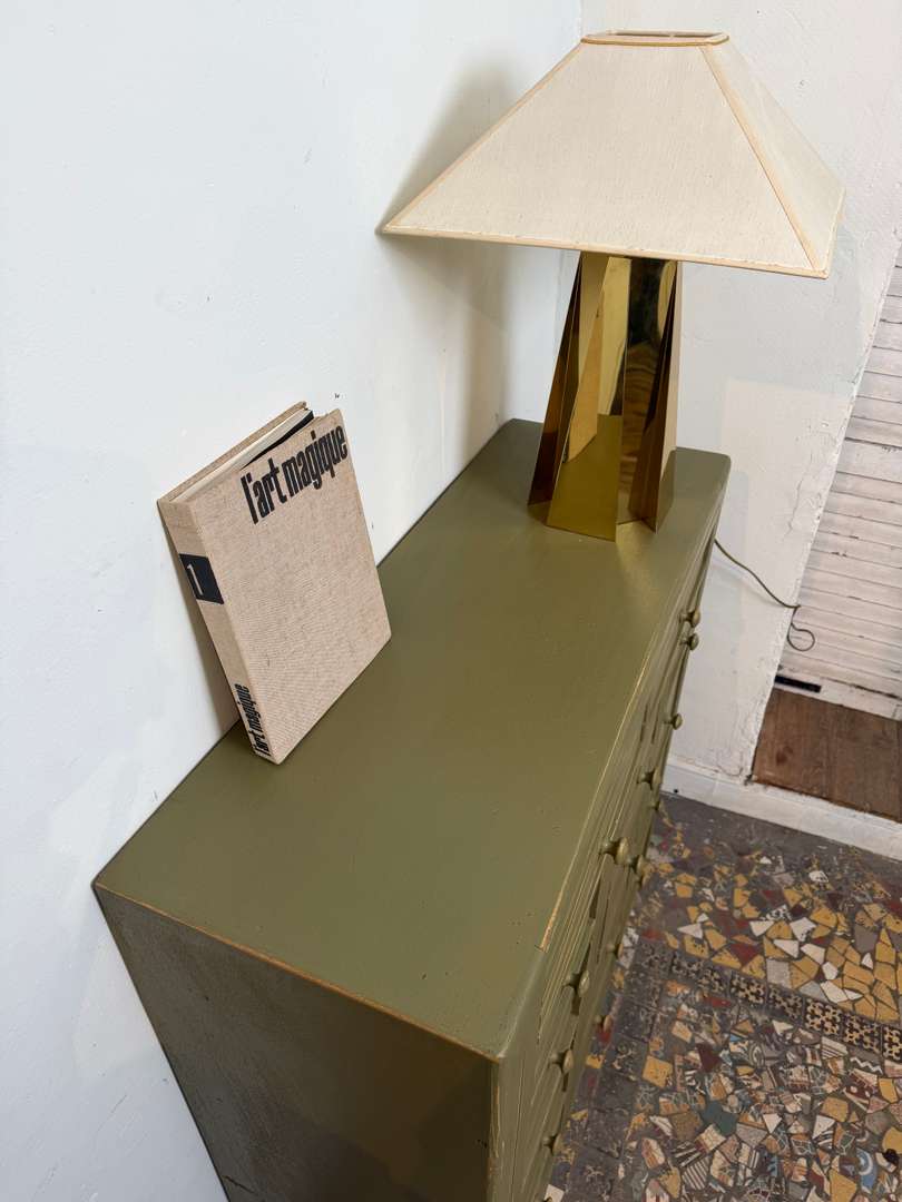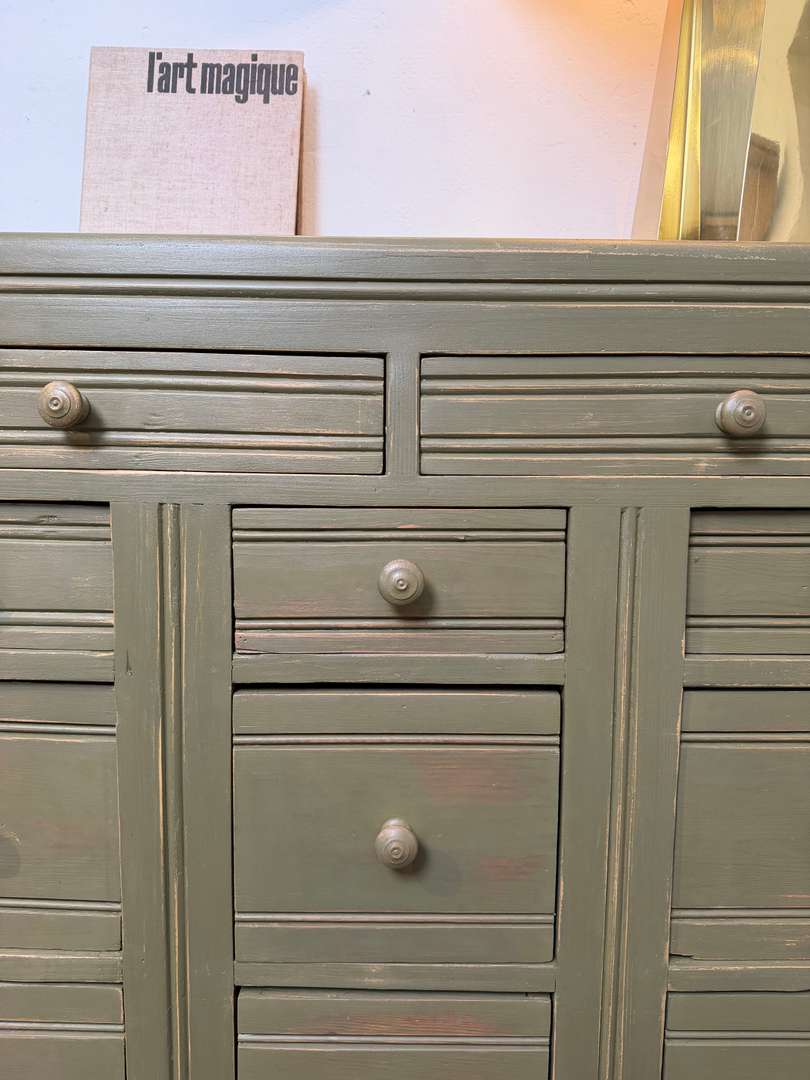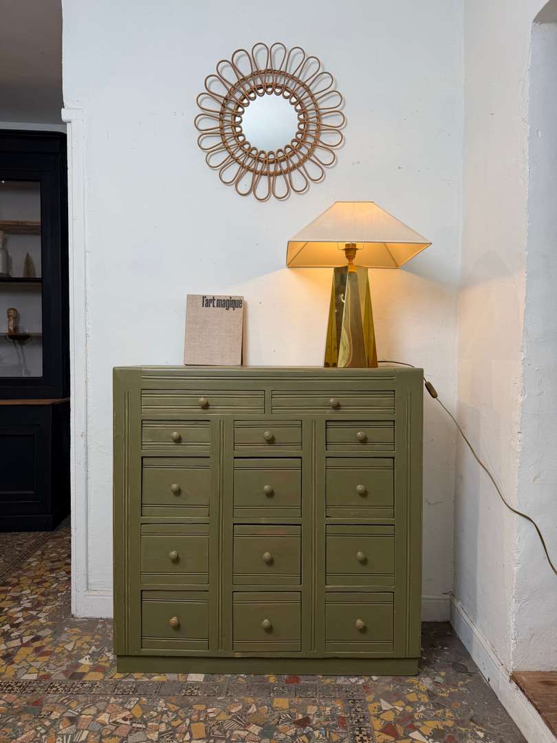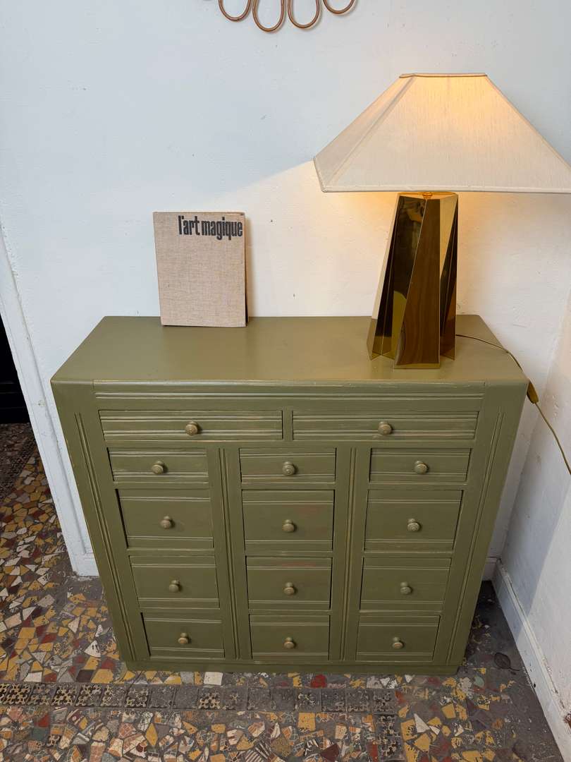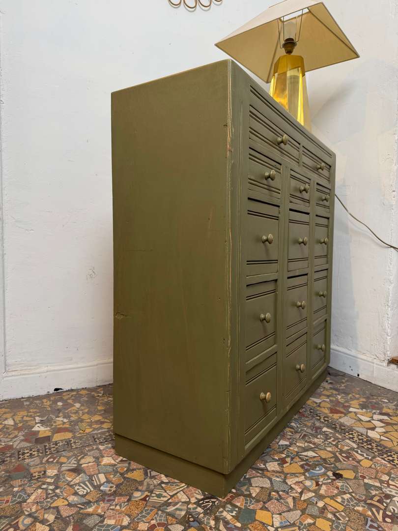 Meuble d’atelier à tiroirs – Années 50 550 € Ajouter au panierMeuble d’atelier des années 50, en sapin. Peint en vert kaki, il est entièrement fonctionnel avec ses nombreux tiroirs. Un meuble pratique, idéal pour le rangement. #meubledatelier #annees50 #brocanteDimensionsLargeur102 cmProfondeur37.5 cmHauteur104 cmDimensions des 2 tiroirs37 x 29pr x 6 cmDimensions des 3 tiroirs19,5 x 33pr x 8,5 cmDimensions des 9 tiroirs19,5 x 33pr x 18 cmRenseignementsRéférence2603004