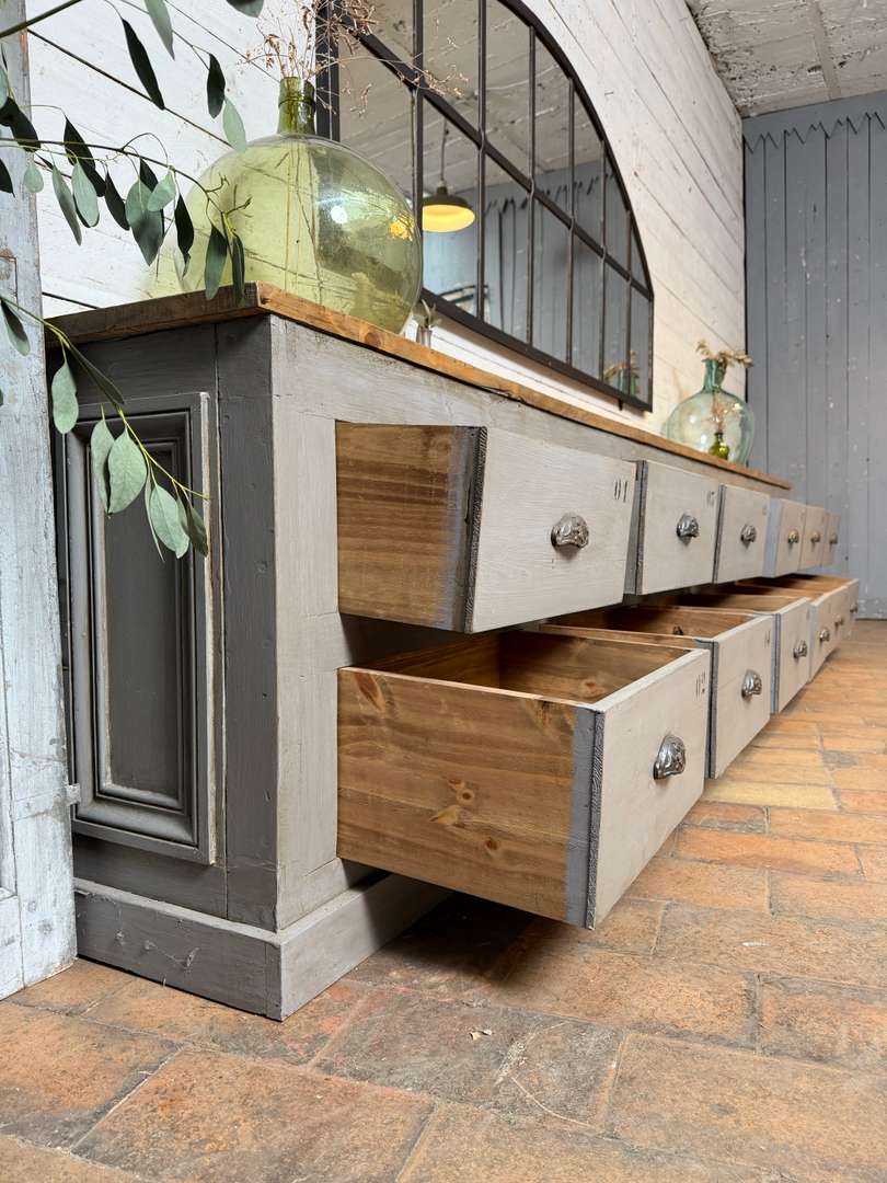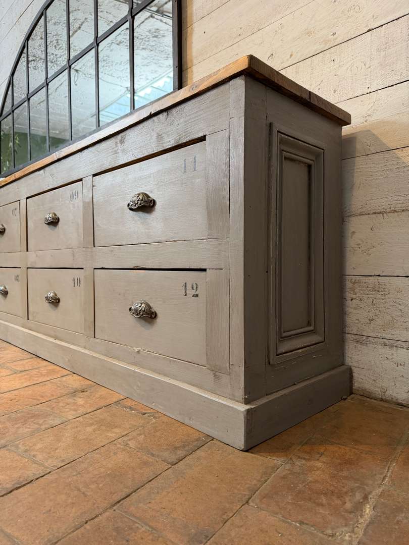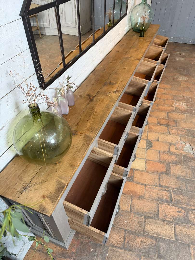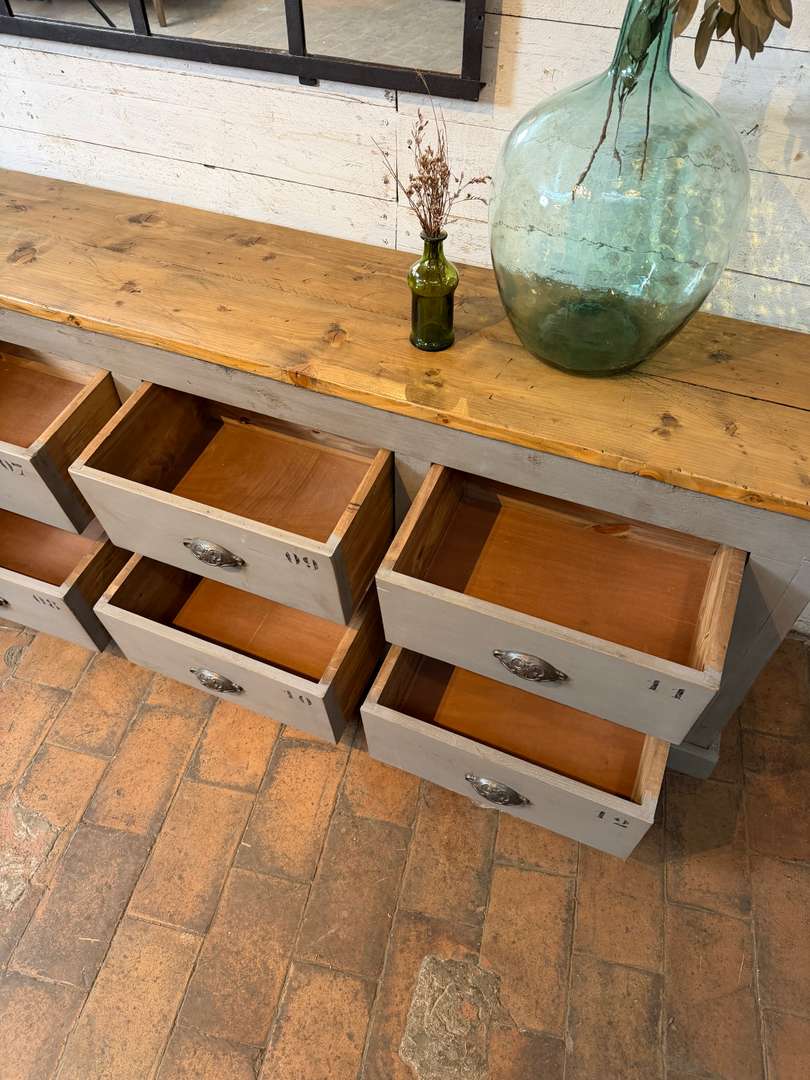 Ancien meuble d’atelier en sapin, peint en gris, présentant une belle longueur. Il est composé de nombreux tiroirs numérotés, tous fonctionnels, offrant un rangement pratique et structuré. Un meuble idéal dans un intérieur de style atelier, cuisine ou boutique.