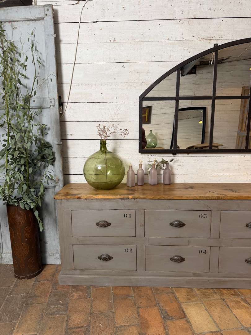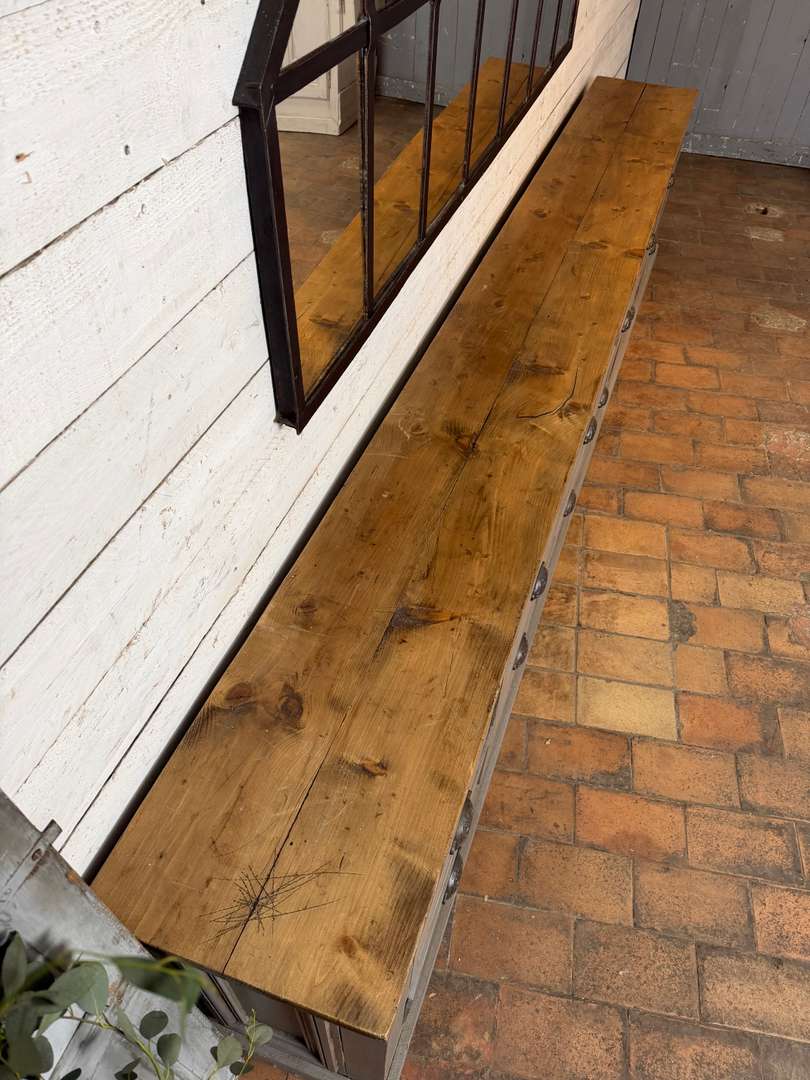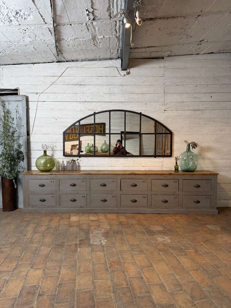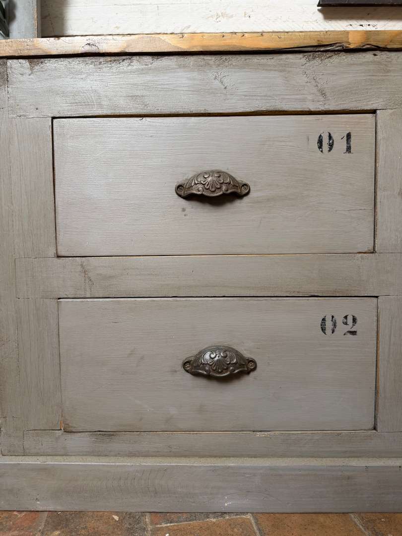 Ancien meuble d’atelier en sapin, peint en gris, présentant une belle longueur. Il est composé de nombreux tiroirs numérotés, tous fonctionnels, offrant un rangement pratique et structuré. Un meuble idéal dans un intérieur de style atelier, cuisine ou boutique.