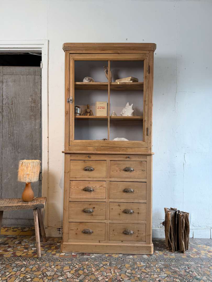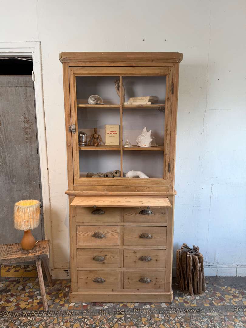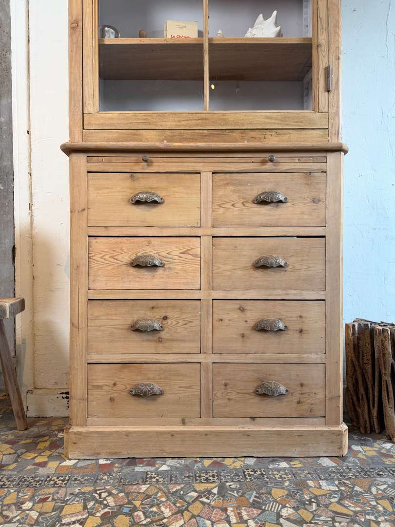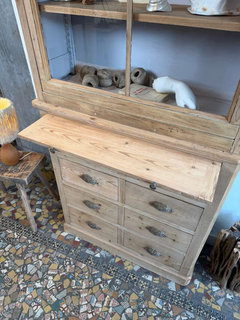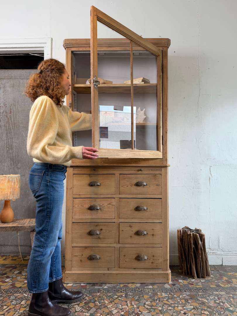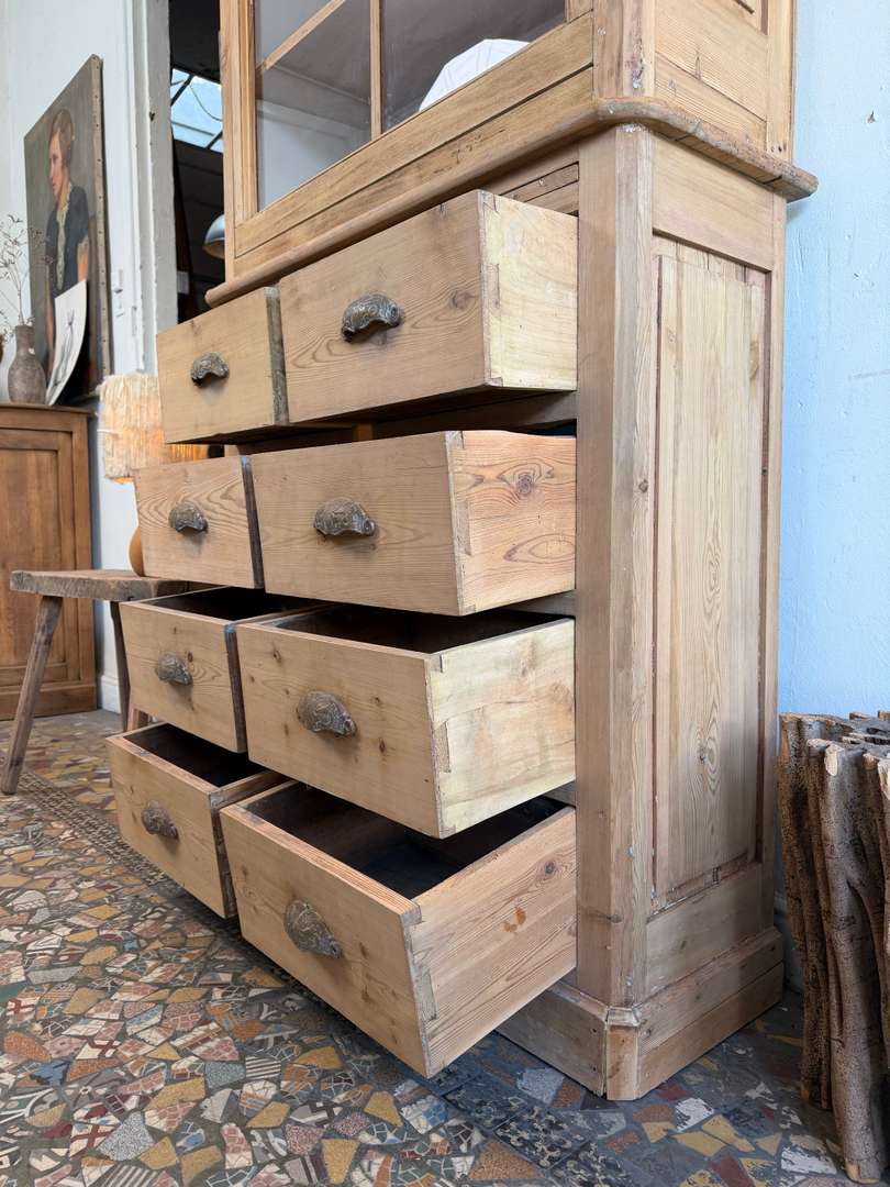 Cet ancien meuble de commerce en sapin date du 19ᵉ siècle. Il se compose de deux parties superposées.
