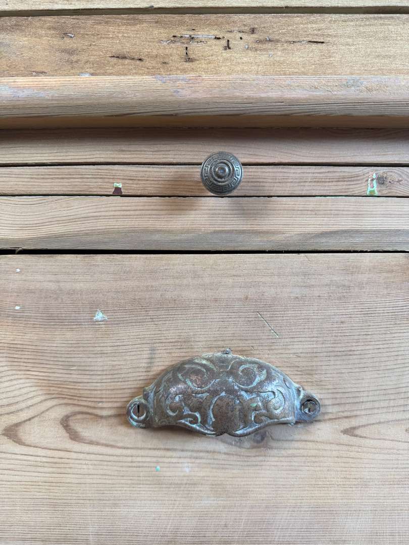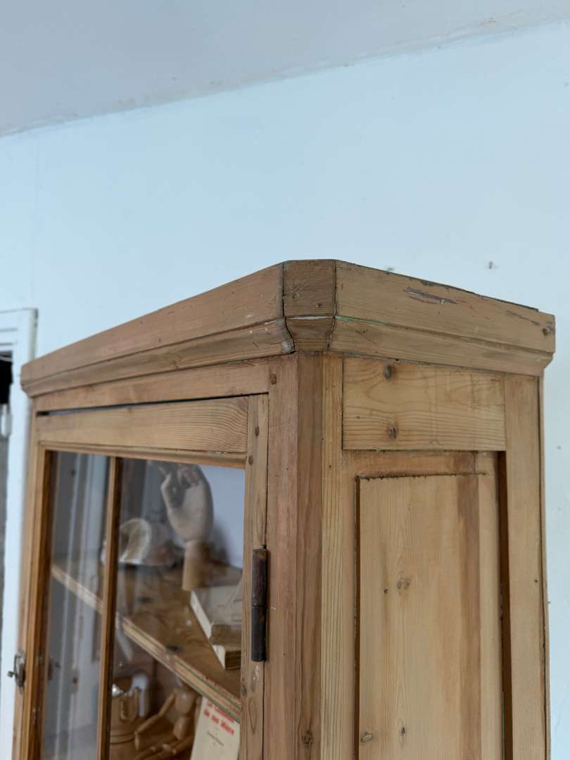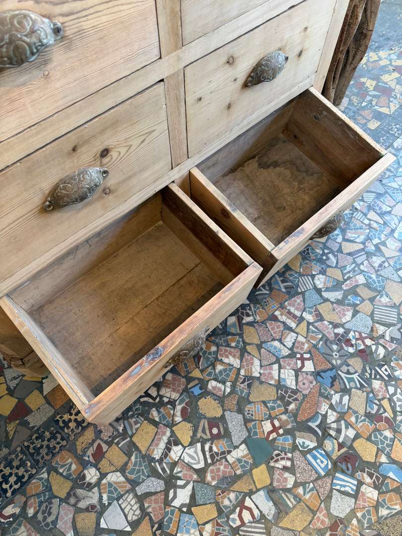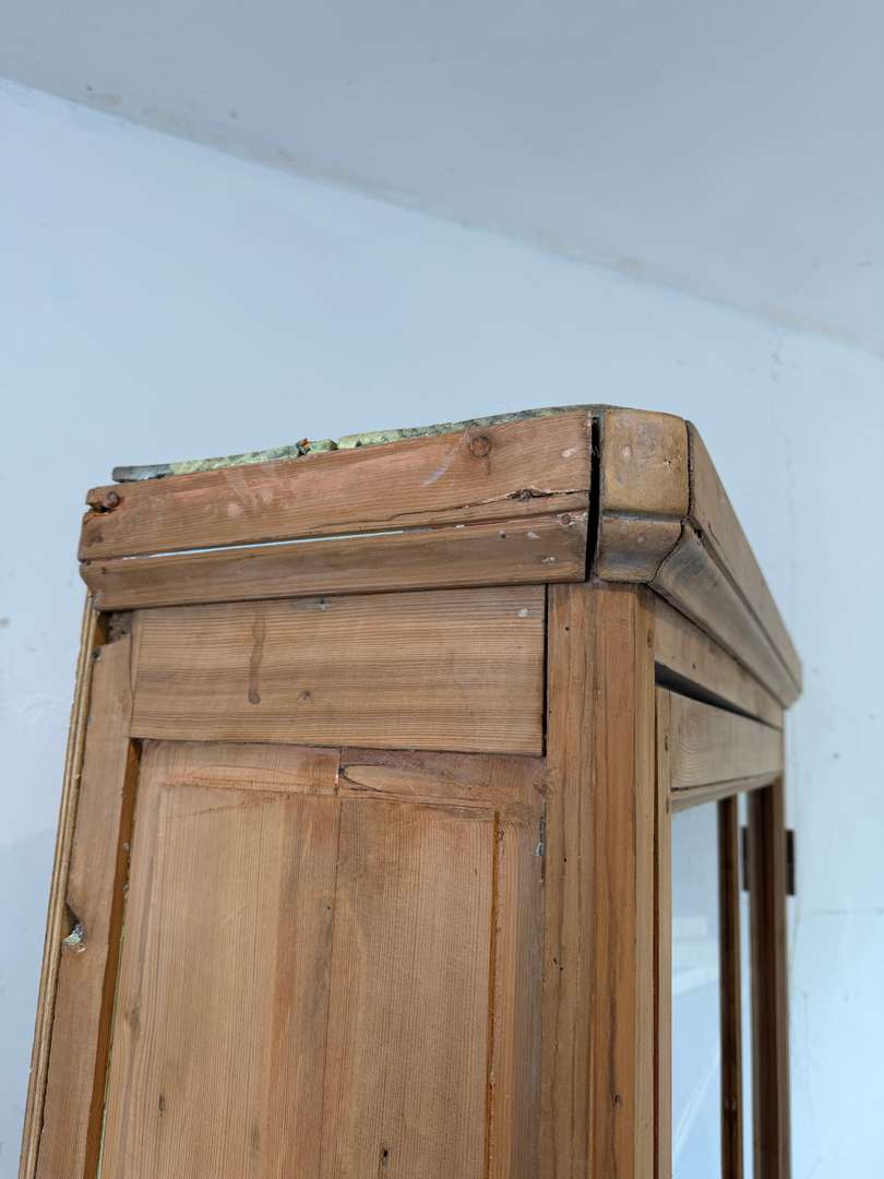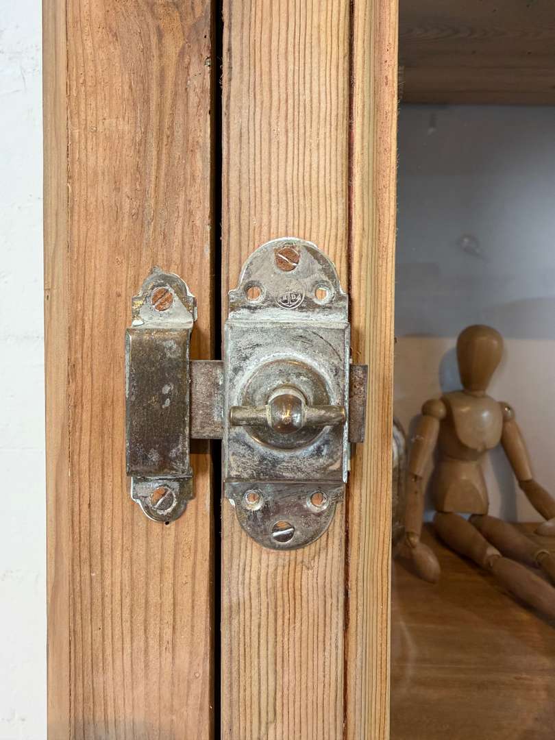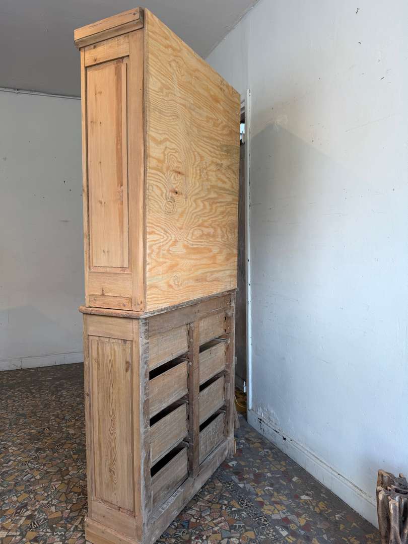 Cet ancien meuble de commerce en sapin date du 19ᵉ siècle. Il se compose de deux parties superposées.
