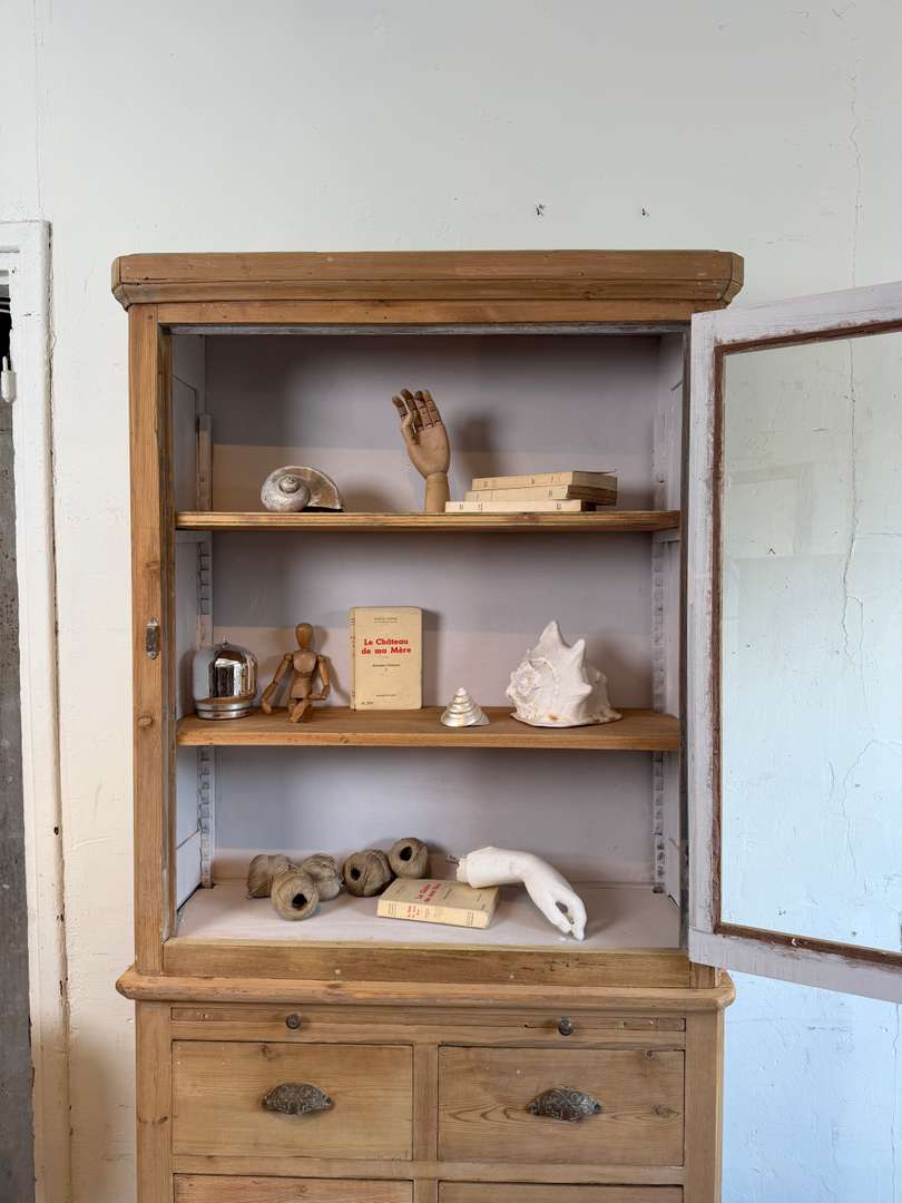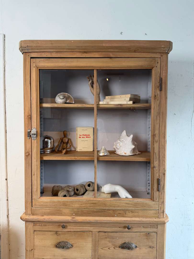 La partie haute est une vitrine à façade vitrée, avec étagères intérieures et fond peint en gris clair. Elle ferme à l’aide d’un verrou. La partie basse présente une tirette et plusieurs tiroirs montés en queues d’aronde, tous fonctionnels, avec leurs poignées d’origine.