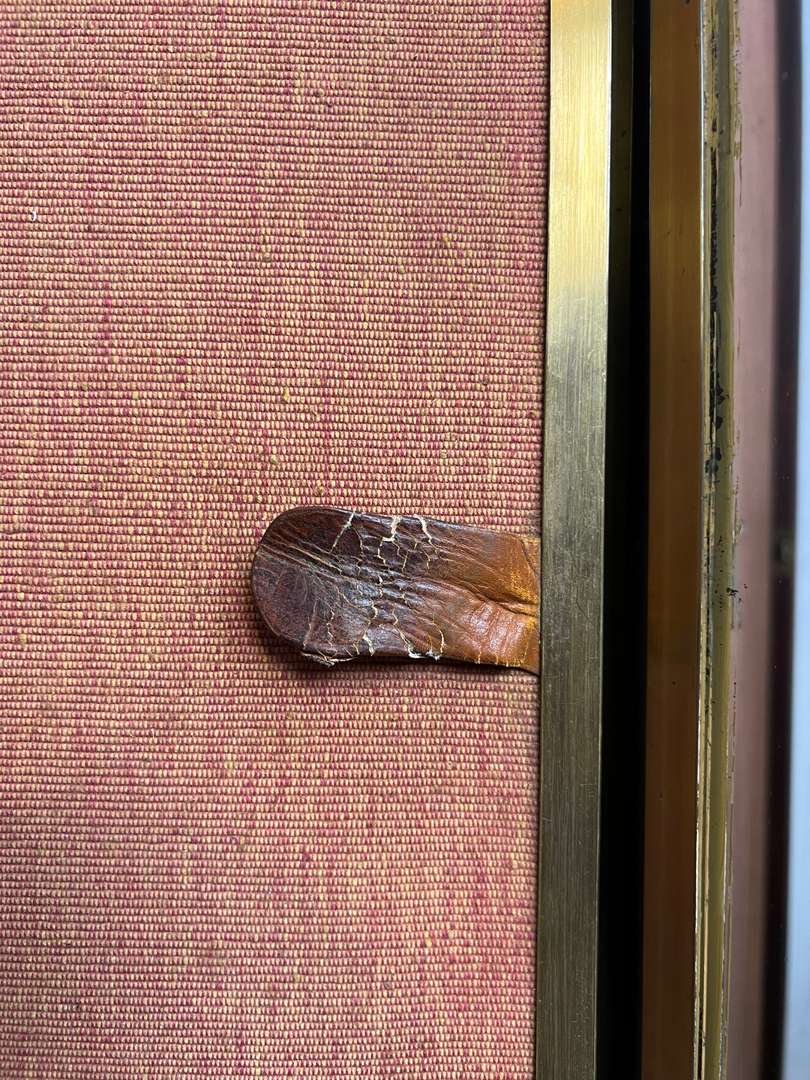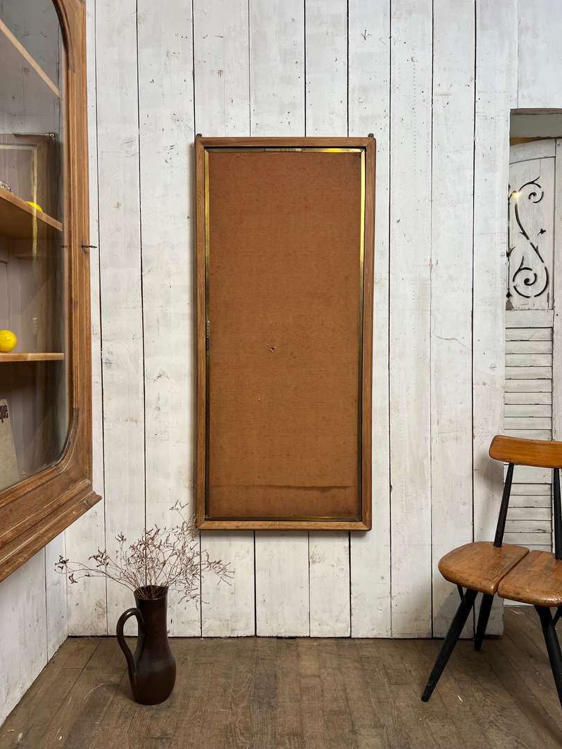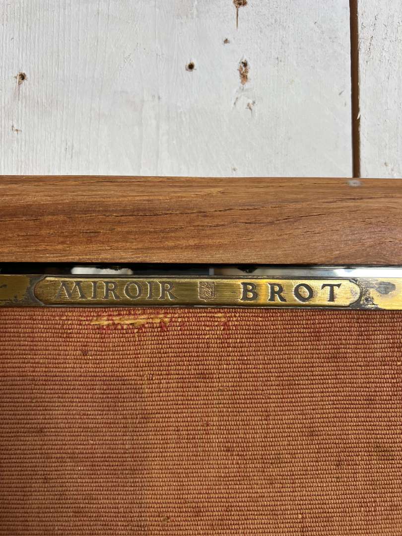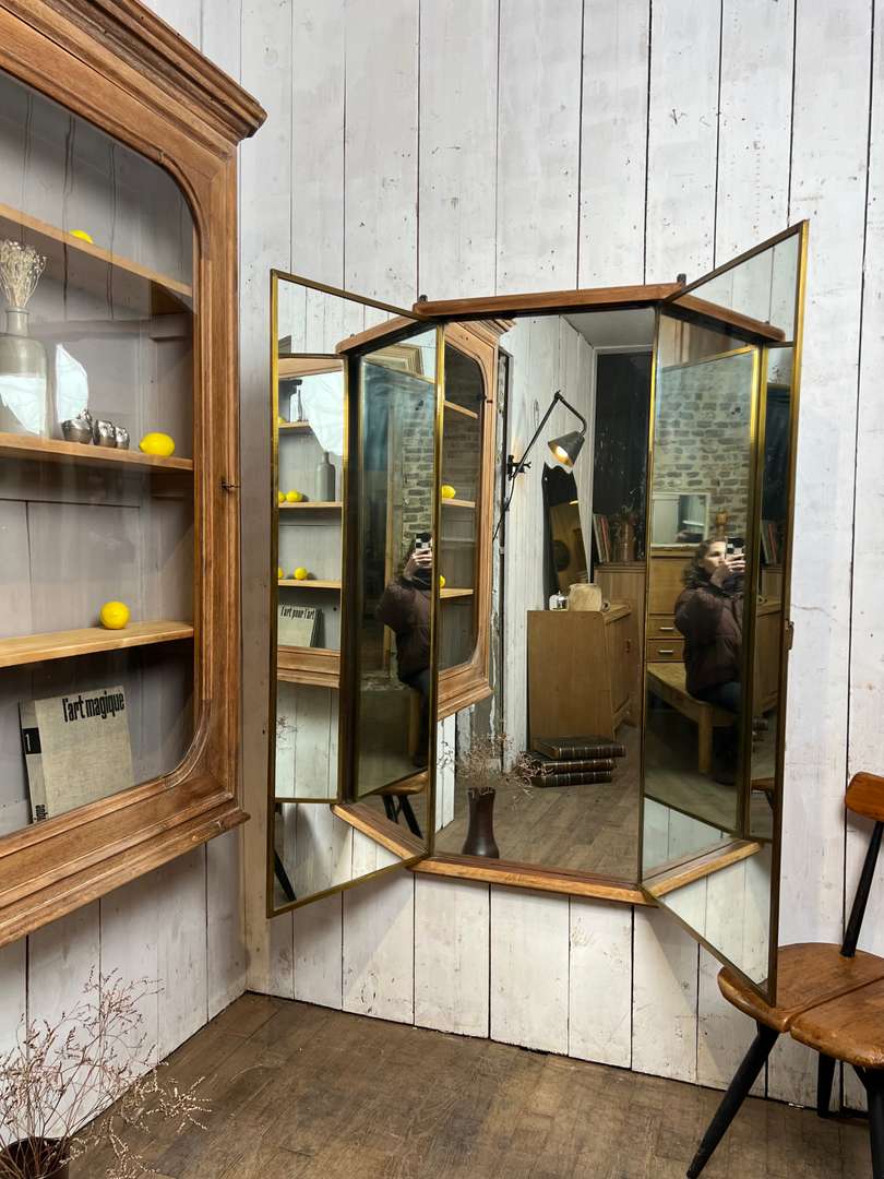 Miroir triptyque des années 1920 de la maison Brot. L’encadrement est en chêne, chaque miroir est souligné d’un contour en laiton gravé « miroir Brot ». Le dos des miroirs a son tissus d’époque. Les miroirs sont en très bon état. Ce modèle est conçu pour être fixé au mur.
