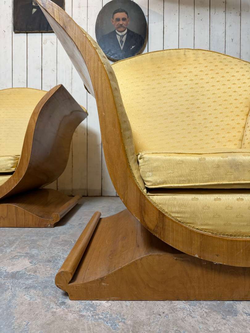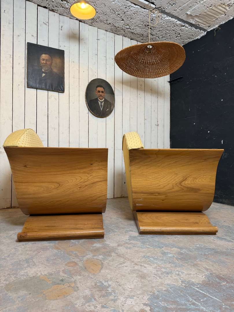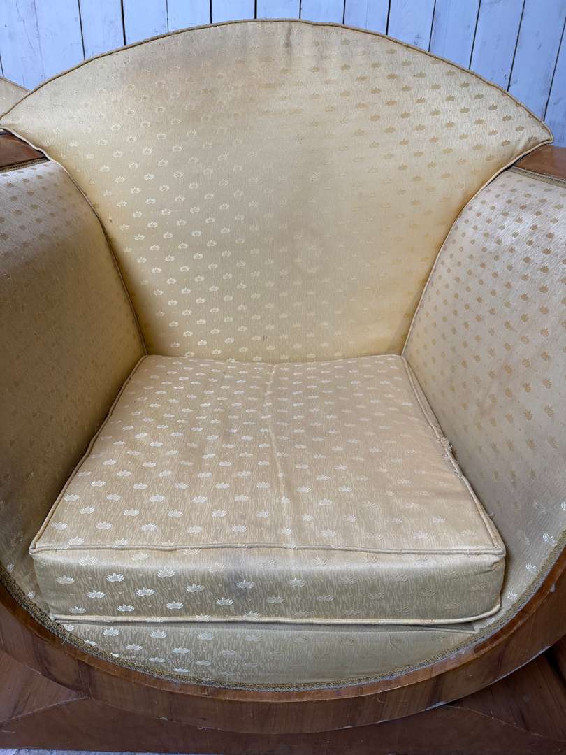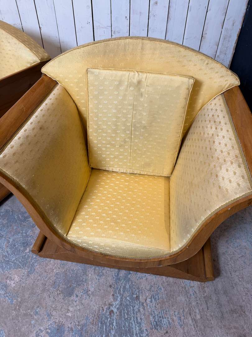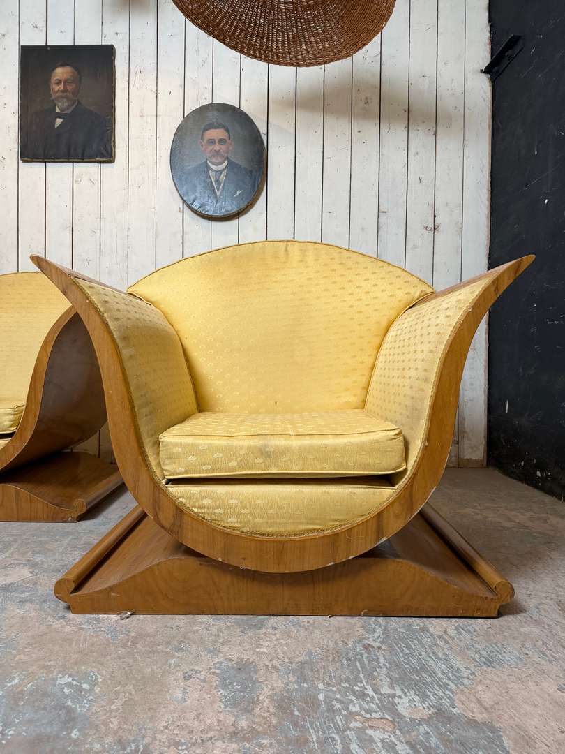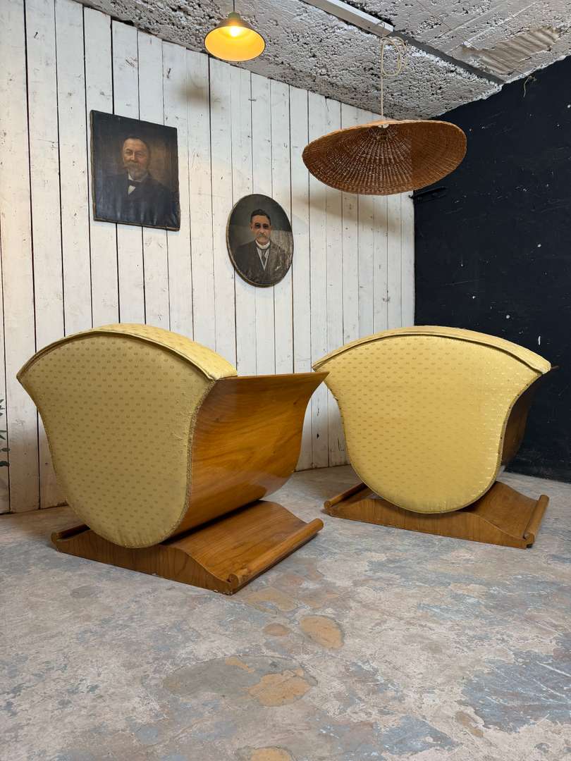 Paire de fauteuils Art Déco 1500 €le lot de 2 pièces Ajouter au panierPaire de fauteuils Art Déco aux lignes élégantes et enveloppantes. Structure en bois avec placage en noyer, à recouvrir selon vos envies. #artdeco #fauteuilvintage #fauteuilarecouvrir #mobilierancien #brocanteDimensionsLargeur105 cmProfondeur84 cmHauteur95 cmHauteur d'assise39 cmProfondeur d'assise58 cmRenseignementsRéférence2602016