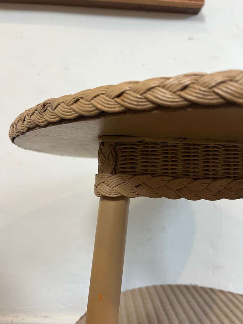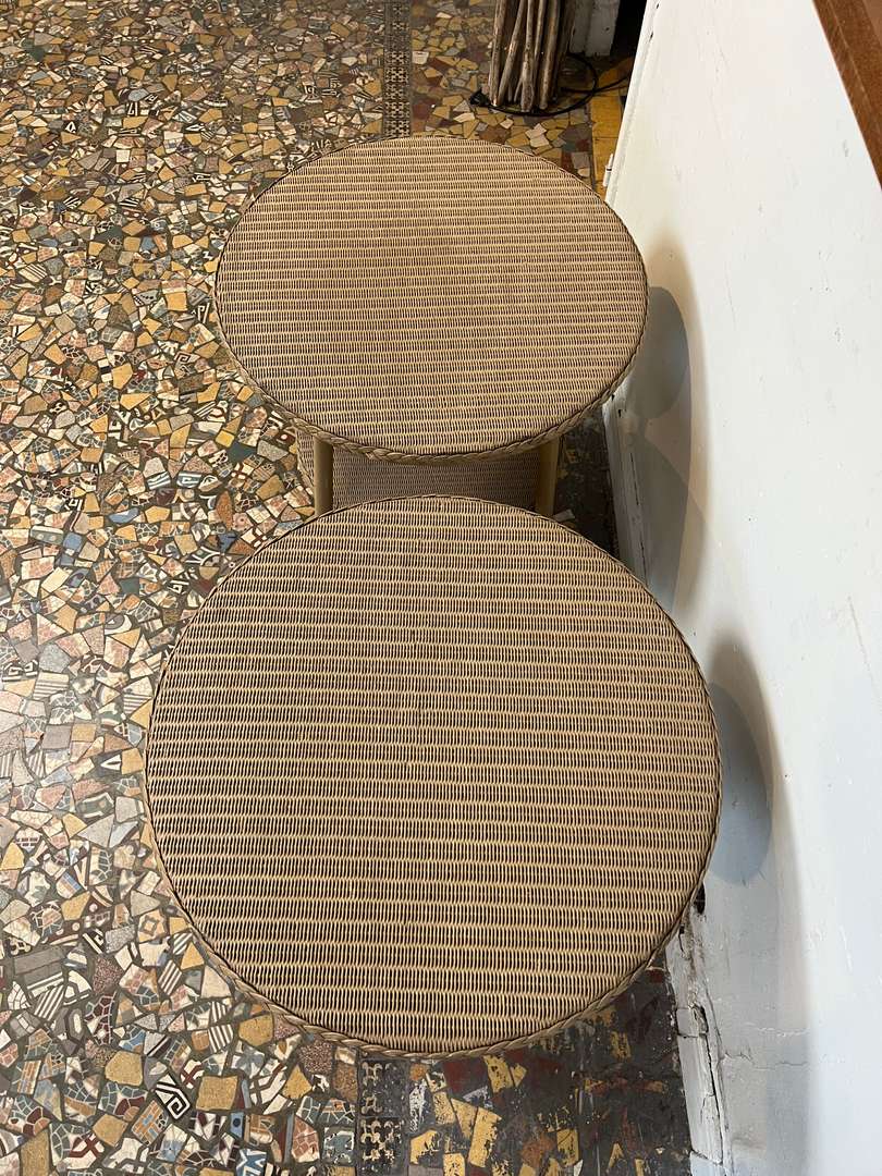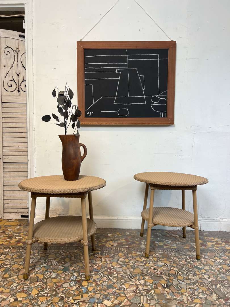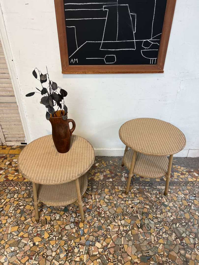 Paire de petites tables des années 80 en résine tressée, ton sable. Elles sont légères, pratiques et peuvent être utilisées aussi bien en intérieur qu’en extérieur. Chaque table dispose d’un plateau inférieur pour poser des objets supplémentaires. Bel état général, quelques petites traces d’usage.