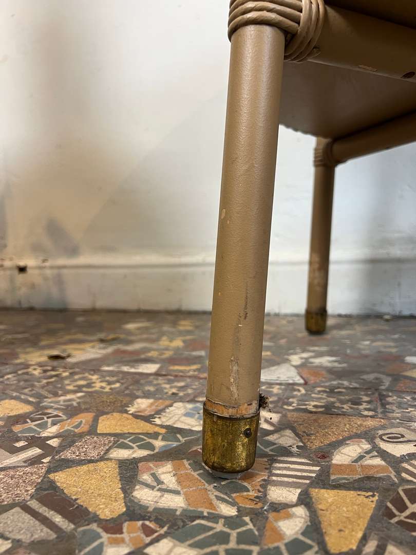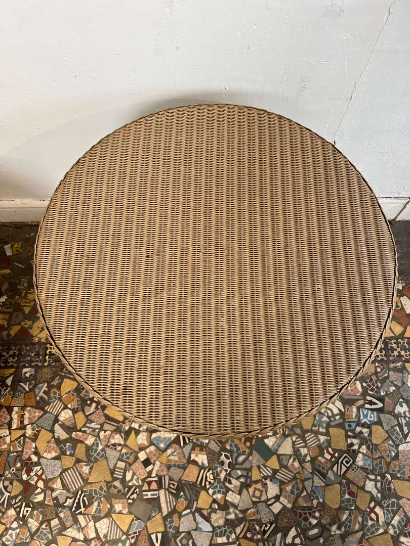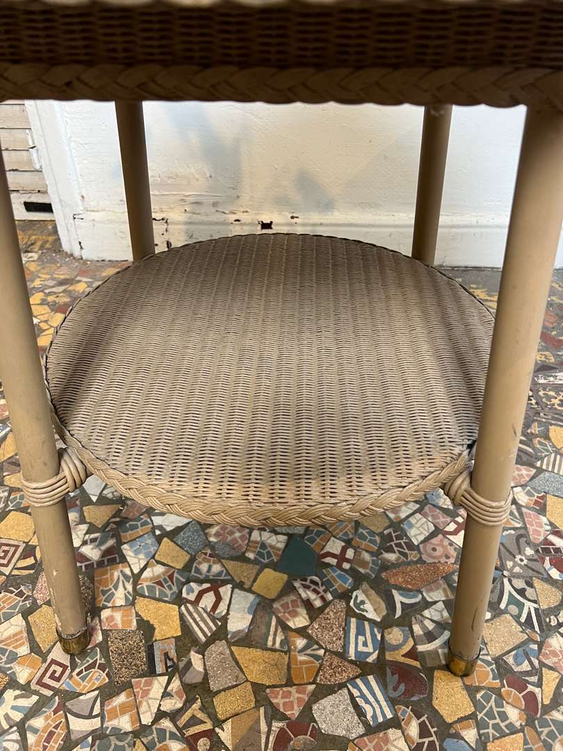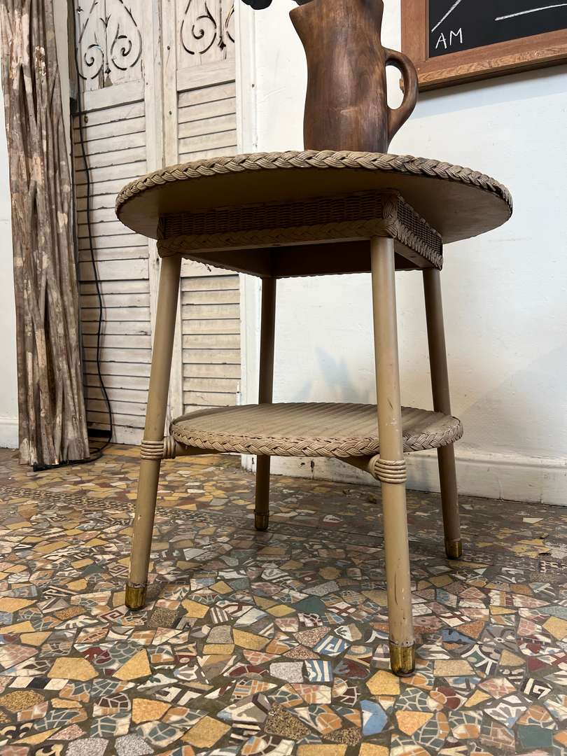 Paire de petites tables des années 80 en résine tressée, ton sable. Elles sont légères, pratiques et peuvent être utilisées aussi bien en intérieur qu’en extérieur. Chaque table dispose d’un plateau inférieur pour poser des objets supplémentaires. Bel état général, quelques petites traces d’usage.